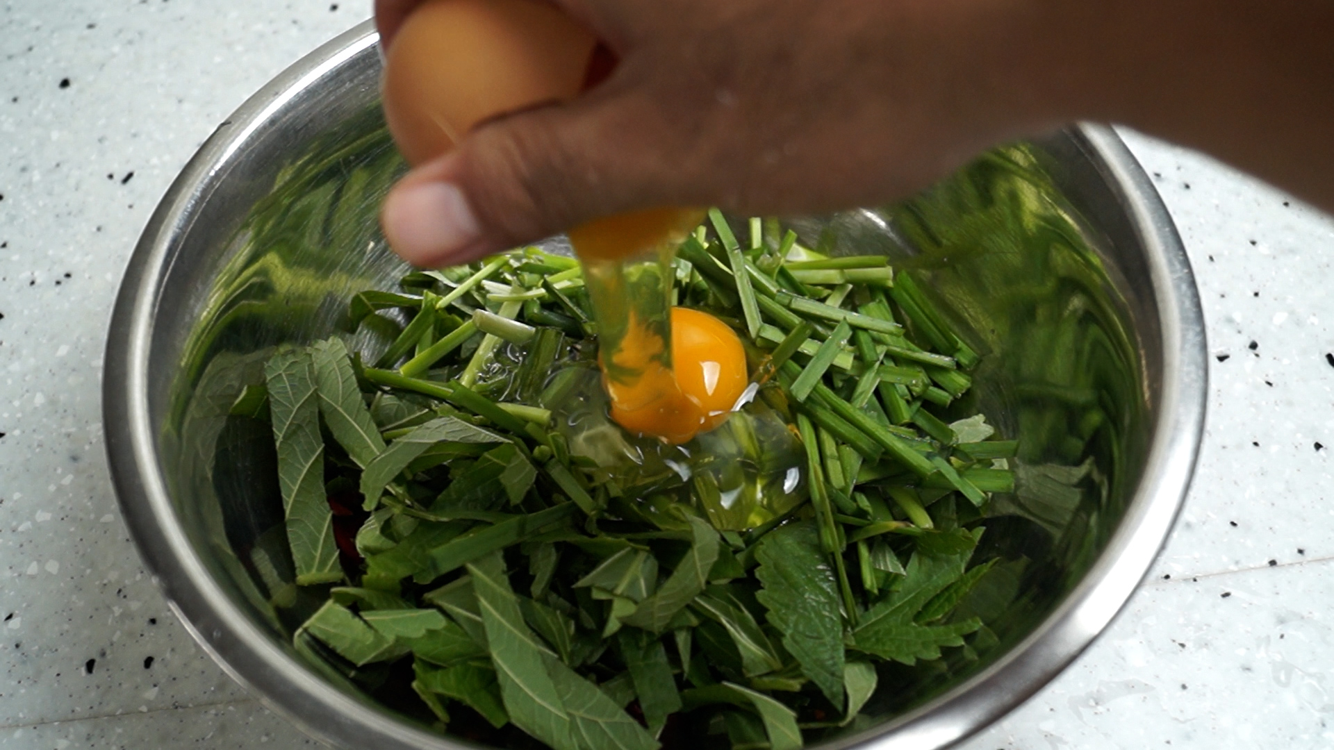7. 썬 당면에 깻잎과 부추 고추를 넣고 계란 2알을 까넣어주세요.