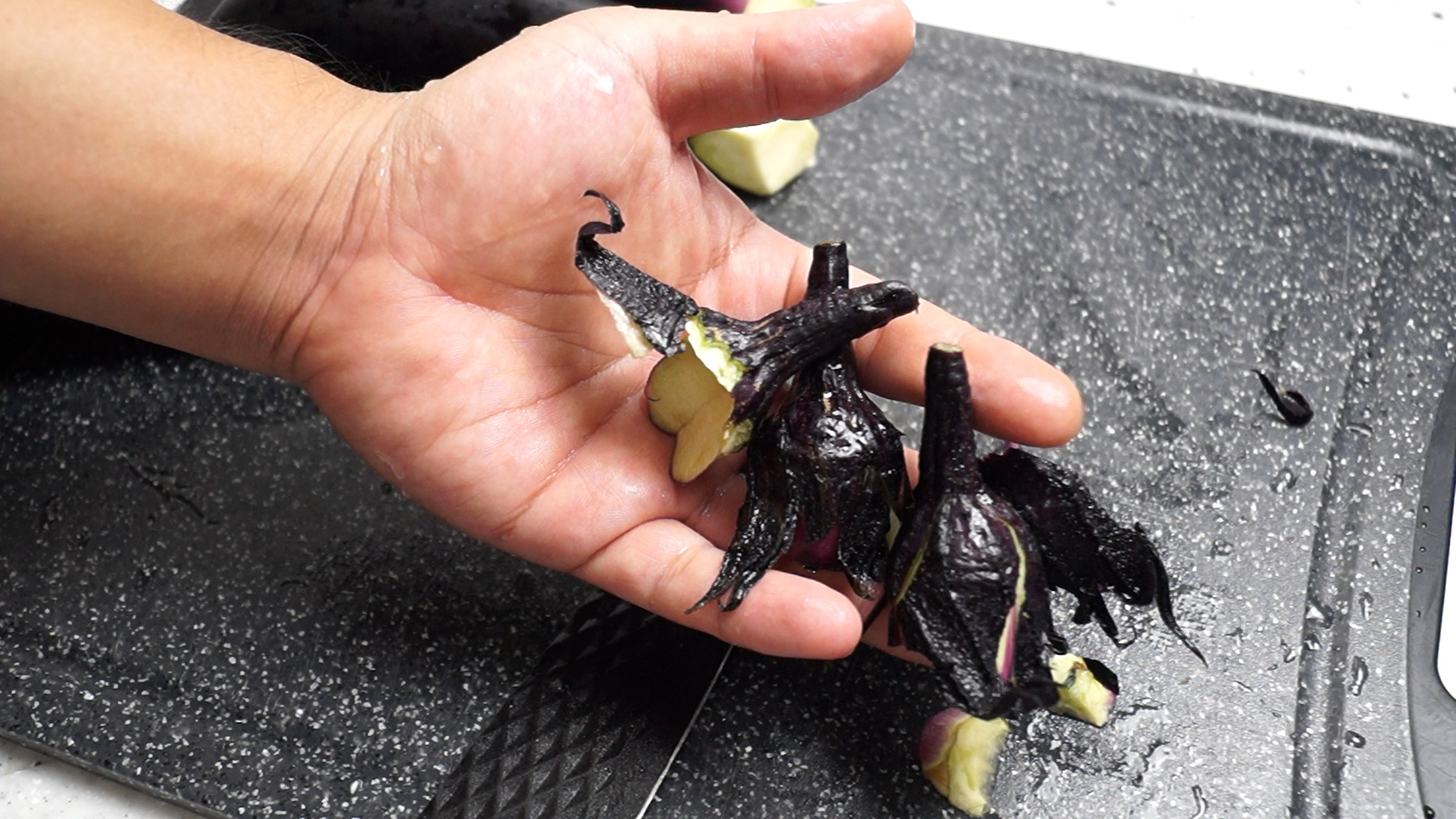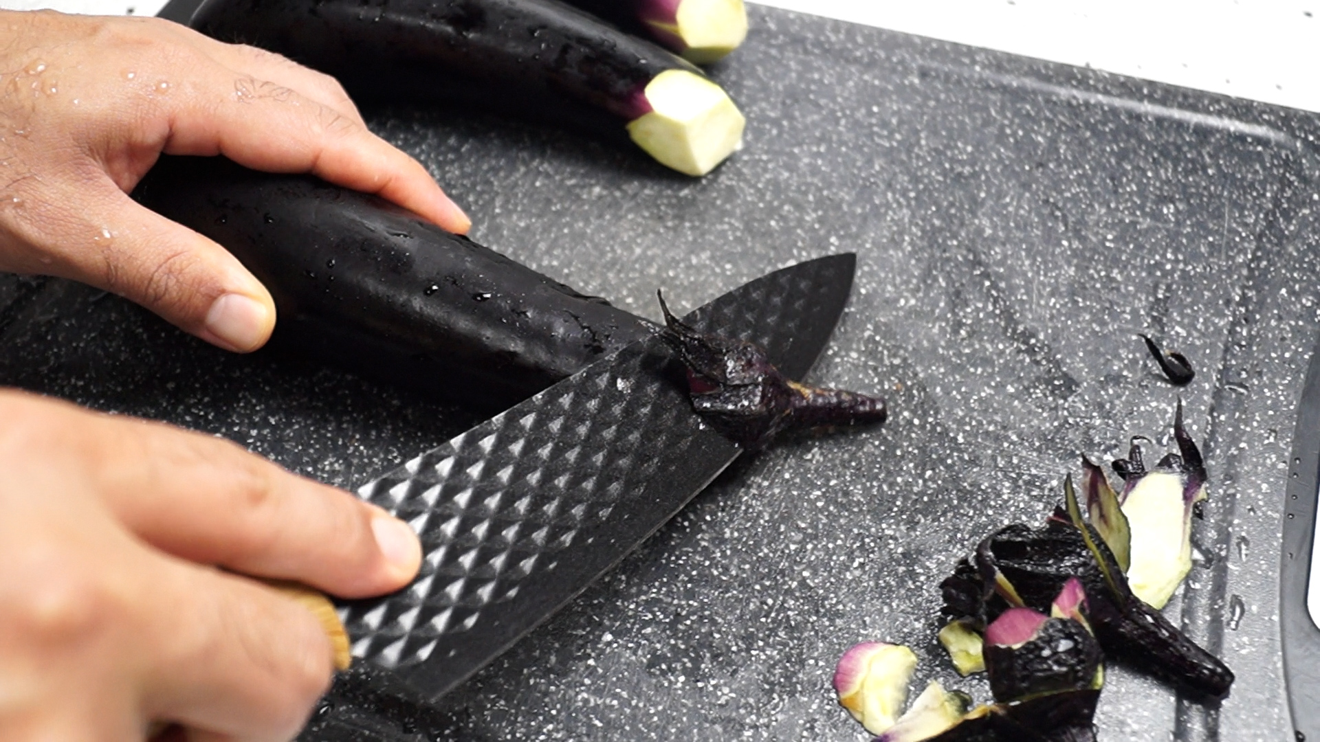 1. 깨끗히 씻은 가지의 꼭지 부분은 칼로 비껴썰어서 제거를 해주세요. 가지는 1개에 한뼘정도 되는 크기입니다. 너무 큰 가지는 조리에 불편함이 있으니 20~22cm 가지를 사용해주세요.