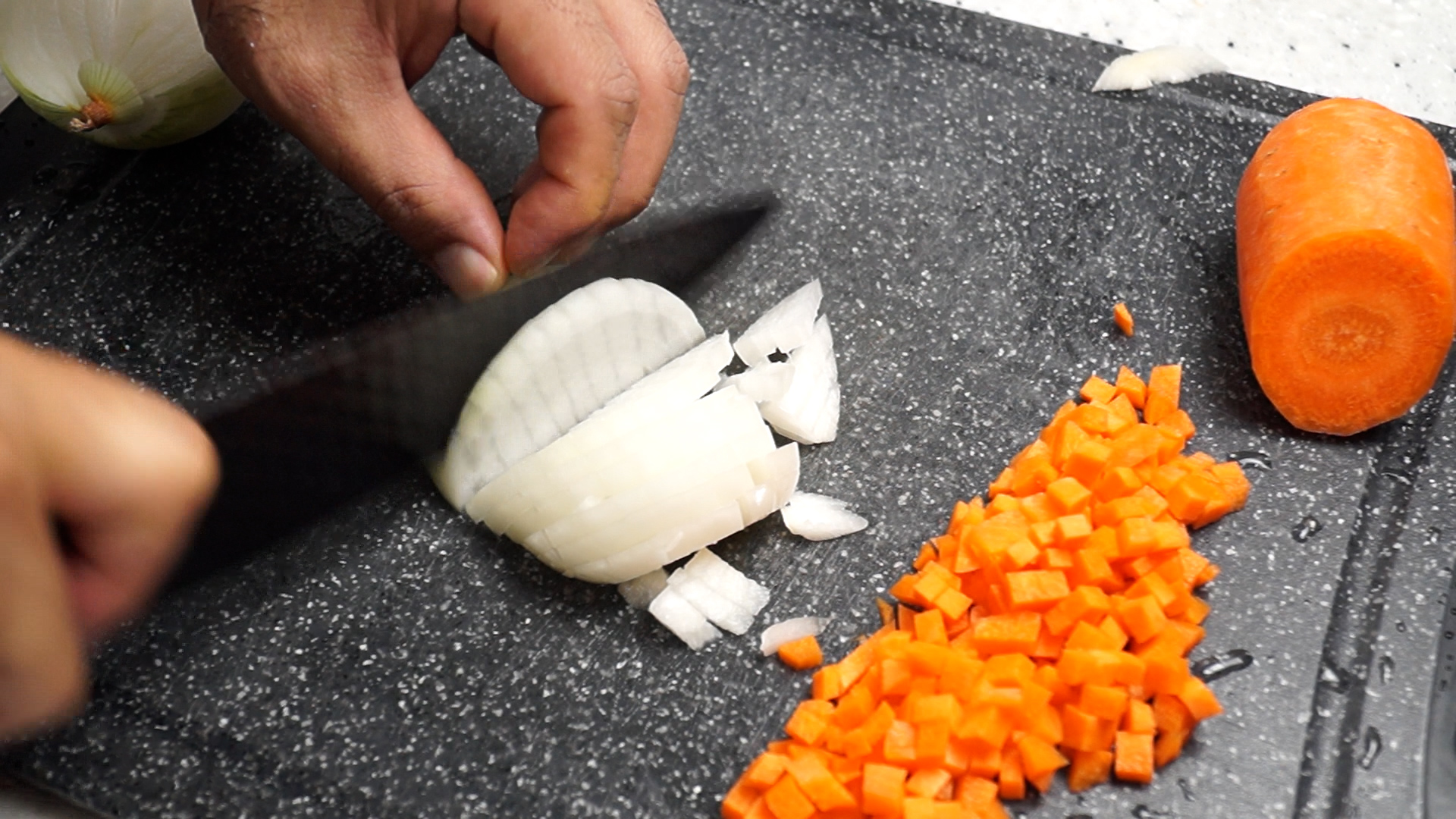 6. 양파도 당근과 비슷한 크기로 썰어주세요.