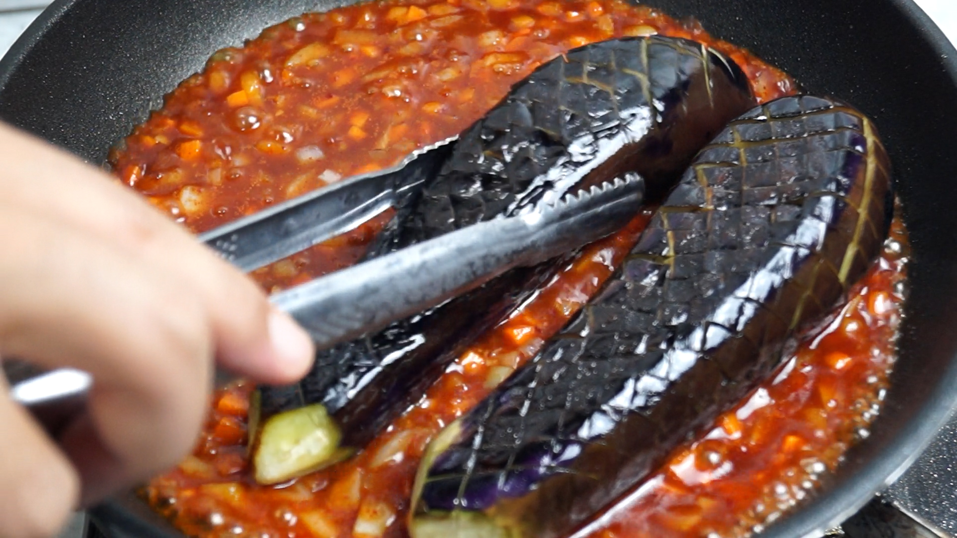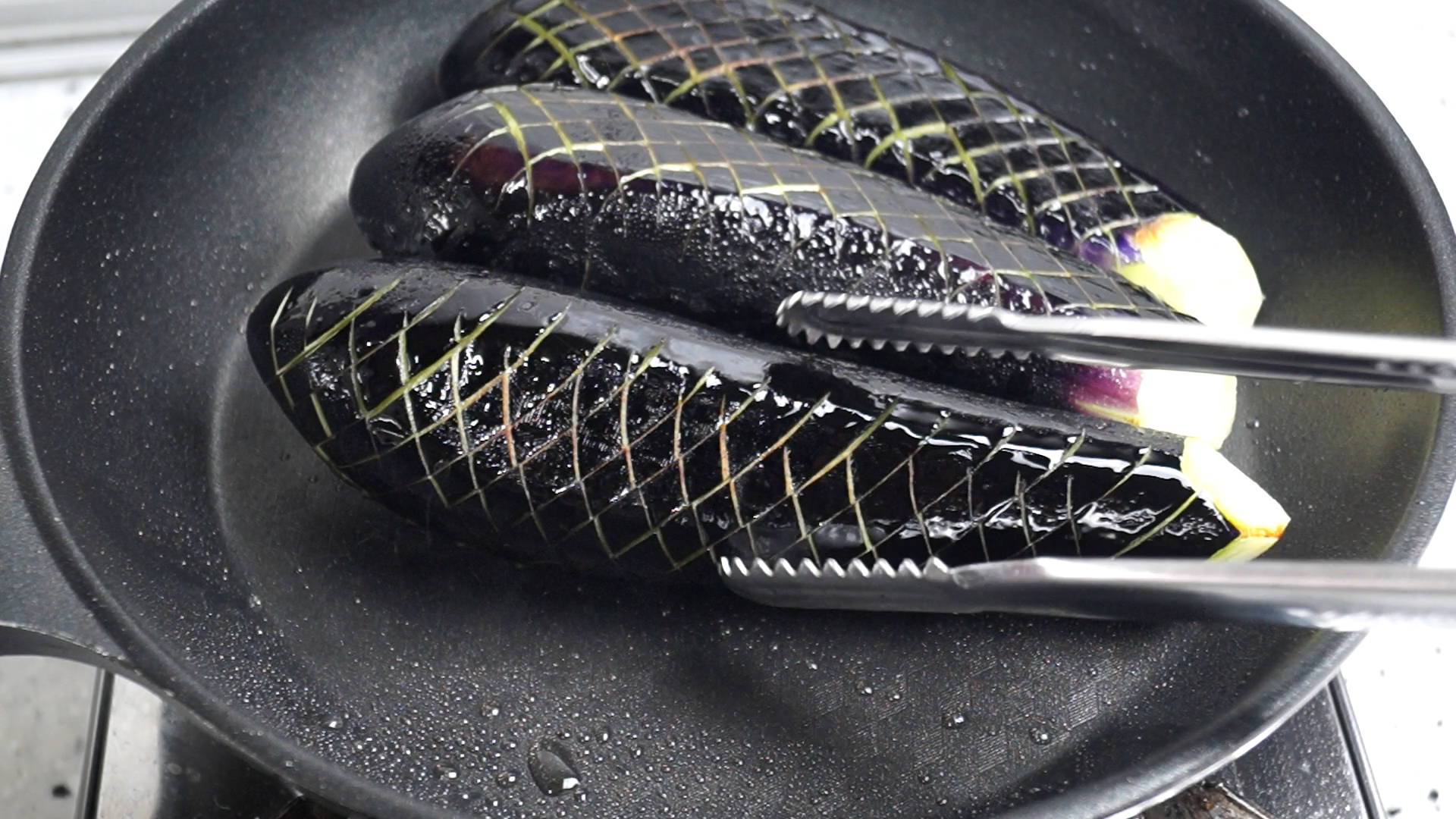 18. 식용유 2~3스푼 15g 넣고 중불로 달군 기름에 가지를 칼집낸 부분이 아래로 오게 올려주세요.
