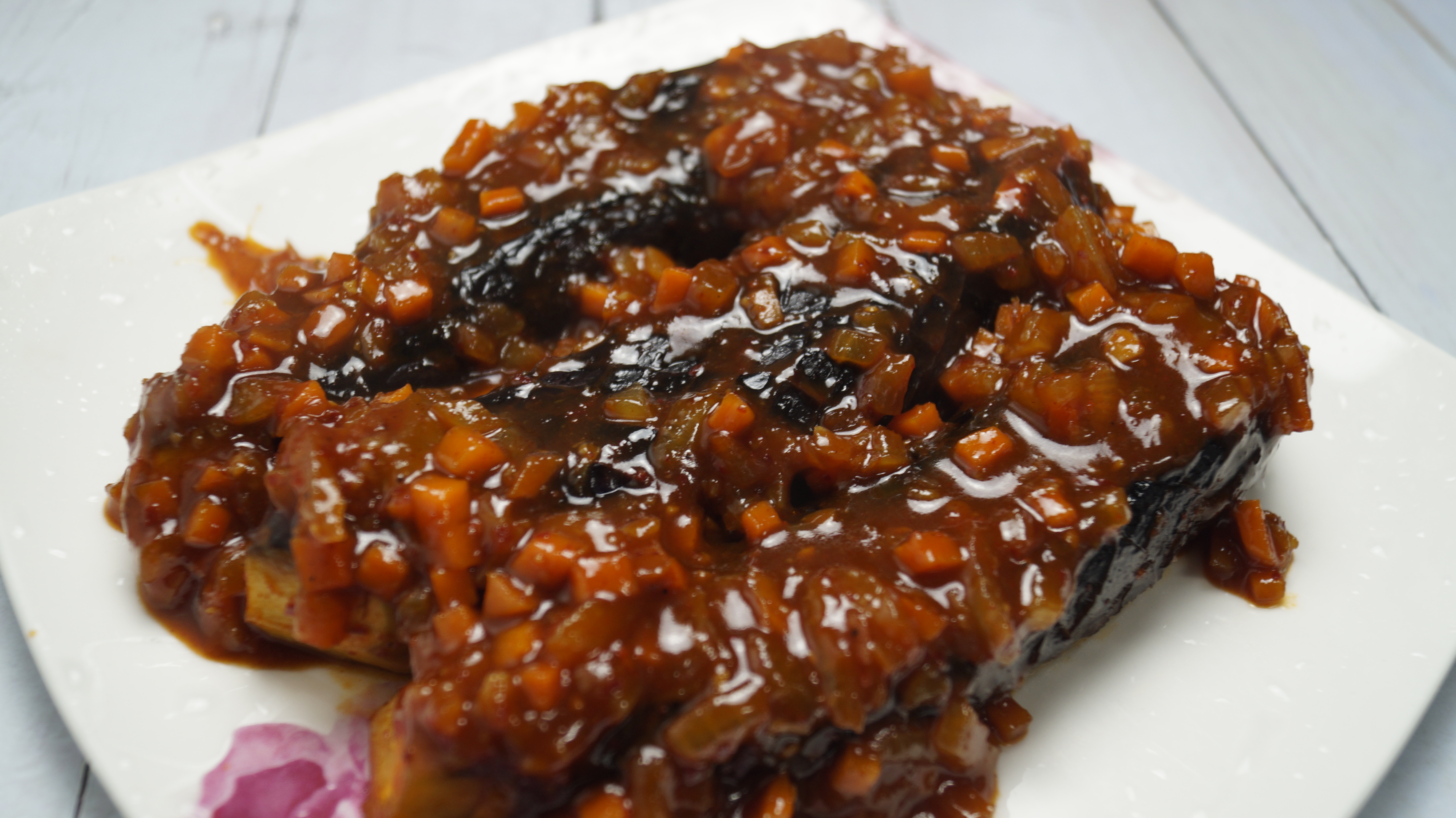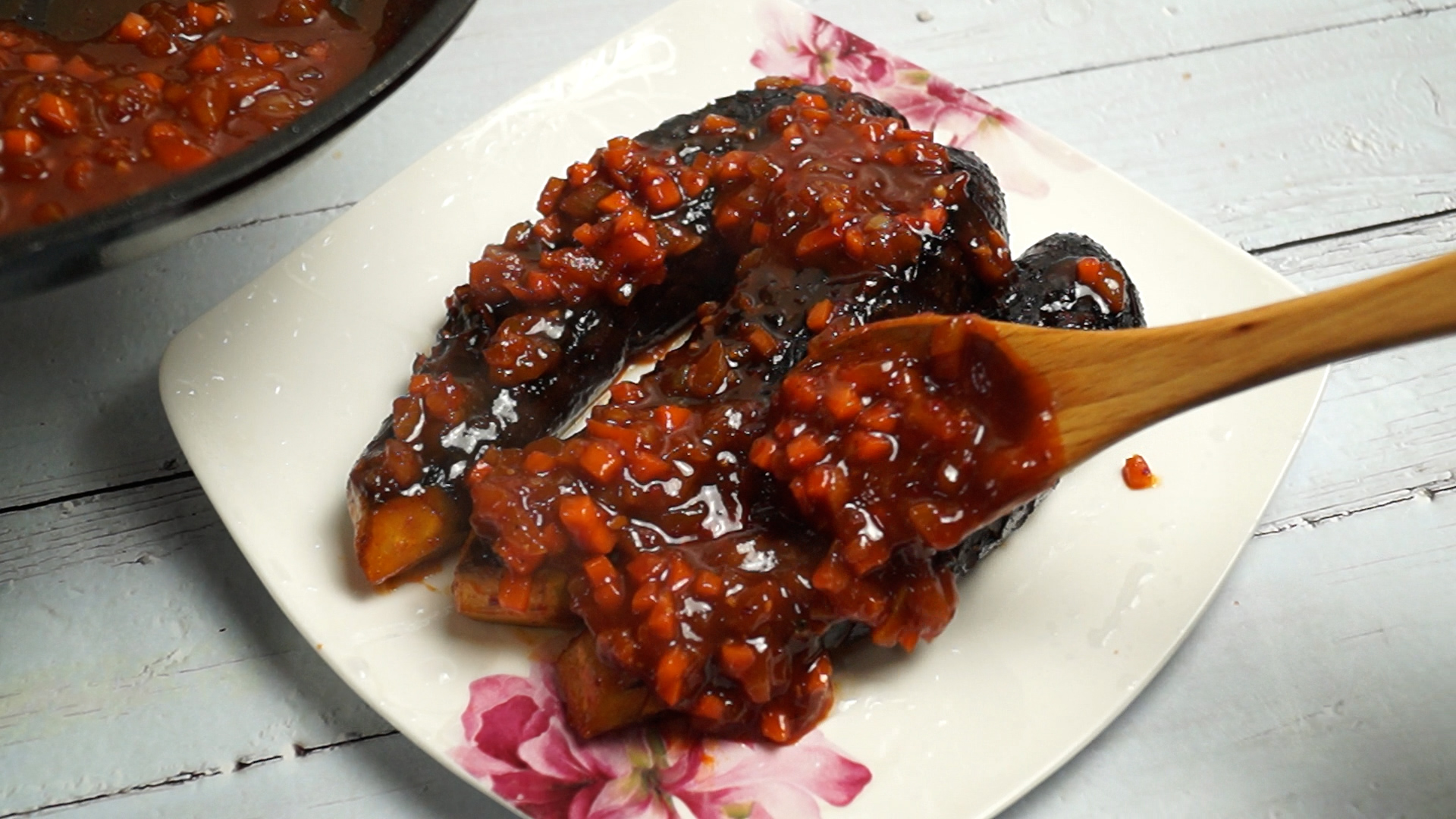26. 양념이 꾸덕하게 졸아들었으면 가지 안부서지게 조심해서 접시에 덜어주고 양념을 그위로 전부 끼얹어주세요