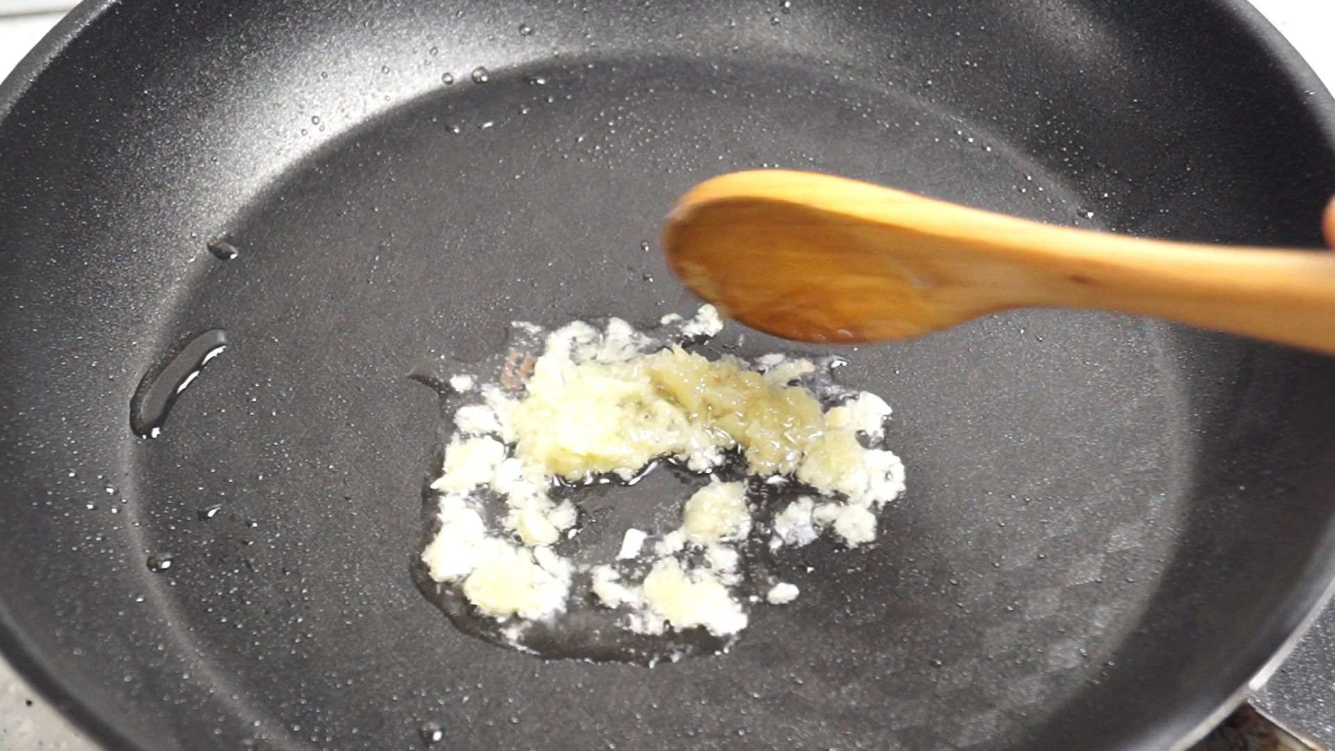22. 가지를 덜어낸 팬에 마늘과 식용유를 넣고 약불에 2분 정도 마늘기름을 내어주세요.