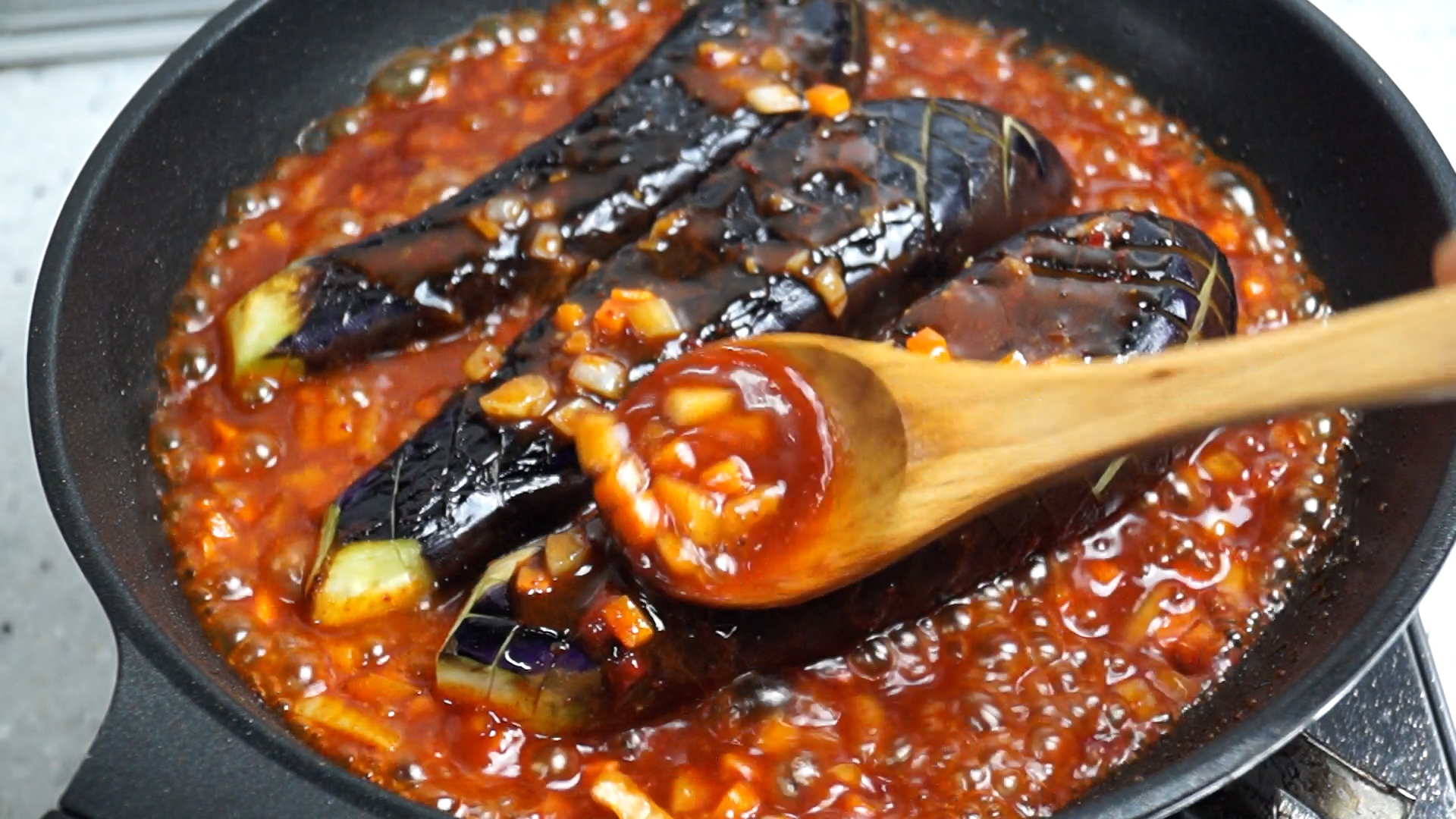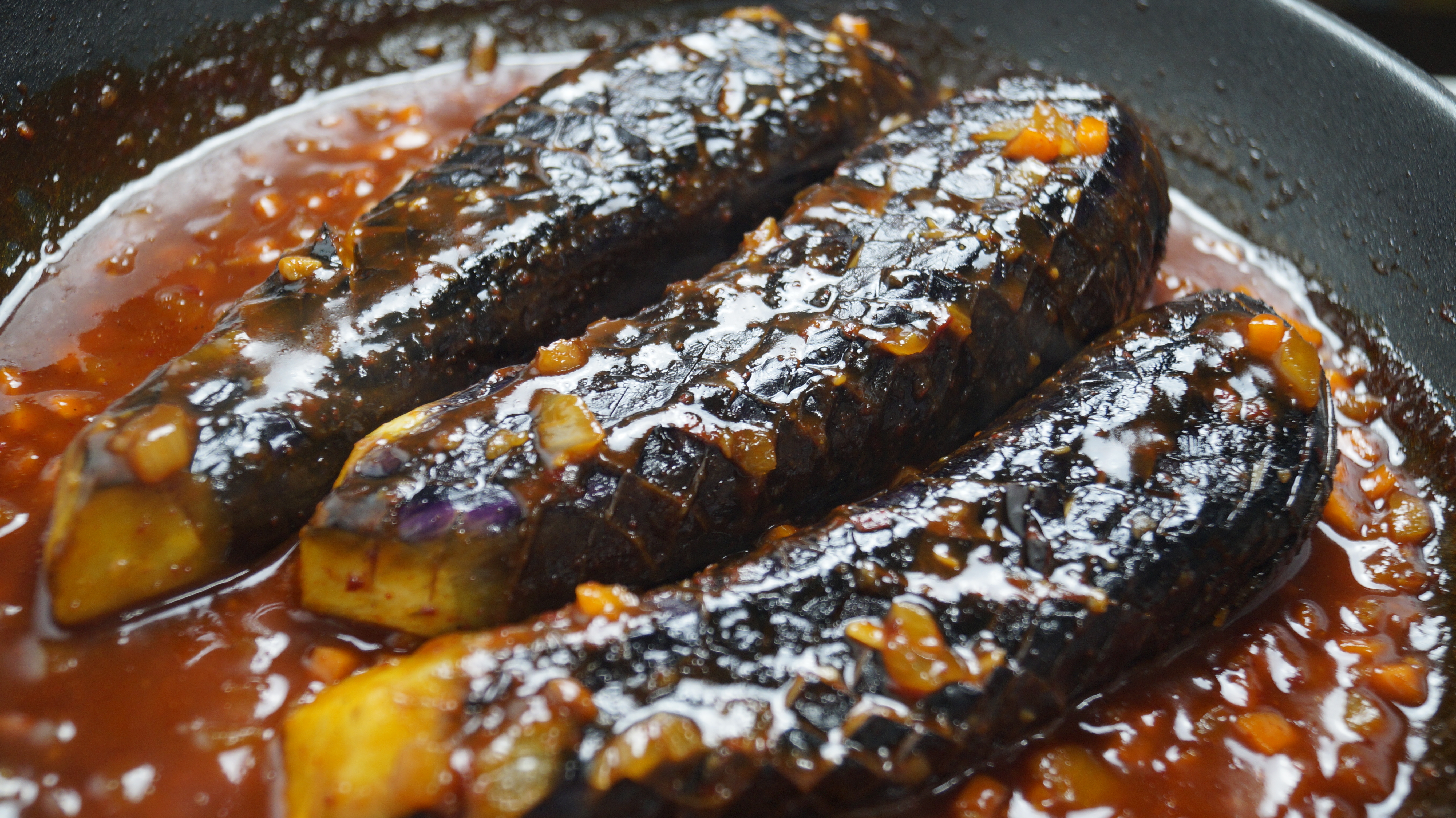 잘게 잘라 볶아버리면 자칫 흐물흐물 죽처럼 변해버리는 가지를 통으로 조리해보세요!