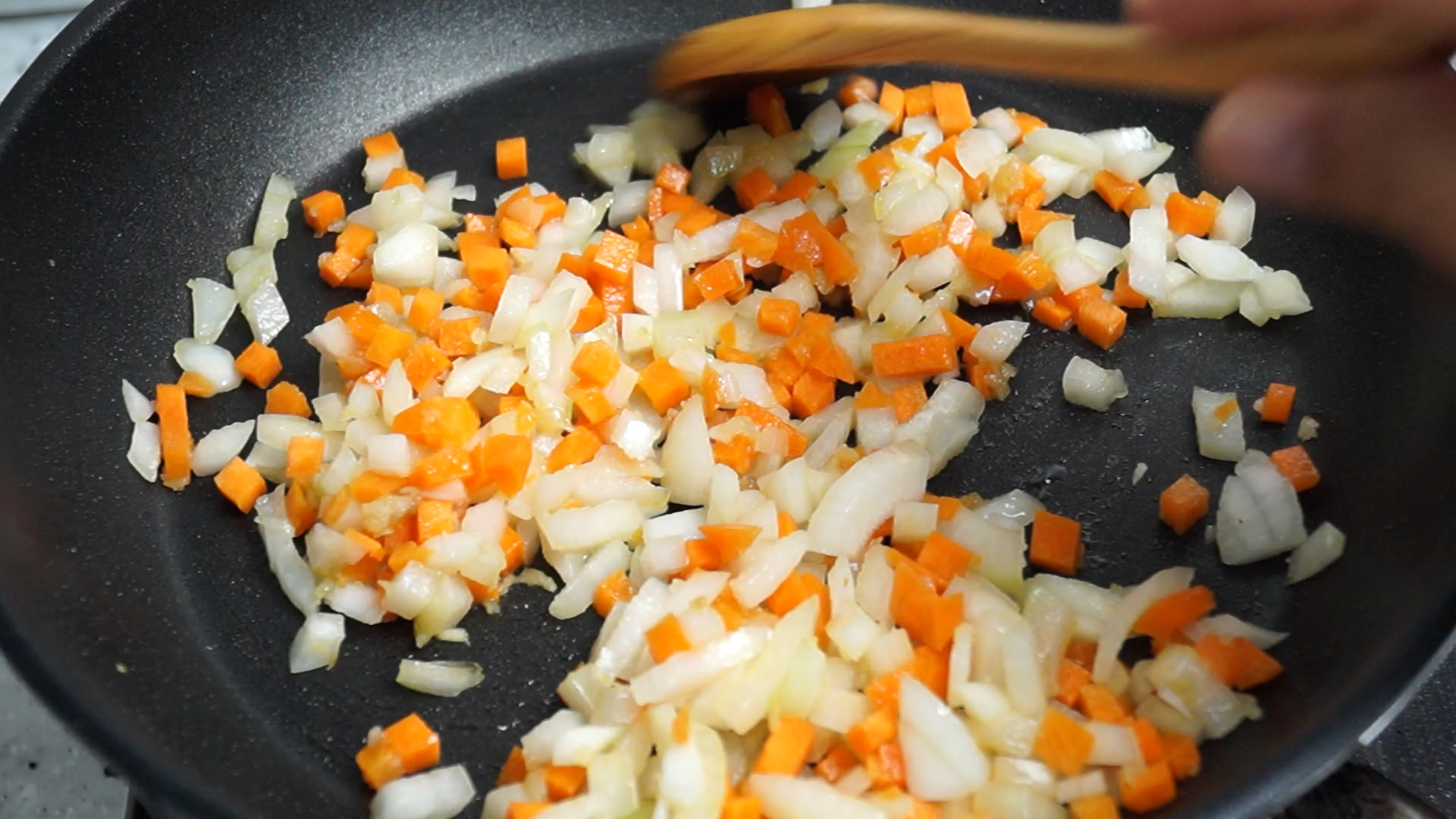 23. 당근 양파를 넣고 불을 강불로 올리고 1~2분 볶아 양파를 투명하게 볶아주세요.
