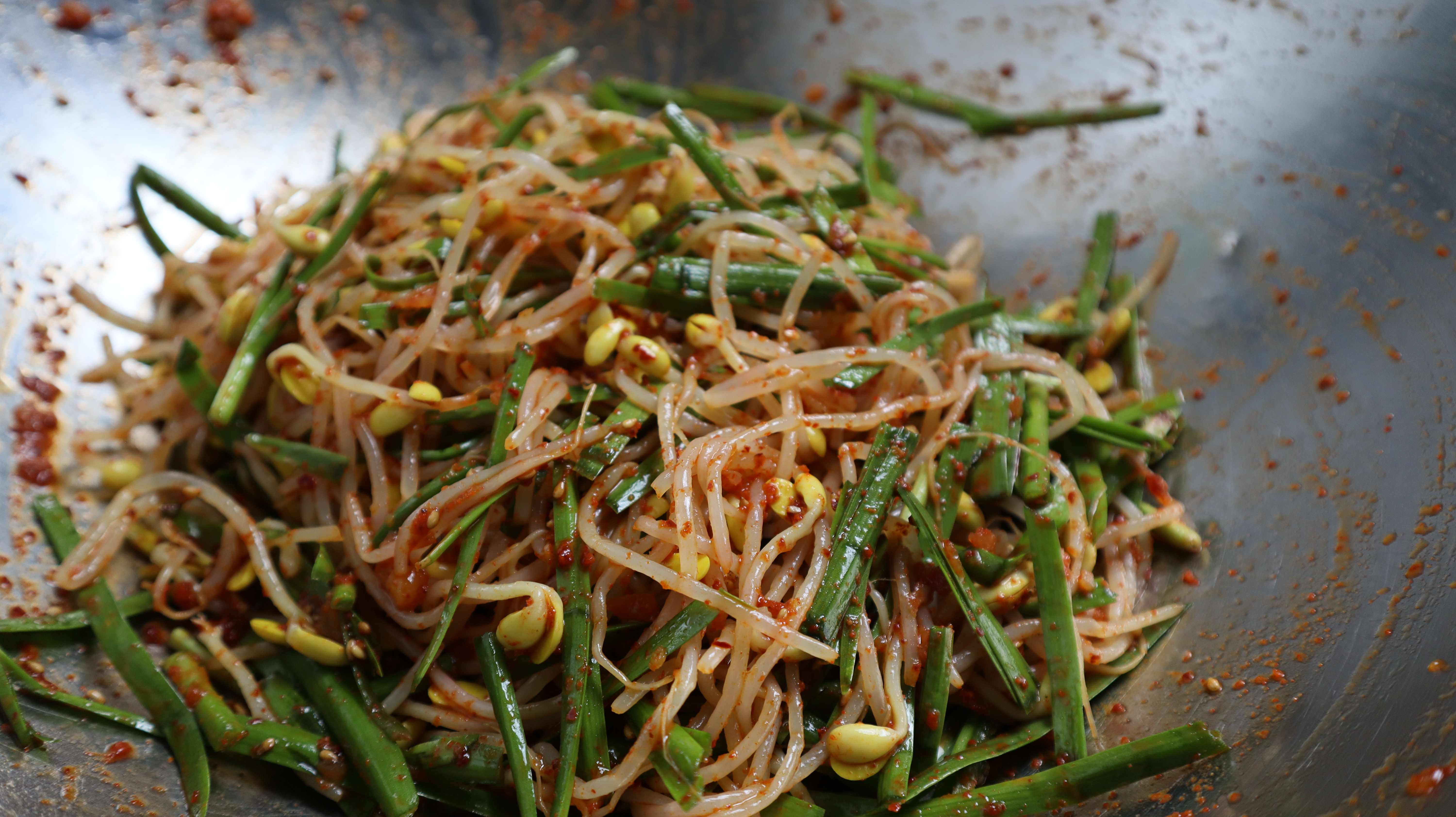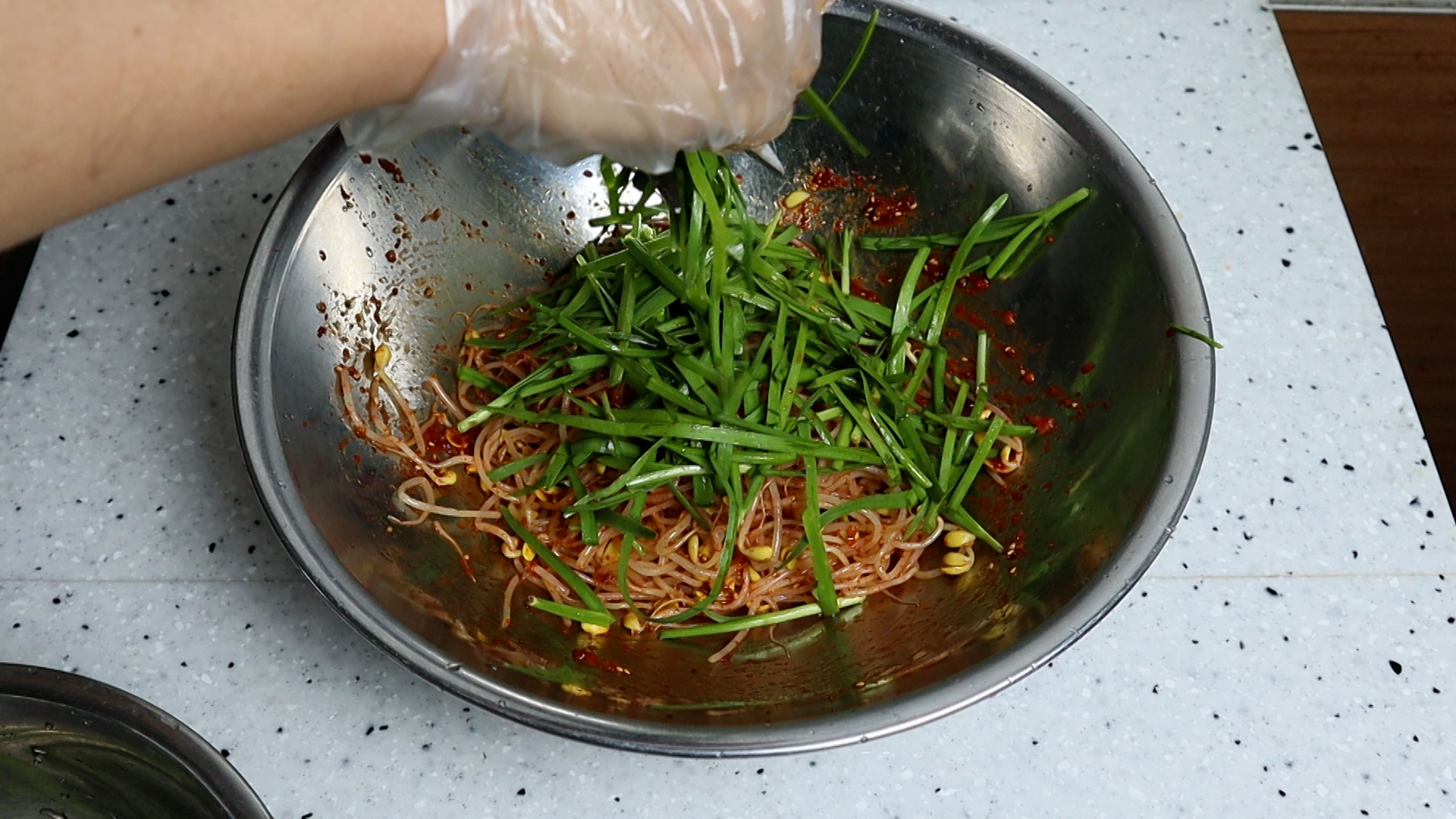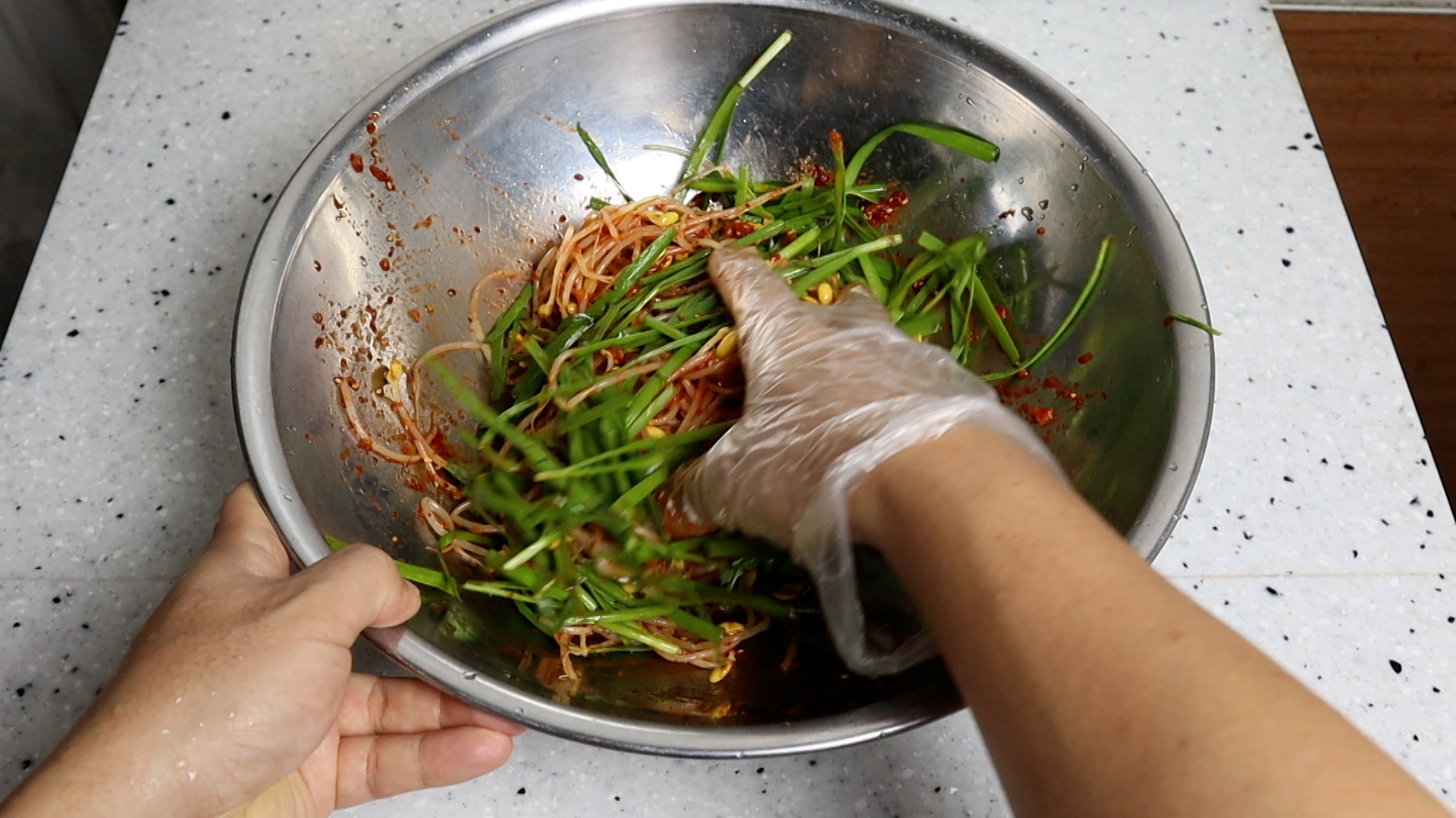19. 가볍게 한번만 섞어주세요. 부추는 오래 치대면 풋내가 날수 있어서 콩나물과 따로 버무렸습니다.