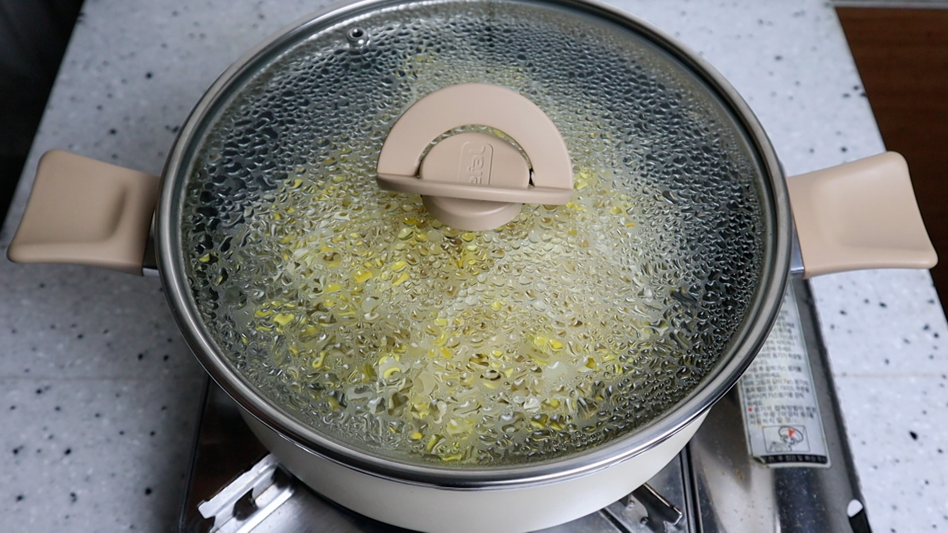 3. 뚜껑을 덮고 부글부글 끓으면 4~5분을 삶아주세요. 물에 푹 담궈 삶는 방식이 아니고 찌는 방식이라 물절약 물데우는 가스절약! 1석2조!