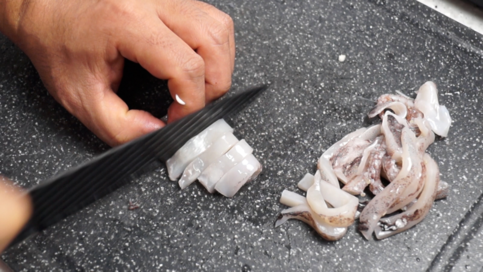 5. 오징어 큰거는 반마리 작은거는 1마리를 먹기 좋은 크기로 썰어주세요. 껍질은 굳이 제거하지 않으셔도 됩니다.