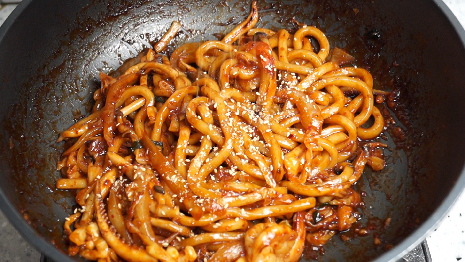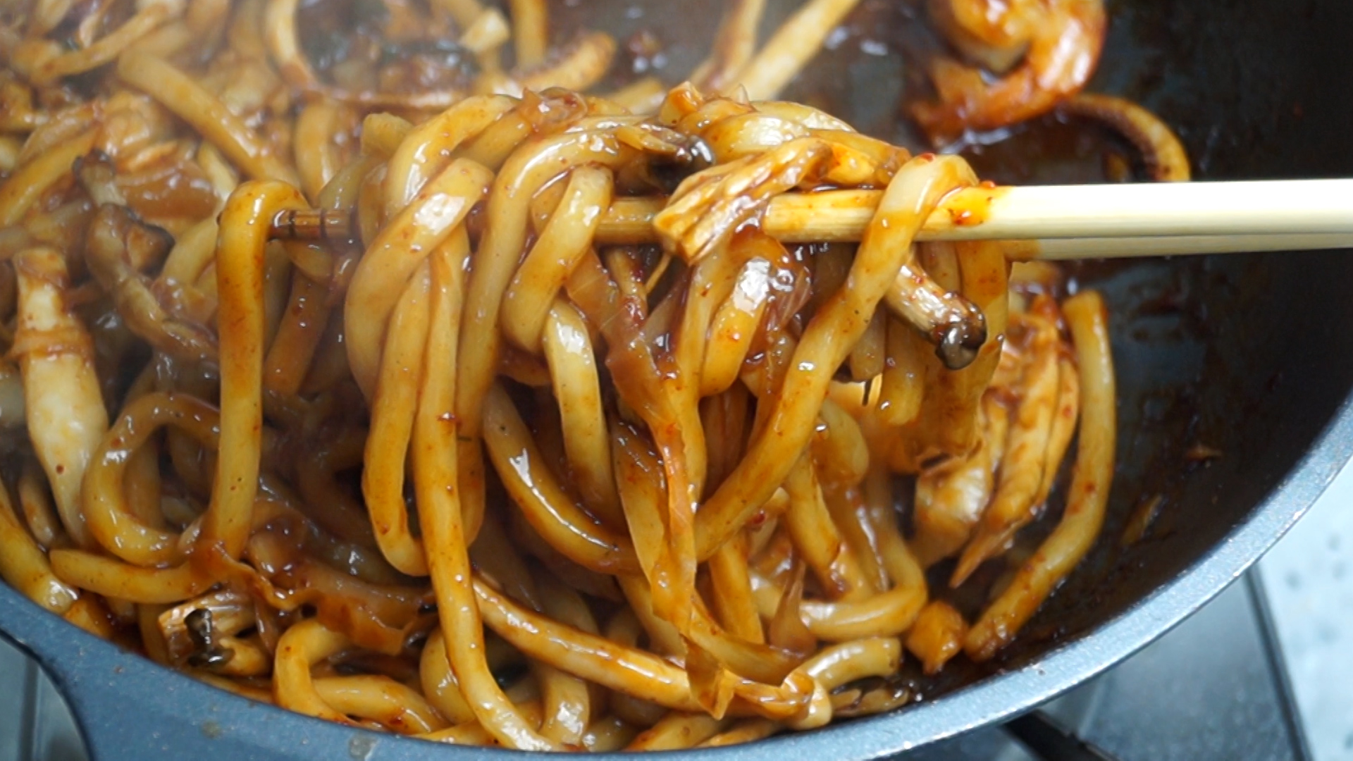 25. 양념과 우동을 강불에 섞어가면서 1~2분을 볶아주세요.