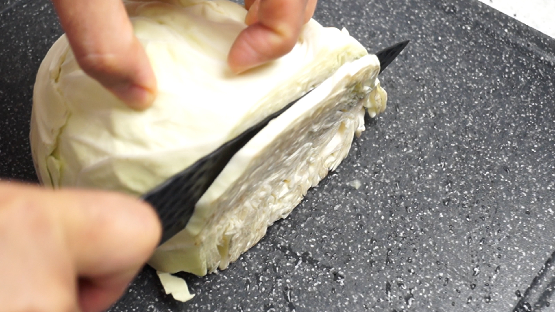 1. 양배추를 0.5cm 정도 두께로 썰어주세요. 나중에 버섯을 넣은 분들은 양배추를 50g 만 준비하시면 됩니다. 무게가 애매하시면 양배추를 썰어 흐트린 다음 가볍게 1주먹 쥐어 준비해보세요.