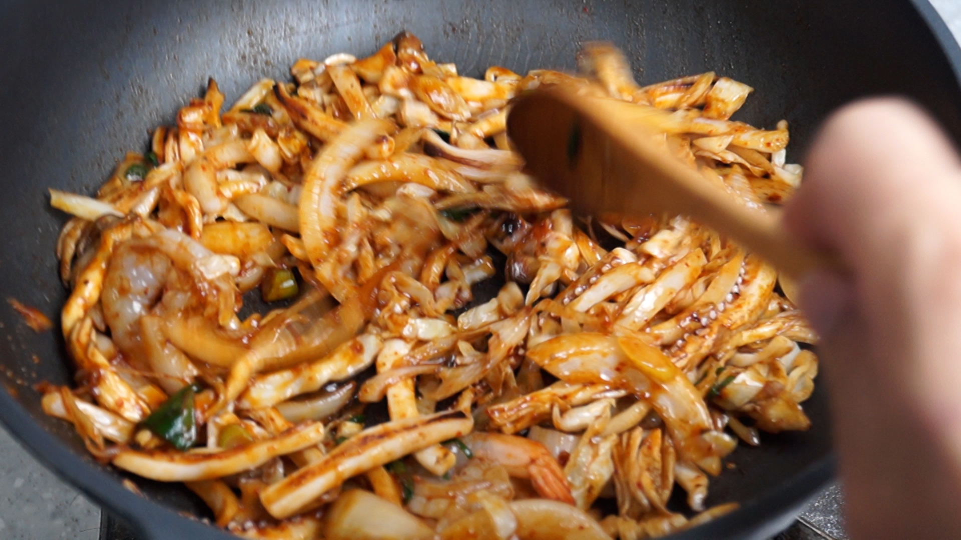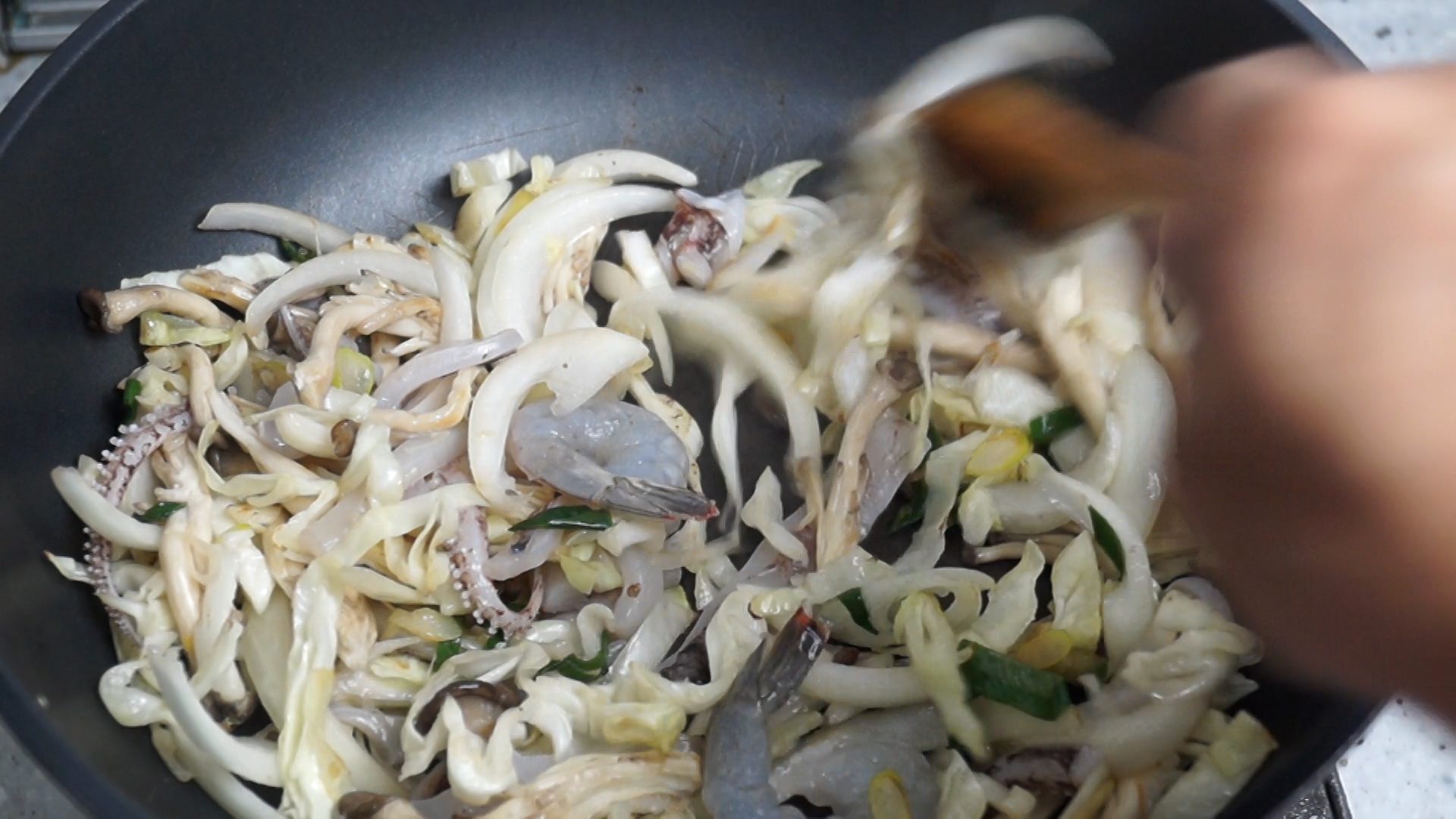 22. 해물을 넣고 또 1분을 볶아주세요.