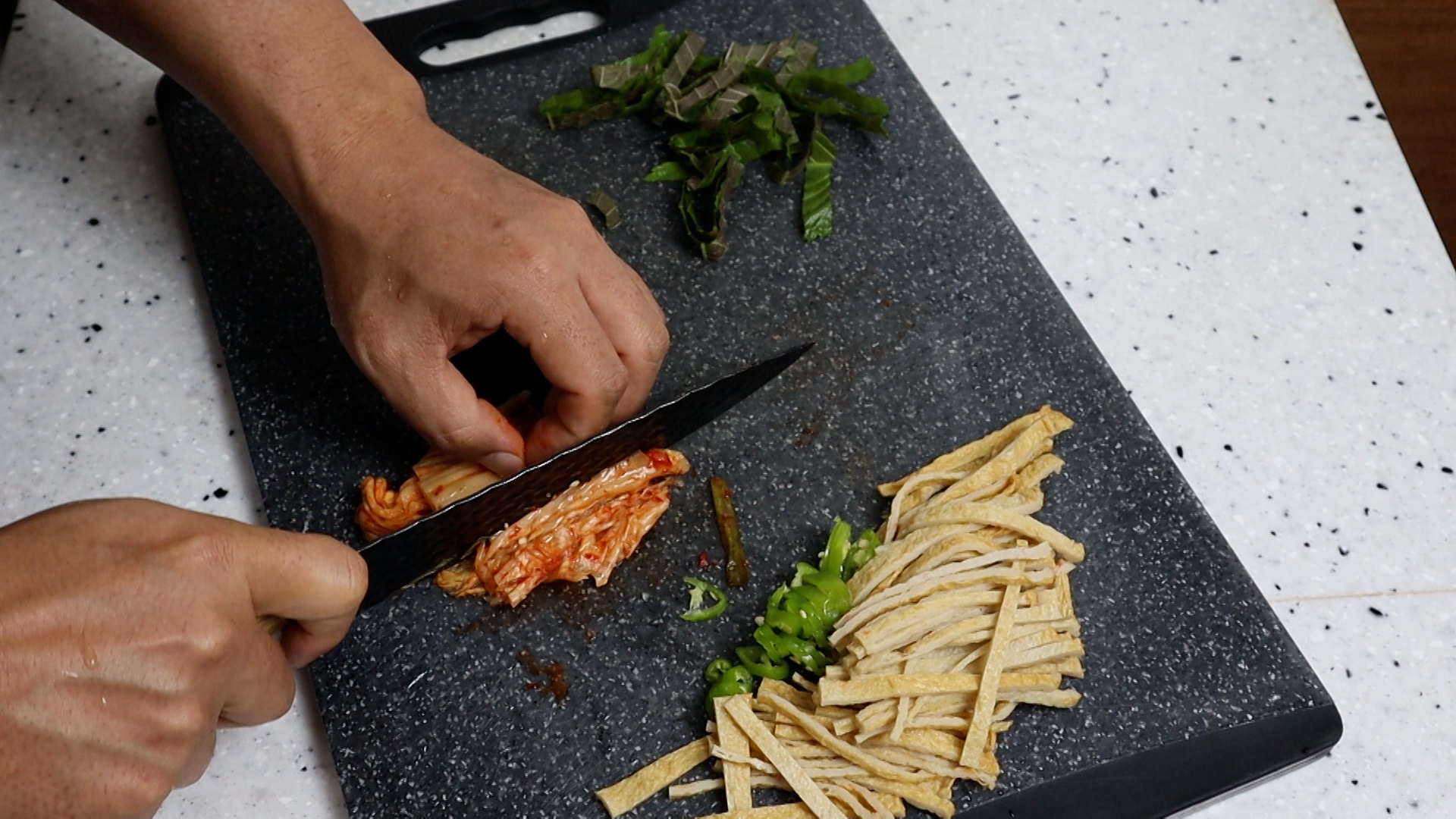 14. 김치 반장 정도를 길쭉하게 채 썰어주세요. 김치는 씻어서 잘라주셔도 좋아요.
