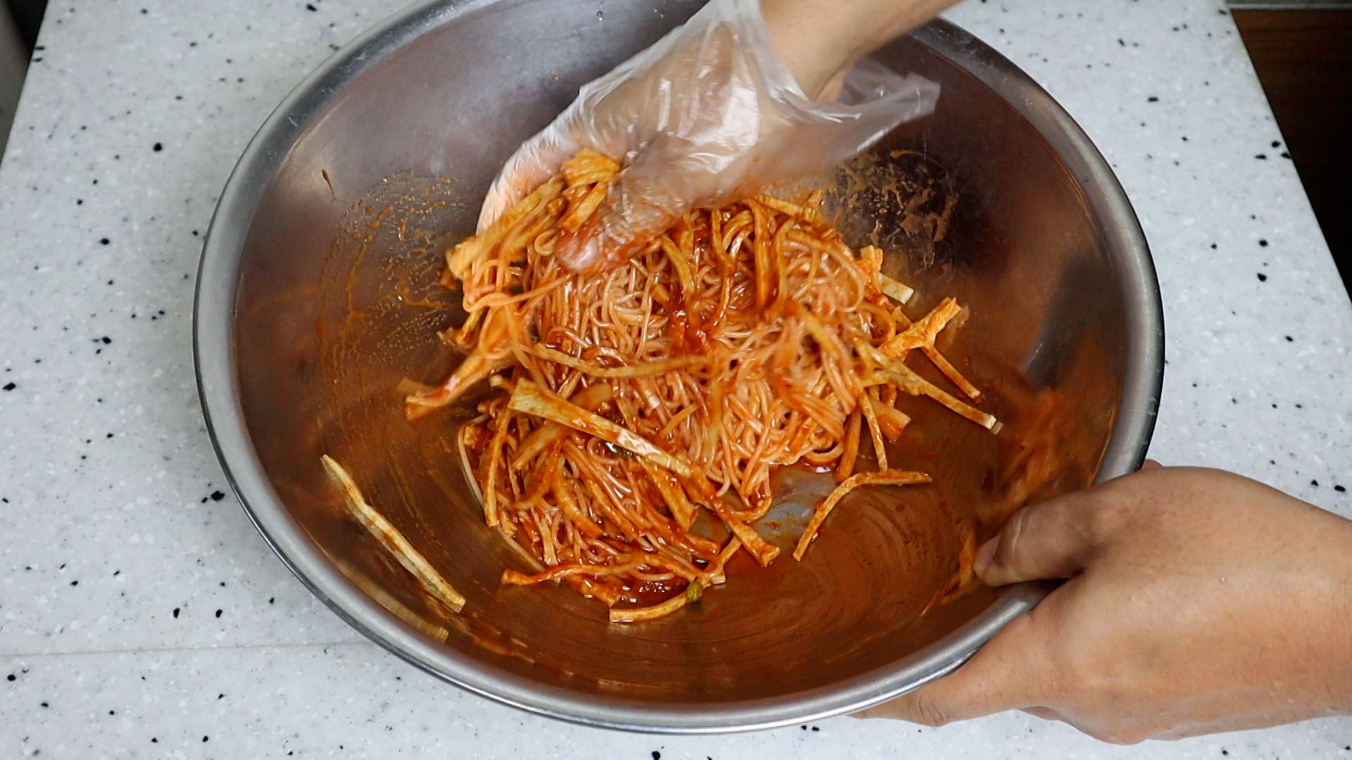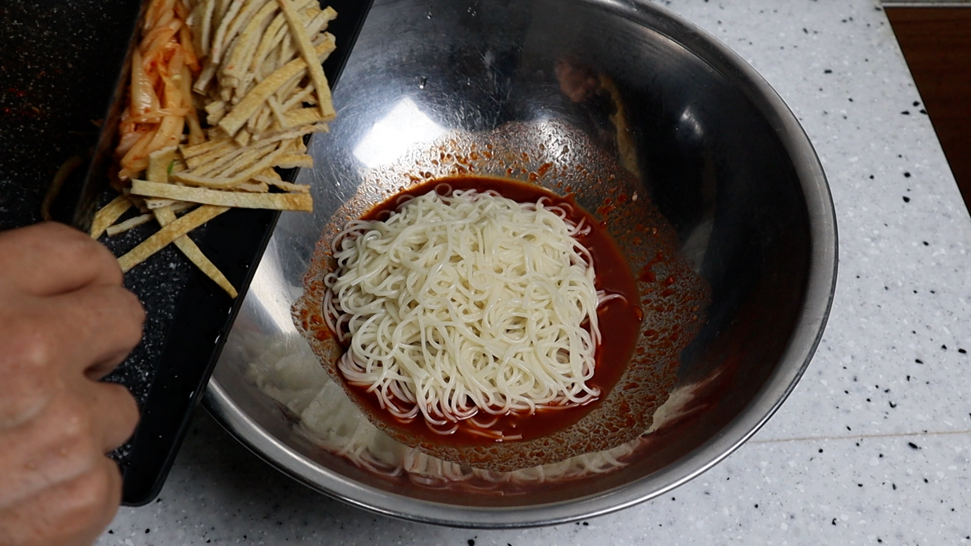 15. 양념에 건국수 100g 1인분을 삶아서 뽀독뽀독씻어 전분기를 제거해서 넣고 준비한 재료를 전부 넣어주세요.