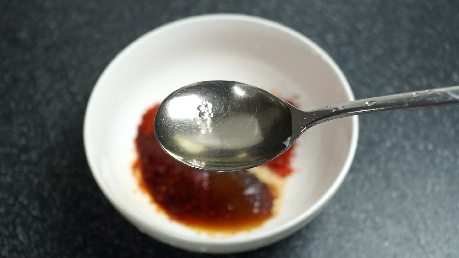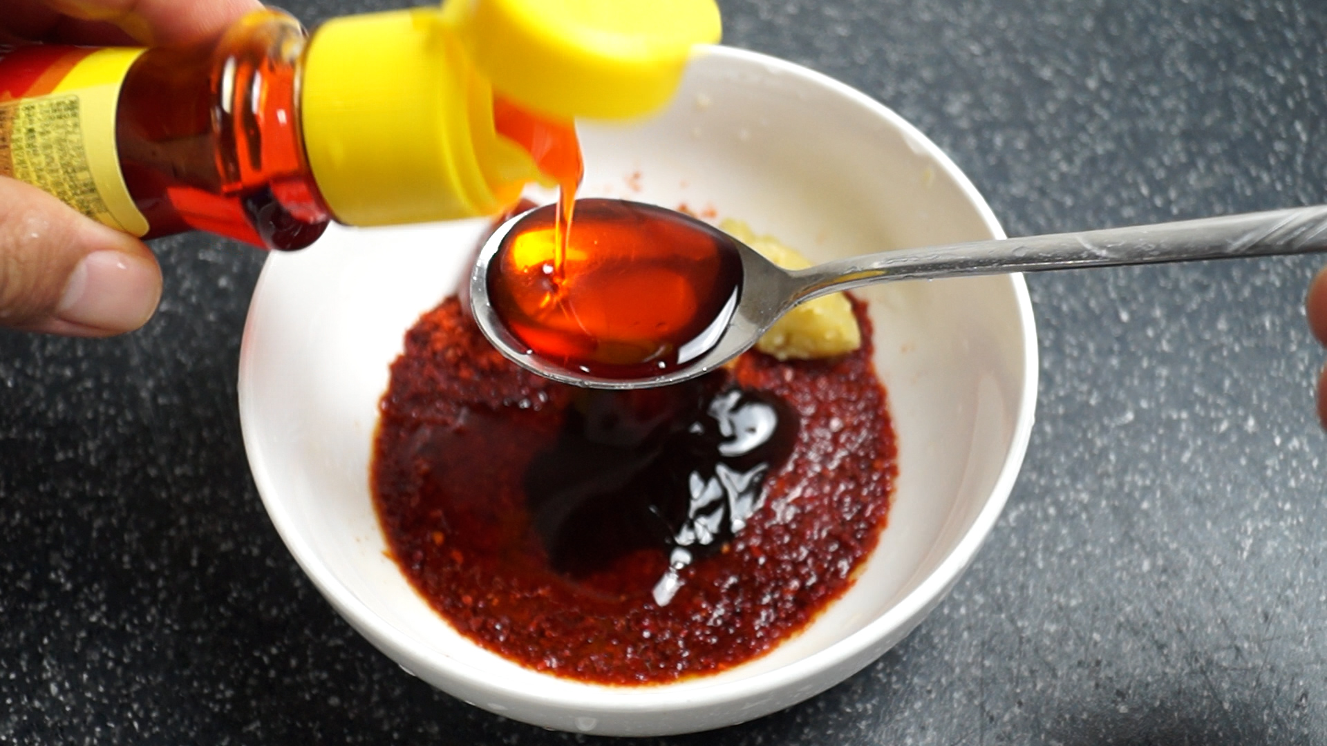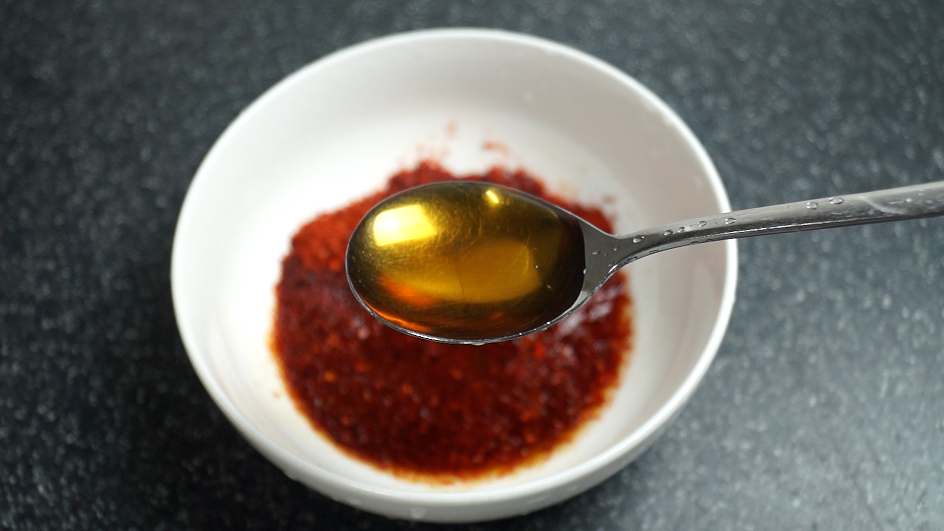 15. 매콤한 맛이 일품인 고추기름을 사용해보세요. 고추기름이 없으심녀 식용유 1스푼과 고춧가루를 1/3스푼 정도 추가해주세요.