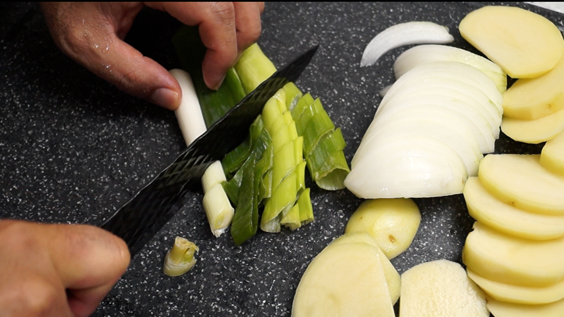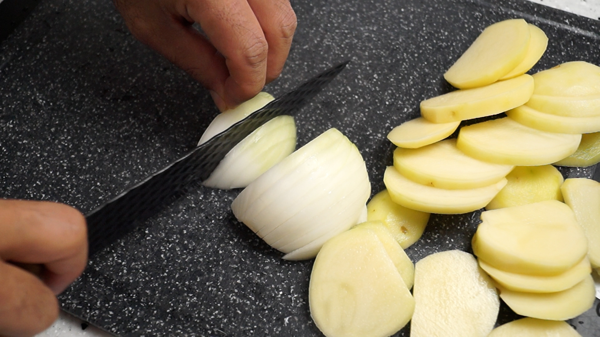 3. 양파도 감자와 비슷한 두께로 썰어주세요.