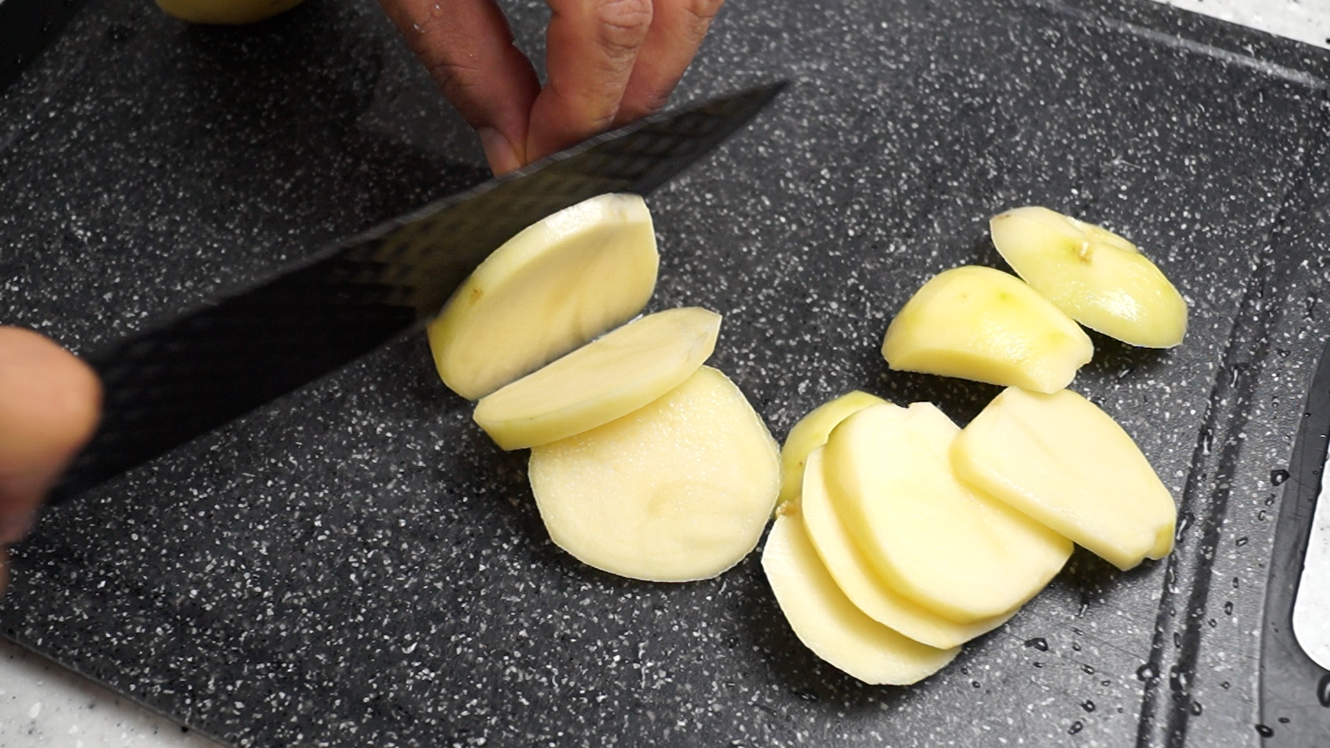 2. 감자를 너무 두껍지 않게 0.5cm 정도 두께로 썰어주시고 크기는 기호에 맞게 썰어주세요.