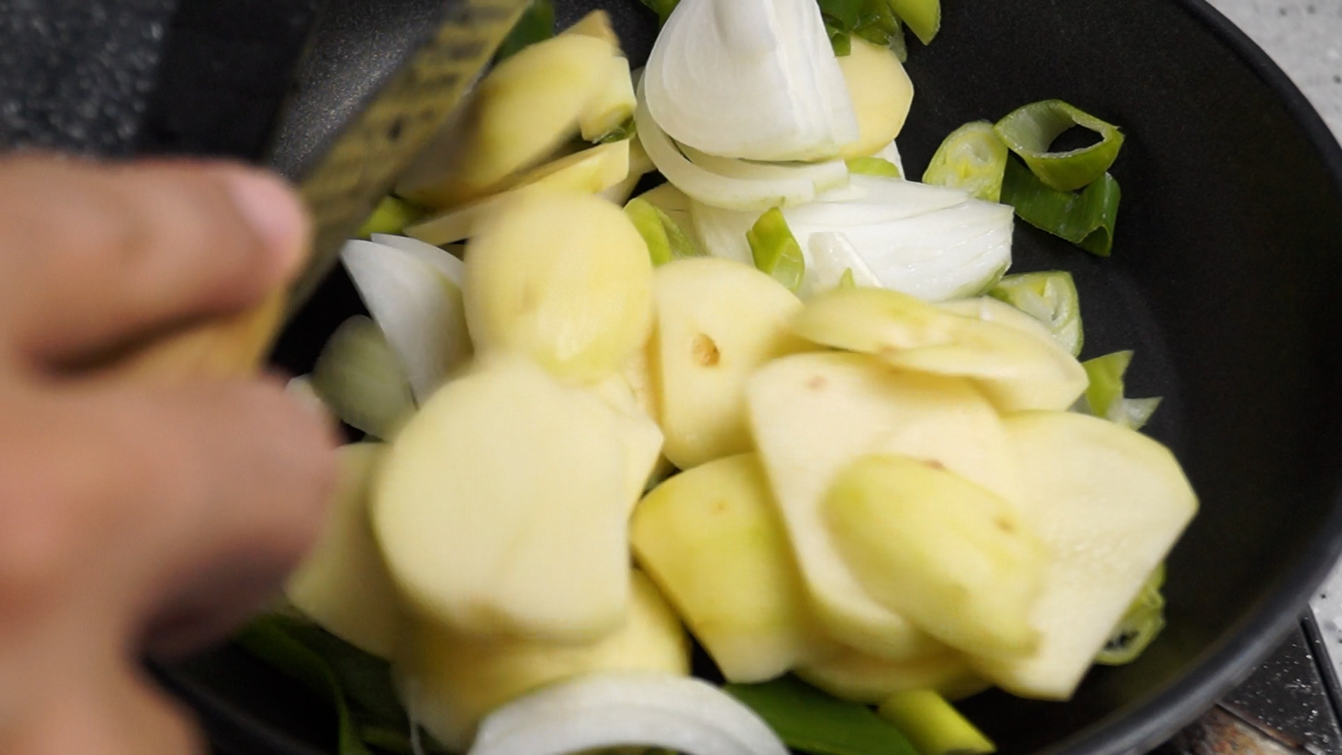20. 웍이나 팬 바닥에 감자,양파,대파를 깔아주세요.