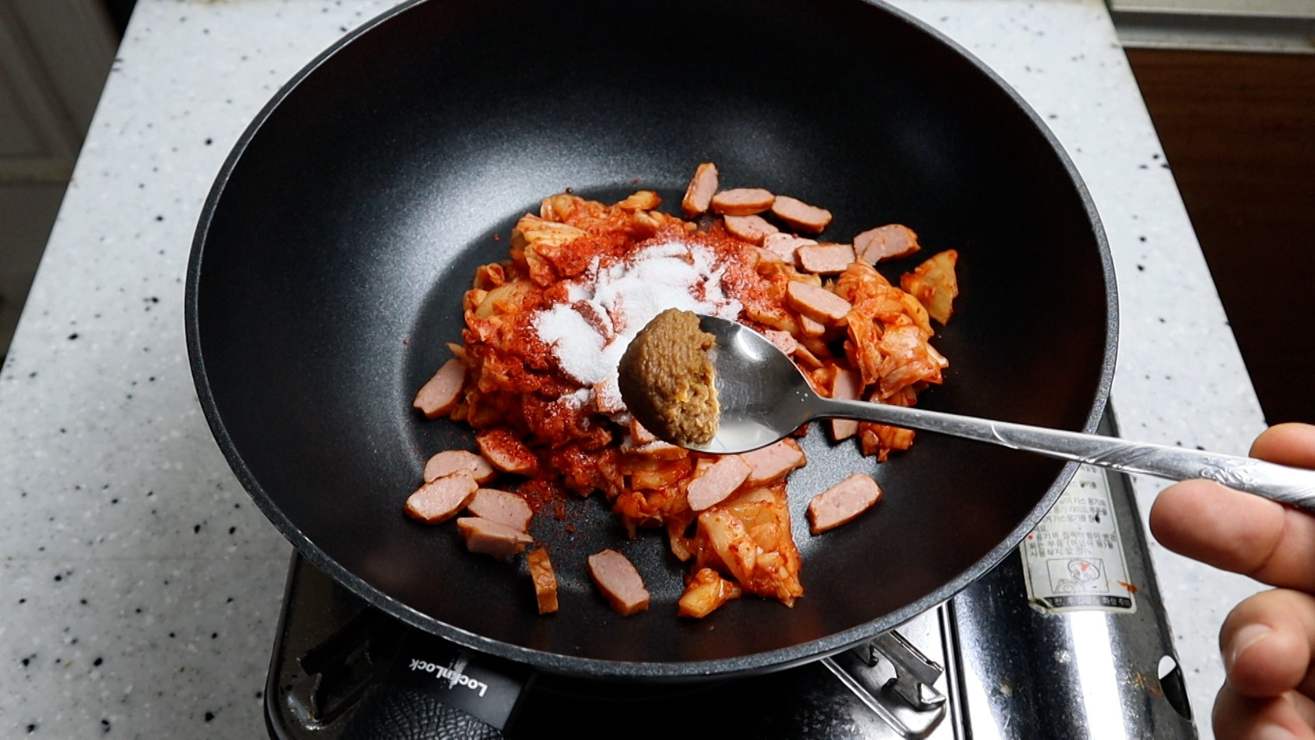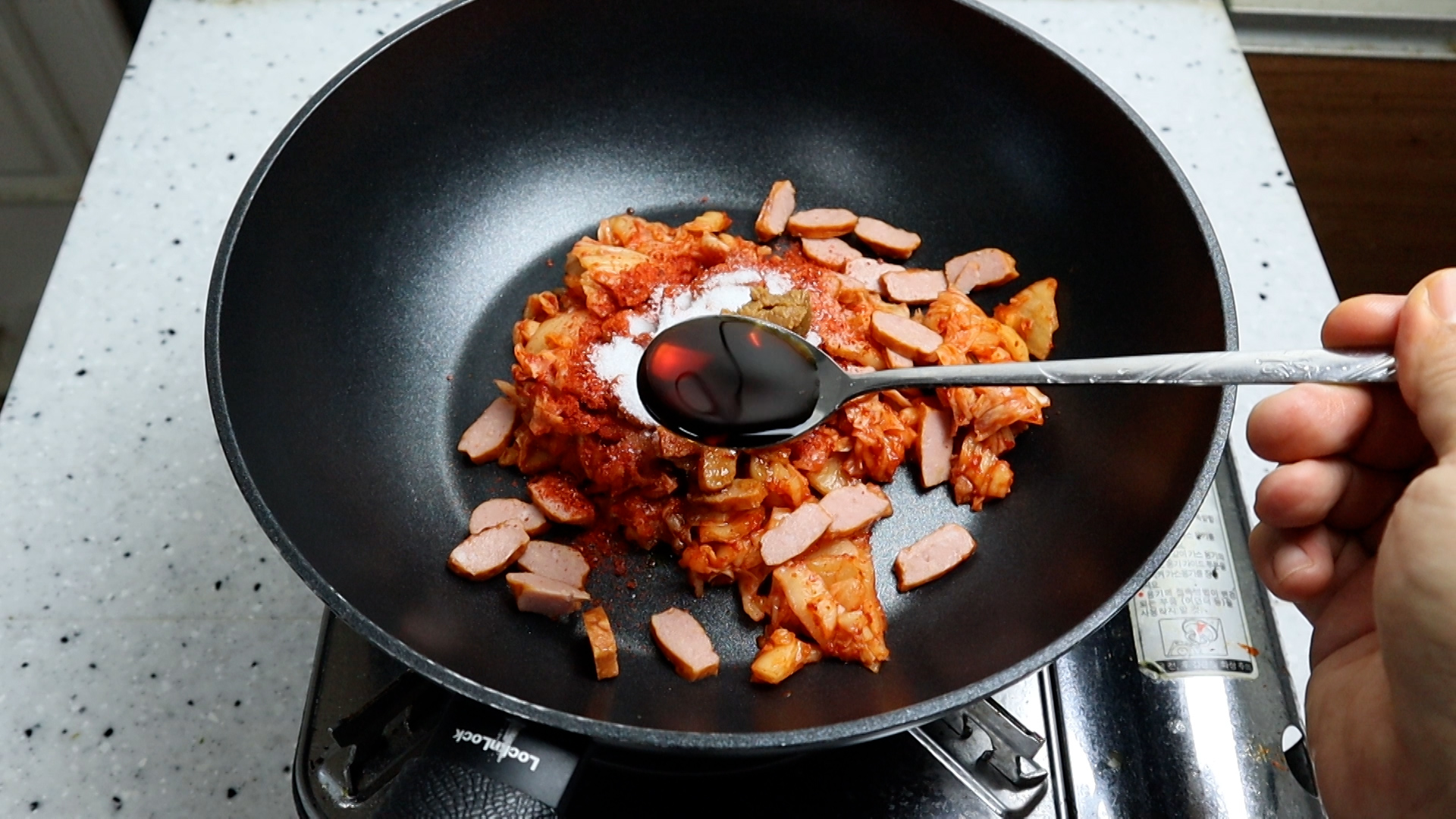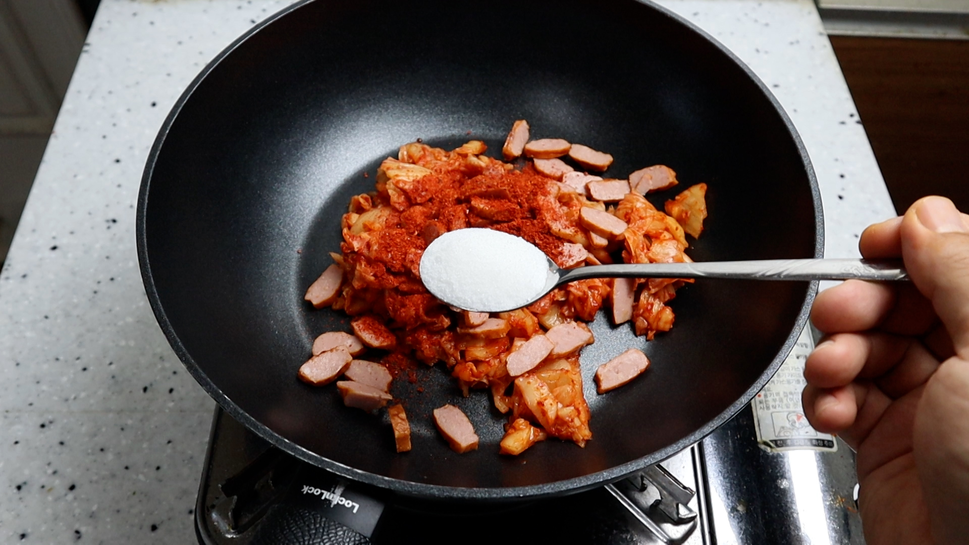 4. 코팅된 웍에 김치와 햄을 넣고 고춧가루를 뿌려주세요.