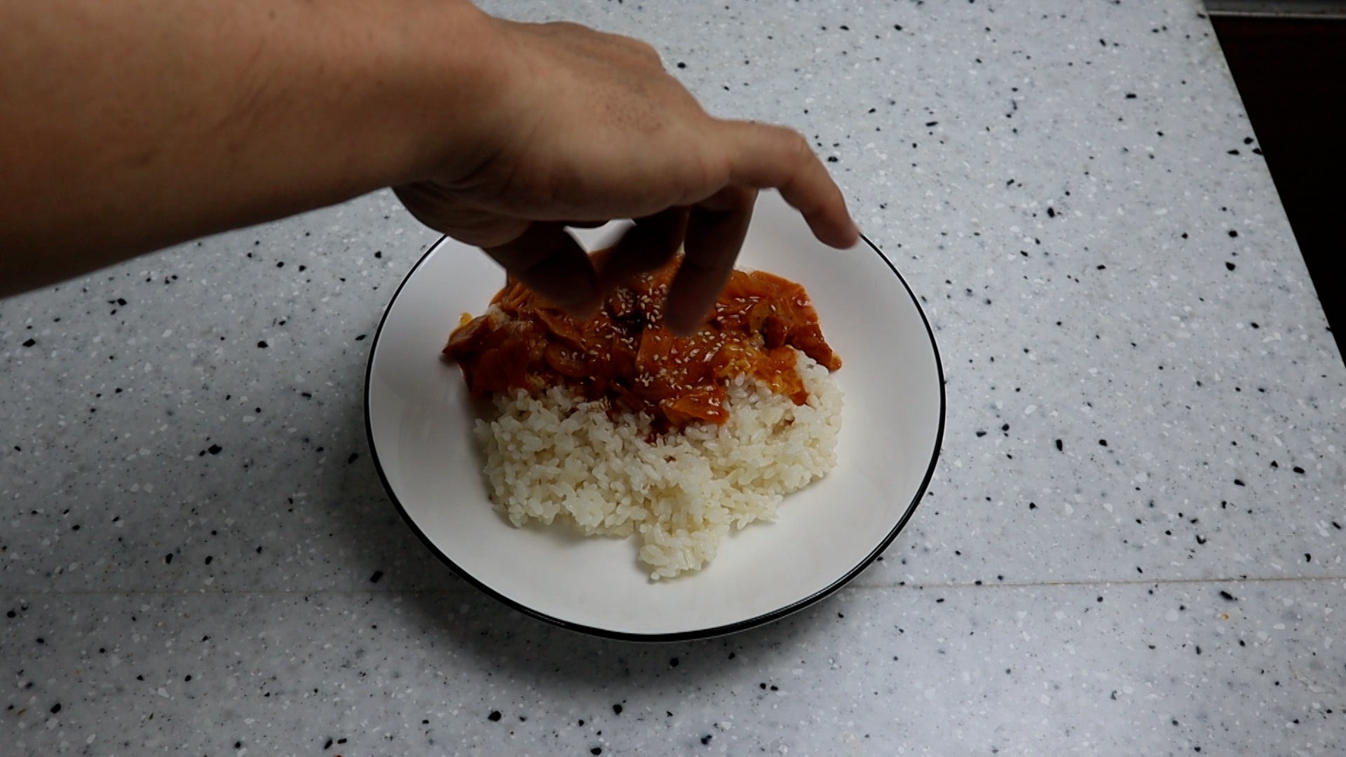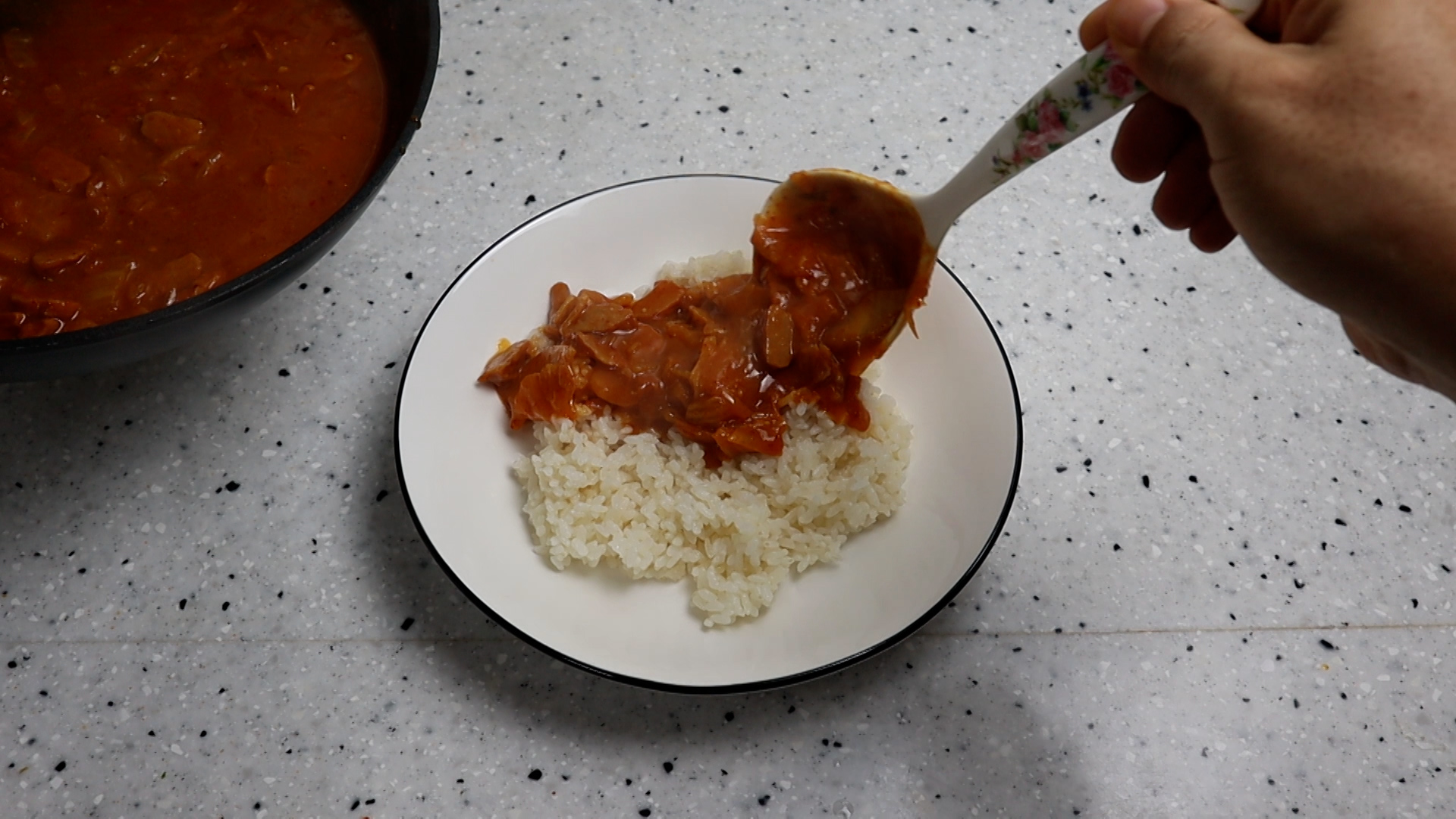 14. 밥위에 소스를 2~3국자 올려주세요.