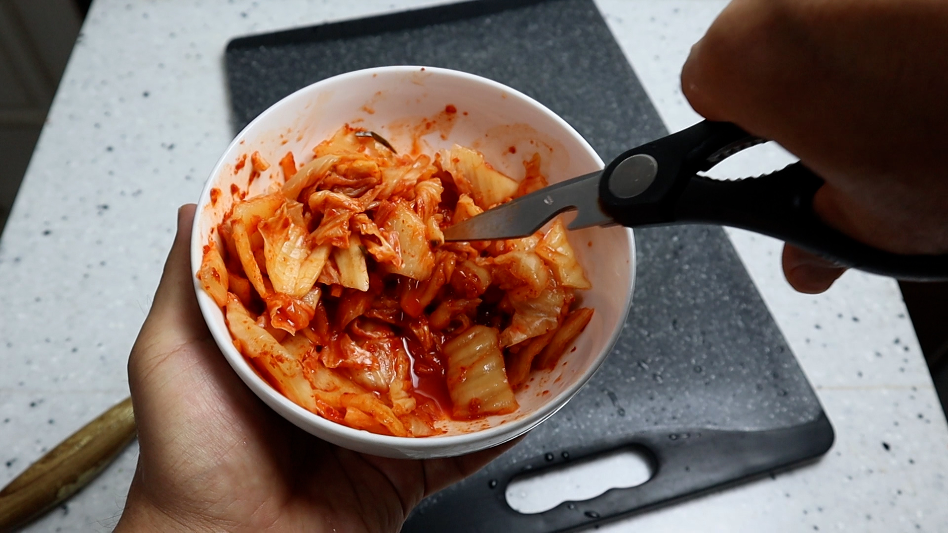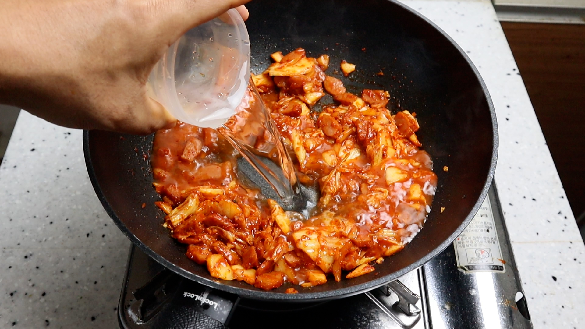 5. 설탕을 넣어주세요. 혹 김치가 짠맛이 강한편이라면 설탕을 소량 더 넣어주세요.