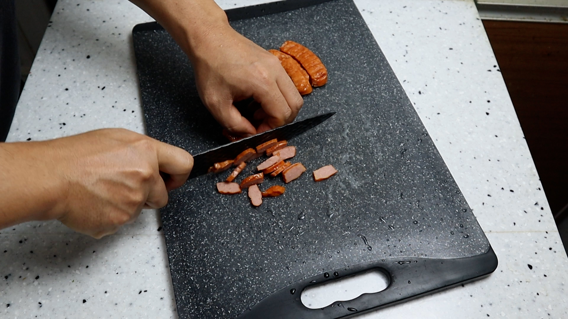 1. 햄을 아무거나 100g 썰어주거나 밑간한 돼지고기 100g 을 준비해주세요. 스팸은 짠맛이 강하니 햄은 비엔나소세지나 일반햄을 사용해주세요.