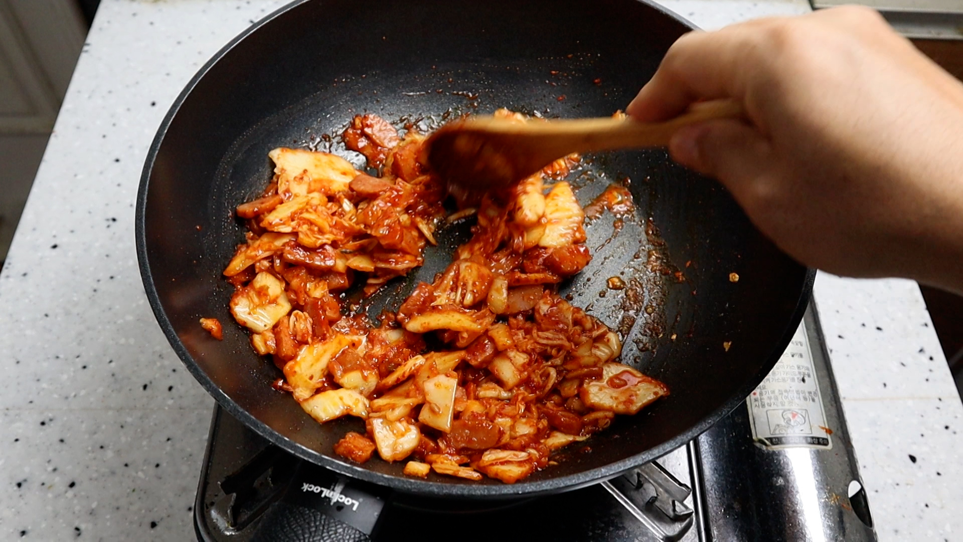 9. 중불에 재료가 자글거리면 섞으면서 2분을 볶아주세요. 2분 내내 저을 필요는 없고 20초 정도 가만 뒀다 섞어주고 20초 가만 뒀다 섞어주고를 반복하시면 됩니다.