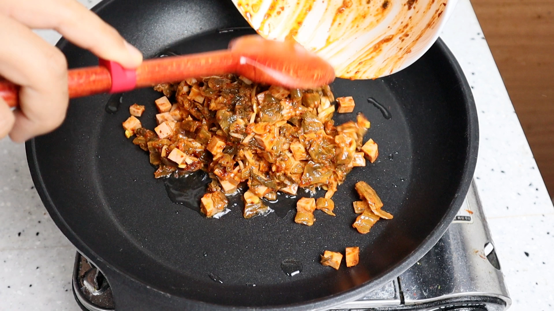 14. 기름을 강불로 달군 다음에 비벼놓은 김치를 전부 부어주세요.