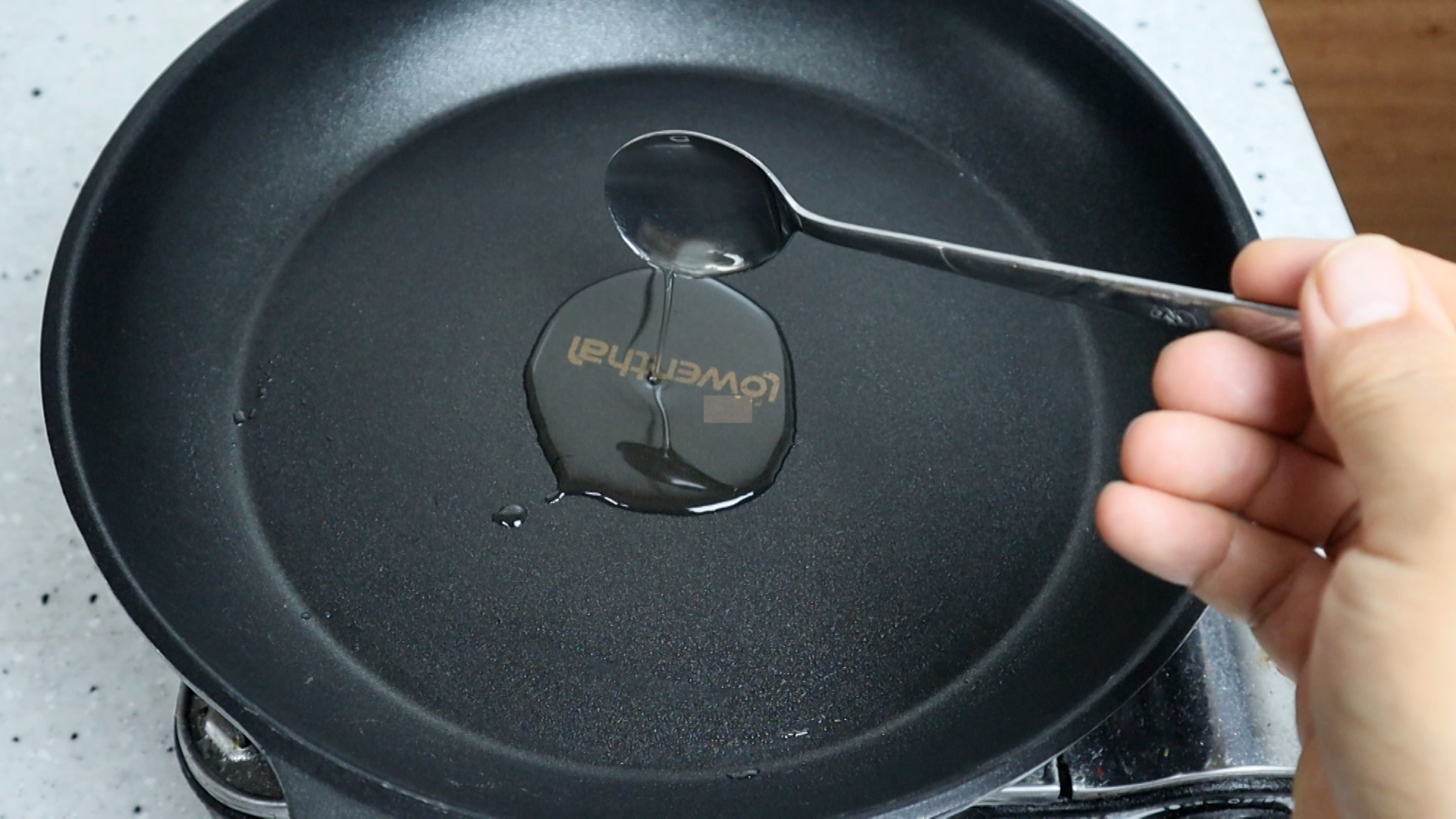 13. 폭이 최소 22cm 되는 넓은 코팅팬에 식용유 2스푼을 부어주세요. 스텐팬! 또는 코팅이 벗겨진 팬은 금방 다 늘어 붙으니 꼭 코팅팬 사용하세요.