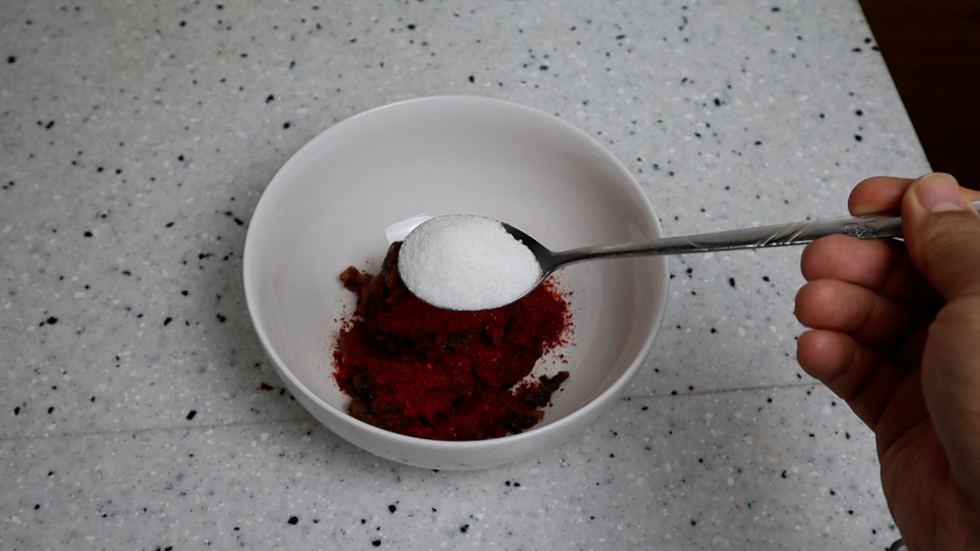 6. 볶았을때 진한맛이 나게 볶아주고 색감을 올려주는 설탕을 넣어주세요.