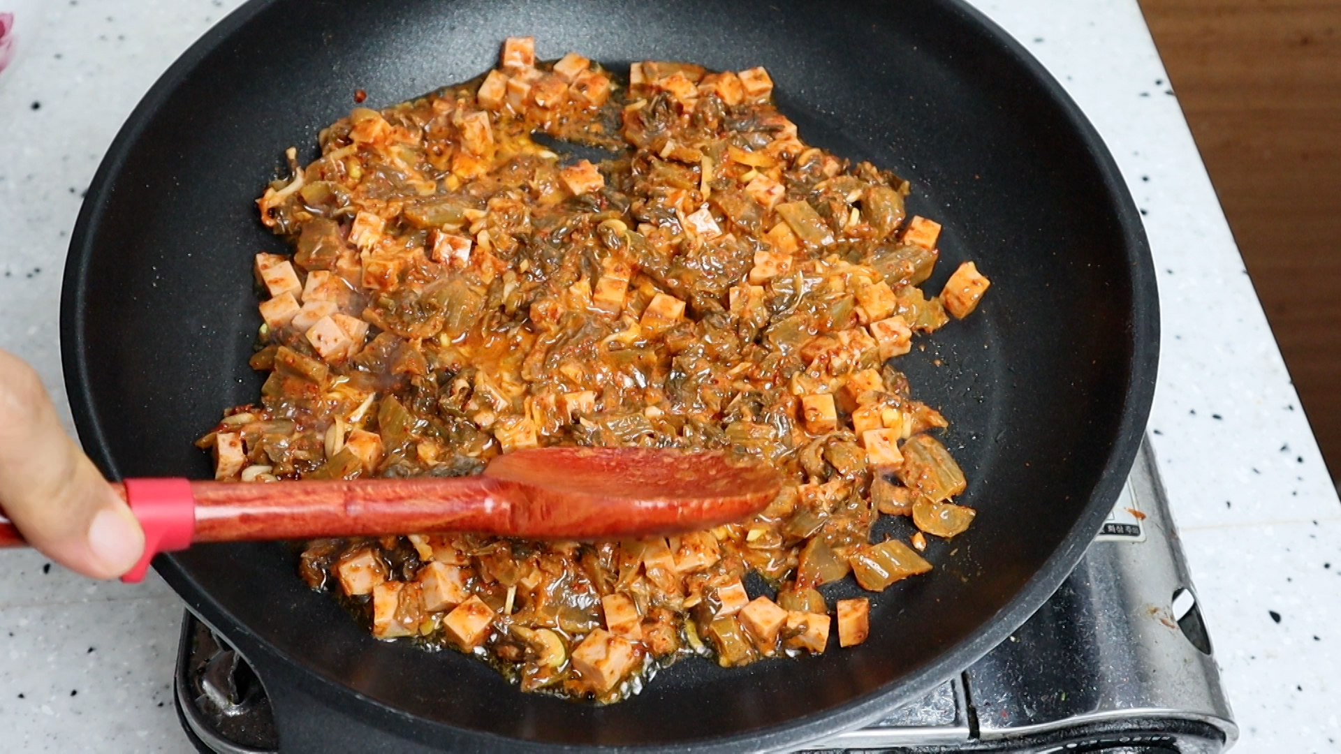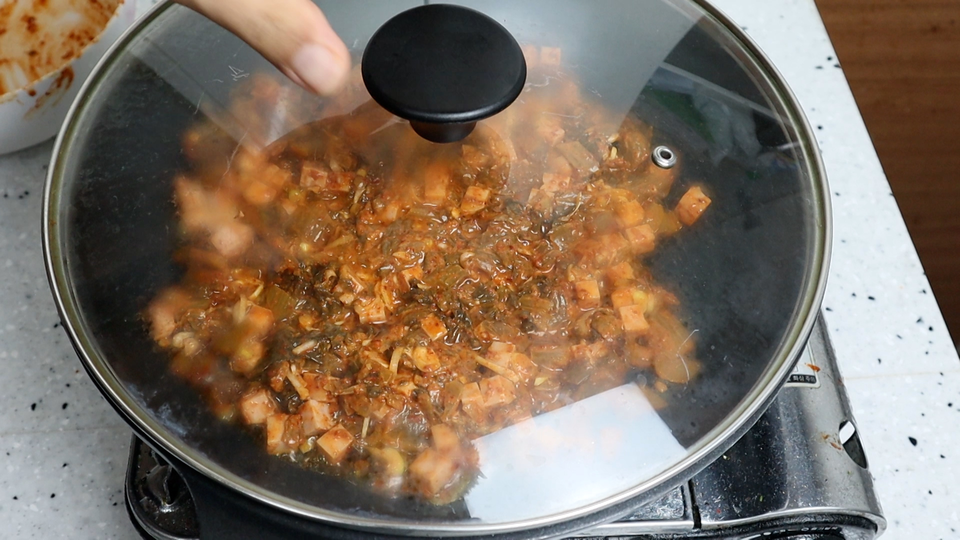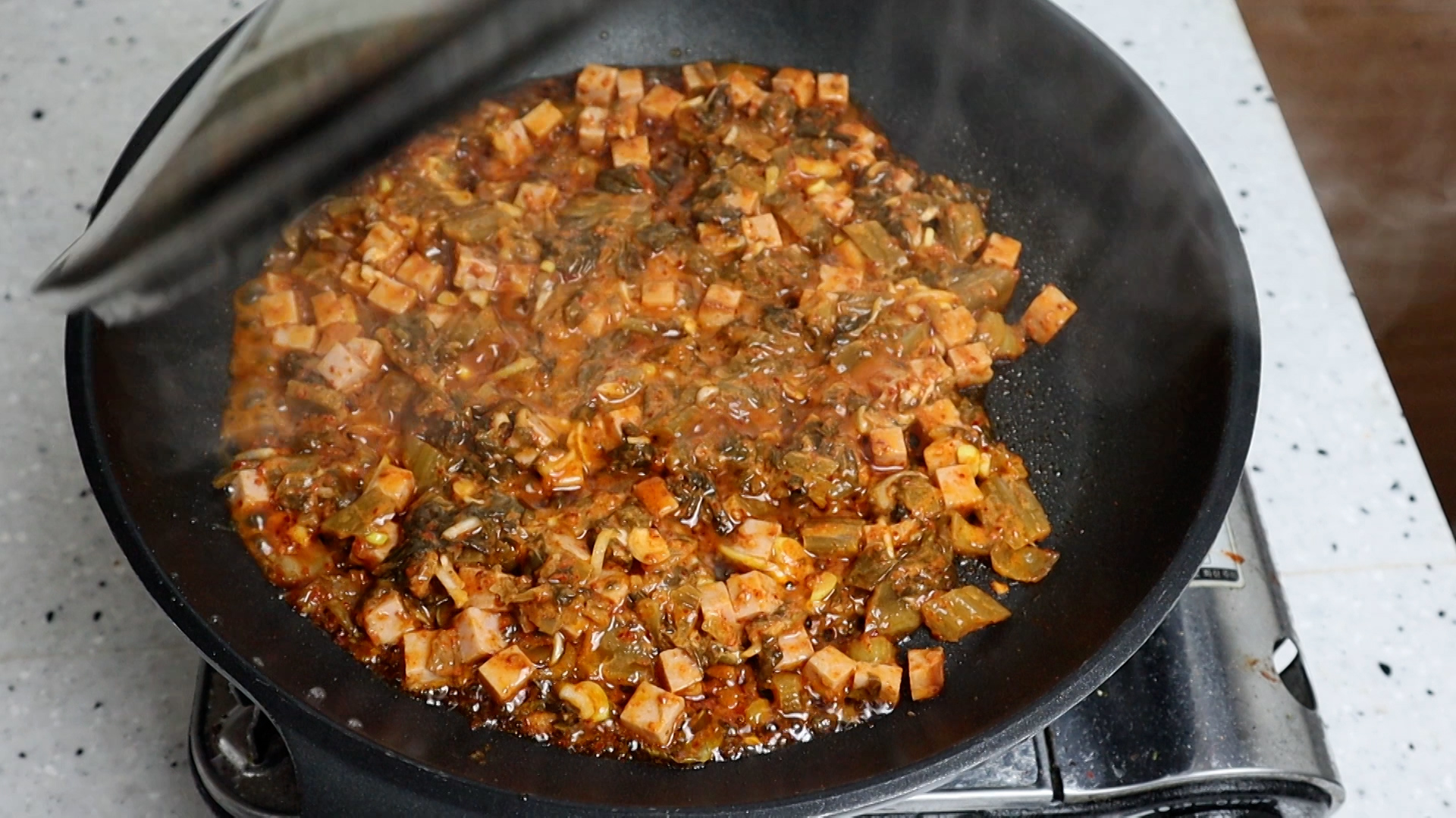 17. 뚜껑을 열고 골고루 섞으면서 1분을 볶아주세요.