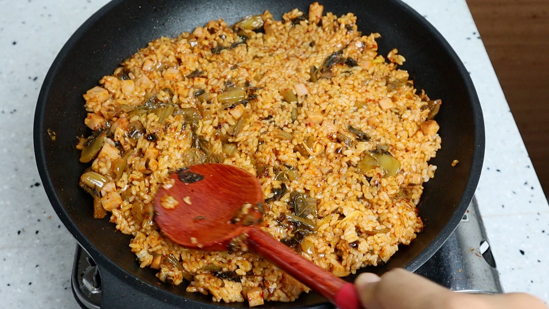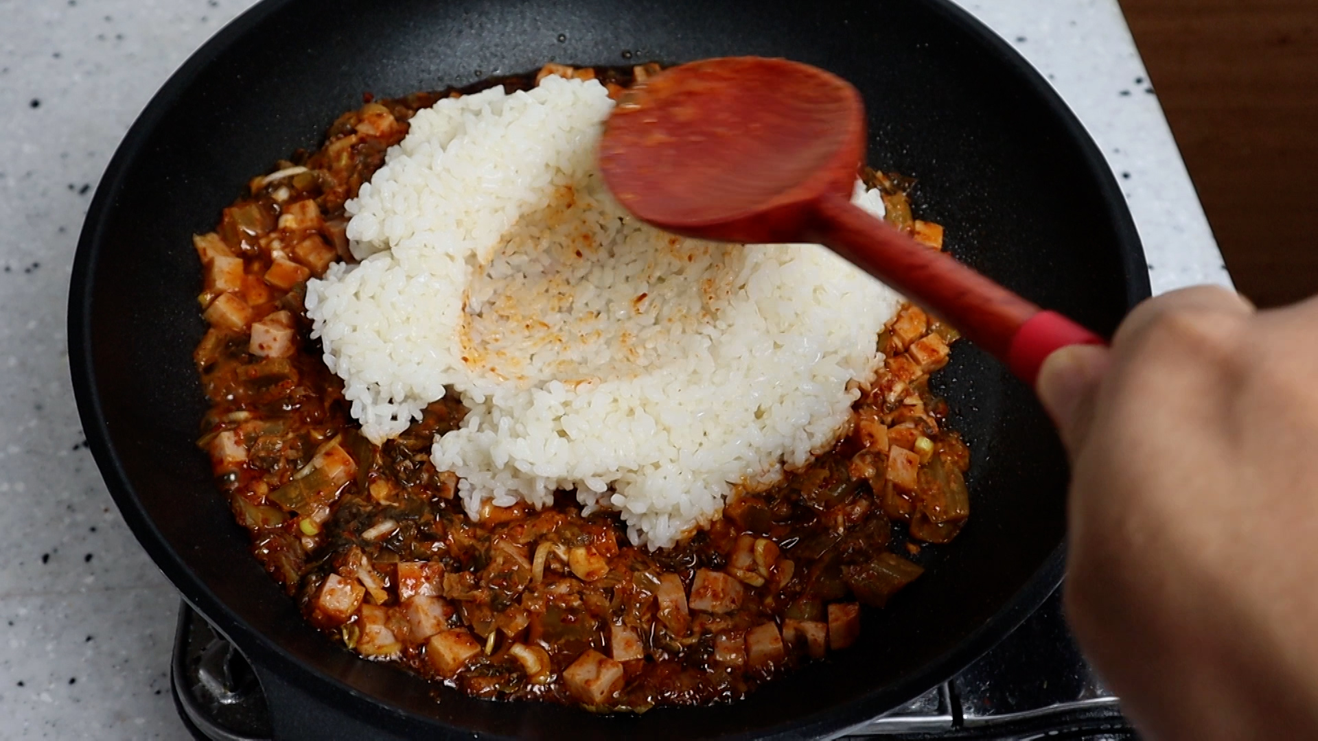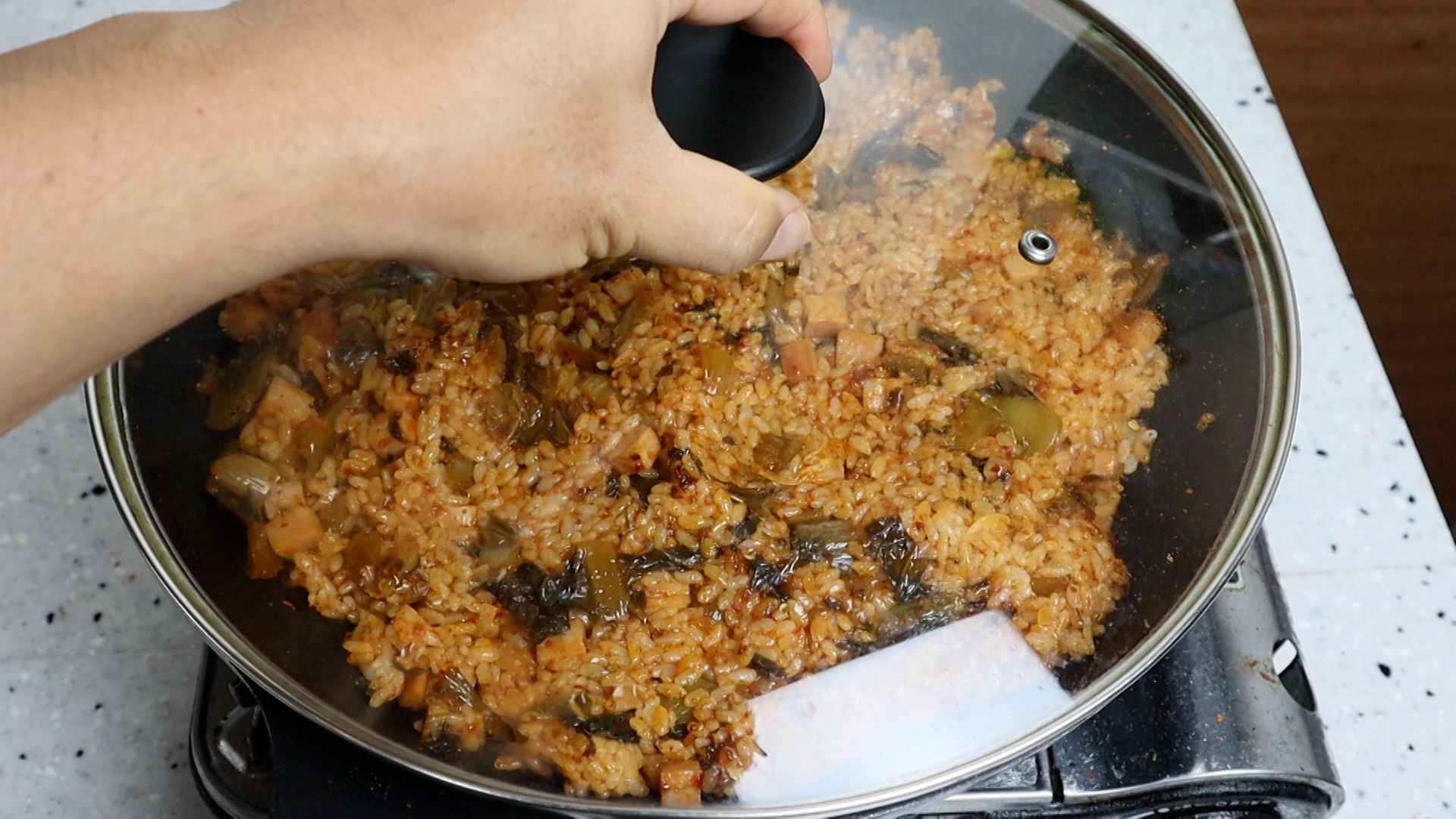 18. 뚜껑 열고 1분 볶은 김치에 밥 2공기 420g을 넣고 골고루 섞어가면서 1분을 더 볶아주세요.