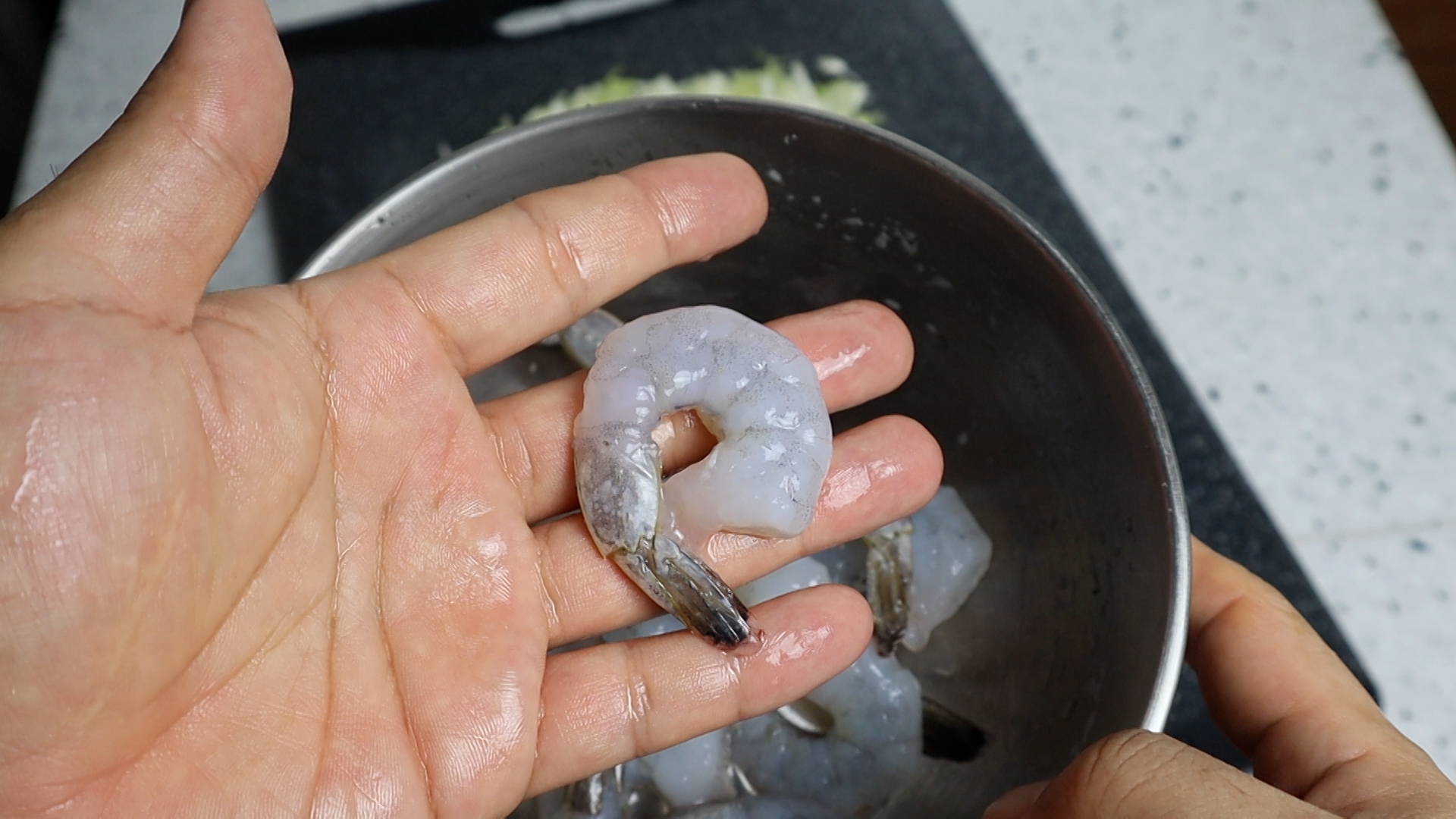 9. 새우는 두절새우로 이만한 크기로 10마리 준비하시고 자잘한 새우가 있으시면 20~25마리를 준비해주세요.