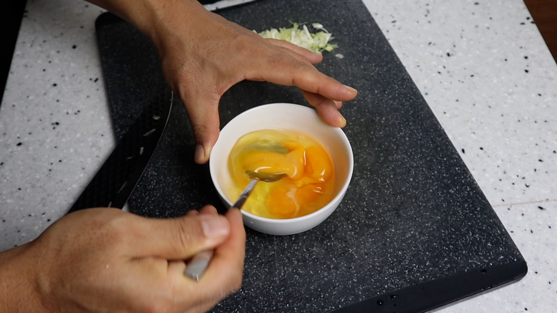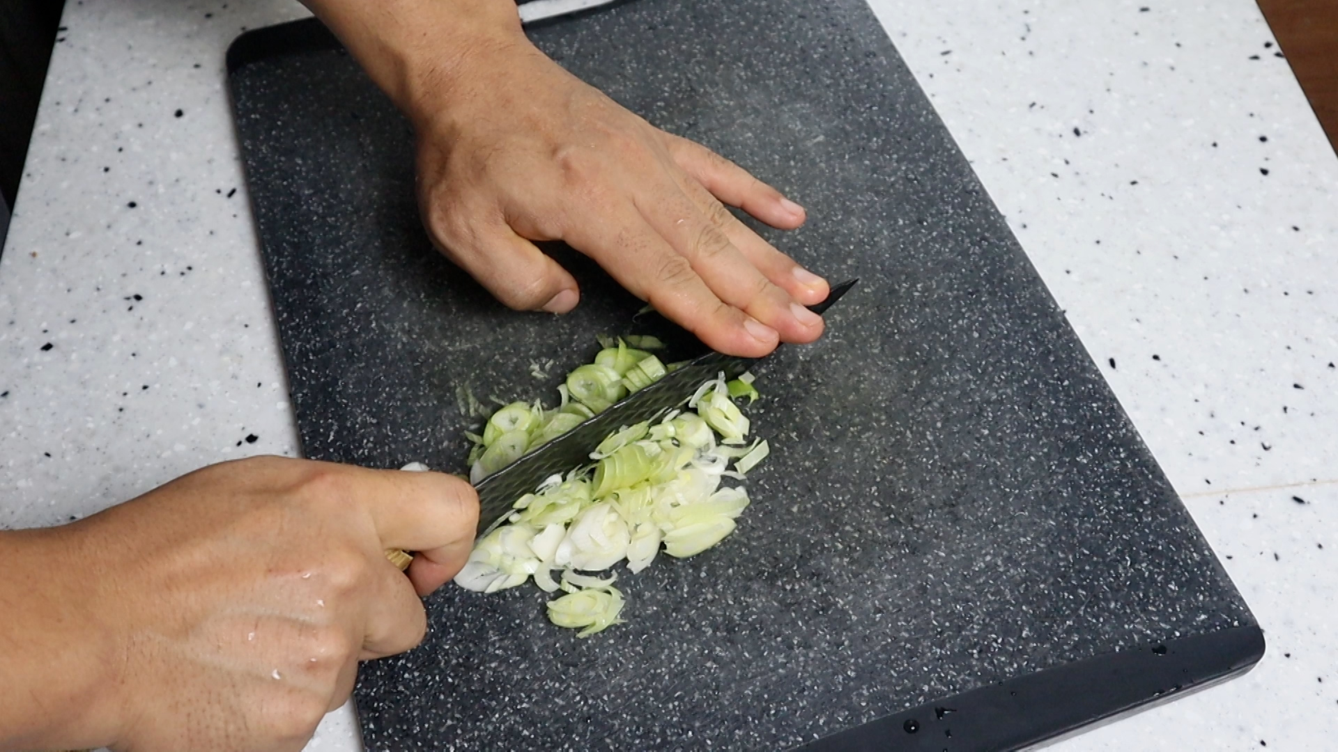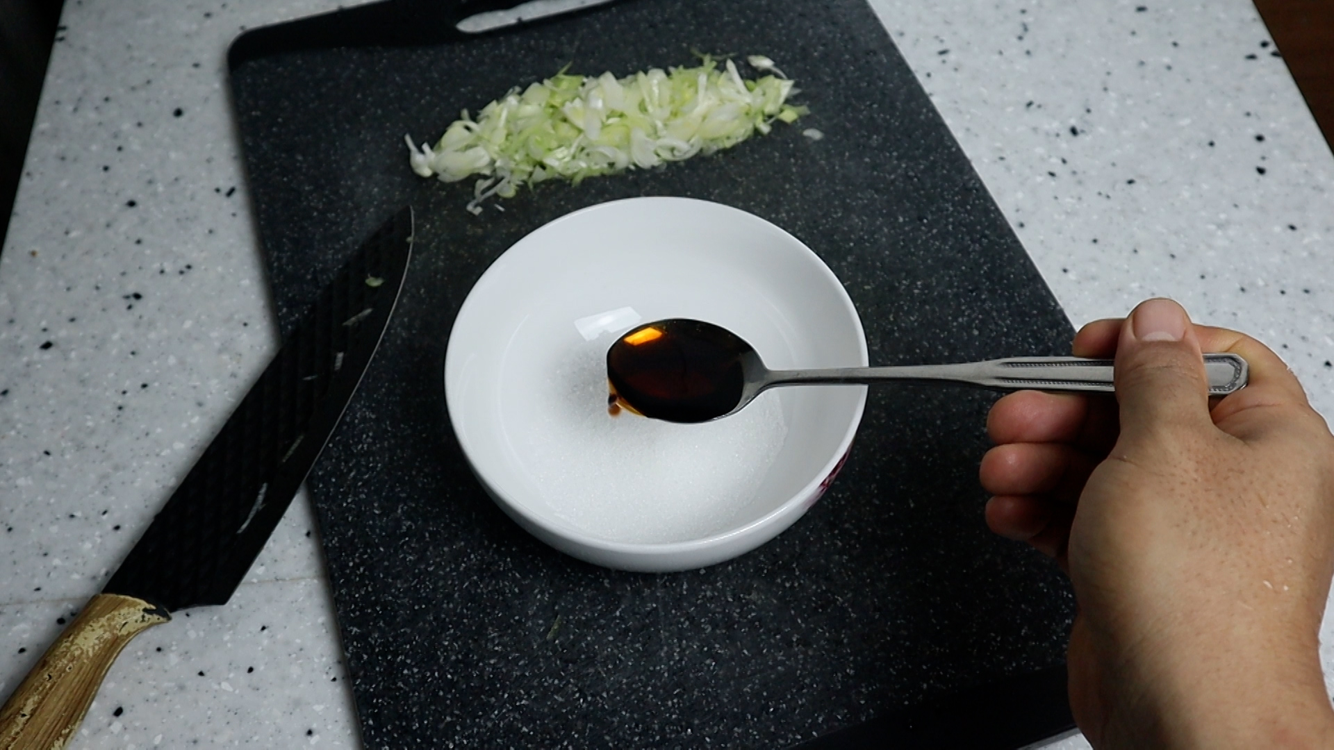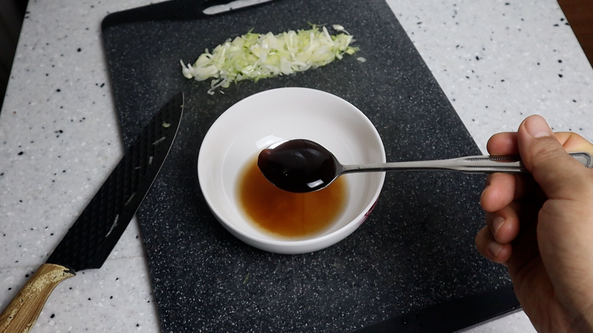 1. 대파는 흰대 위주로 얇게 썰어서 가볍게 2~3번만 다져주세요. 다져서 숟가락에 올리면 대략 5~6큰술이 나오는 양입니다.