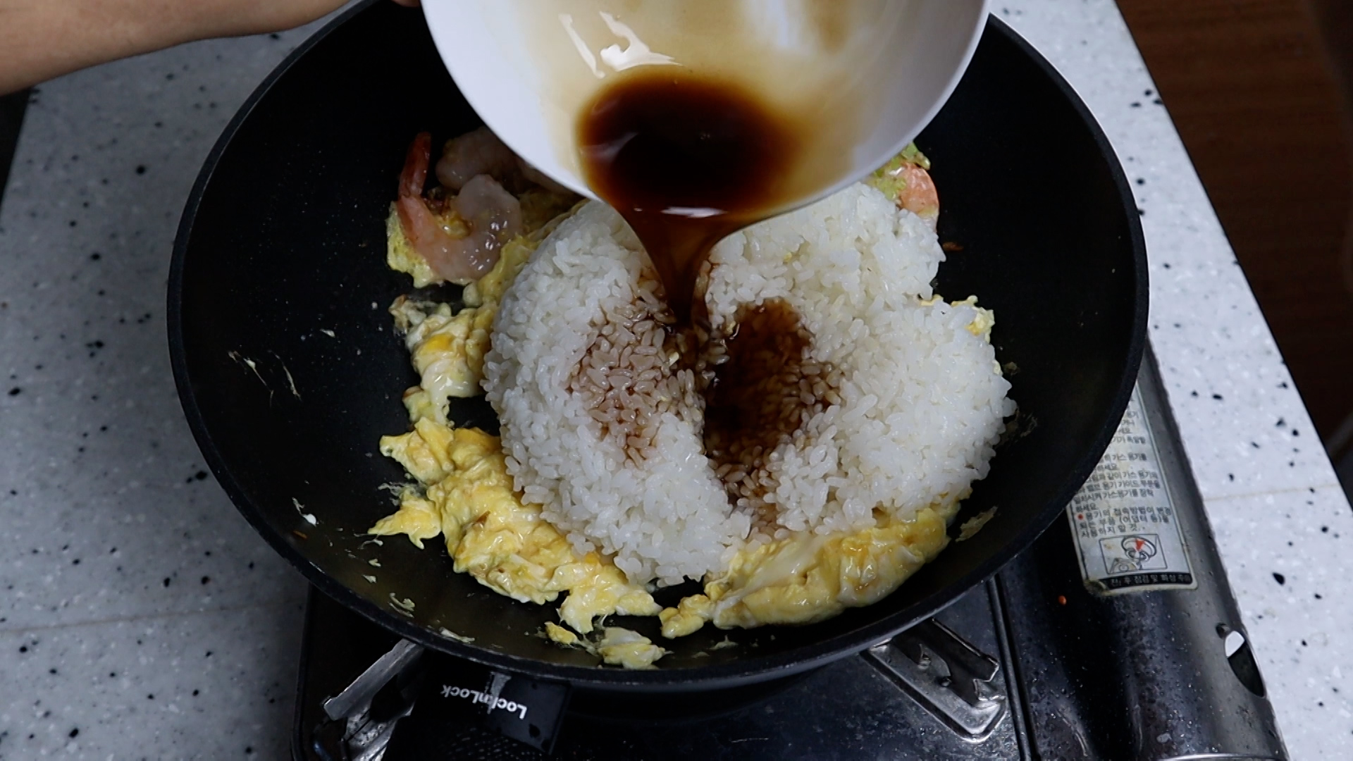 15. 계란이 80% 정도 익었을때 밥 2공기를 넣고 양념을 전부 부어주세요.