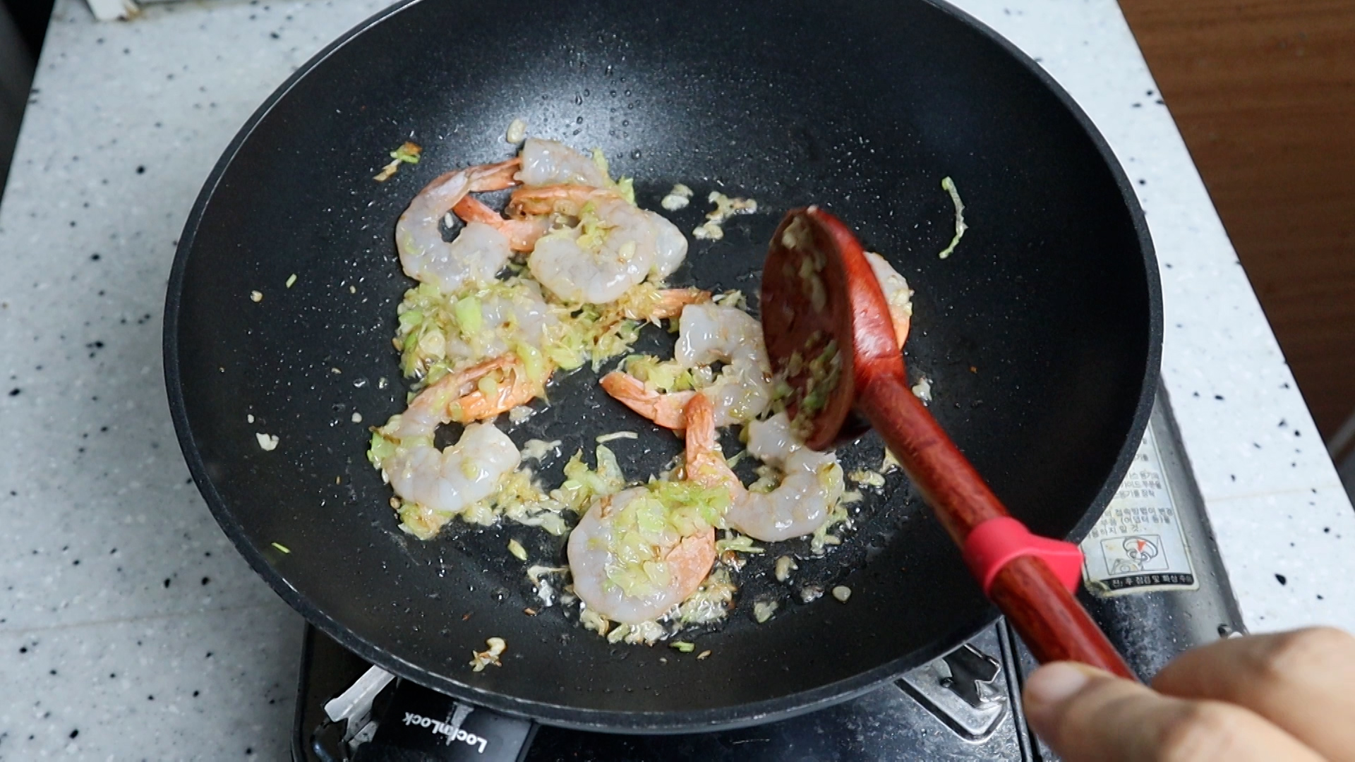 13. 새우를 넣고 불을 중불로 올리고 1분 정도를 볶아주세요. 새우는 꼭 한번 해동한 상태로 물에 가볍게 세척해서 사용해주세요.