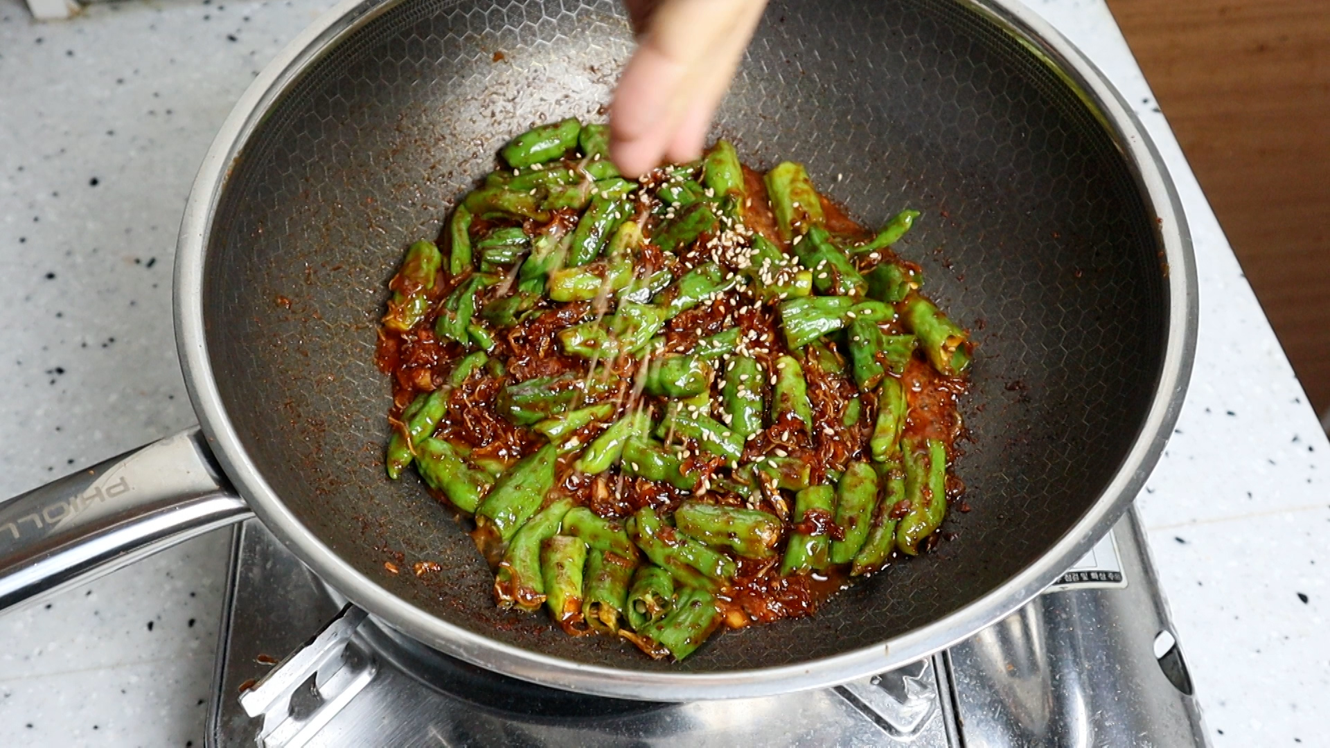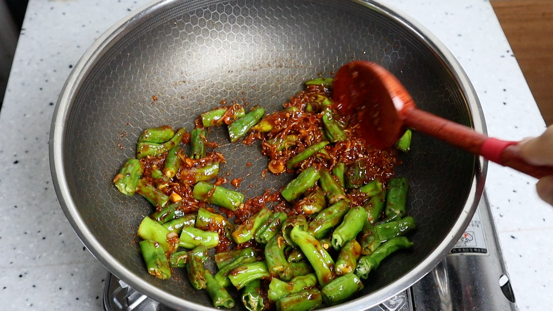 22. 꽈리고추를 넣고 중불 유지하고 1분 정도 볶아주세요. 너무 오래 볶으면 꽈리고추가 질겨지니 오래볶지않게 주의하세요.