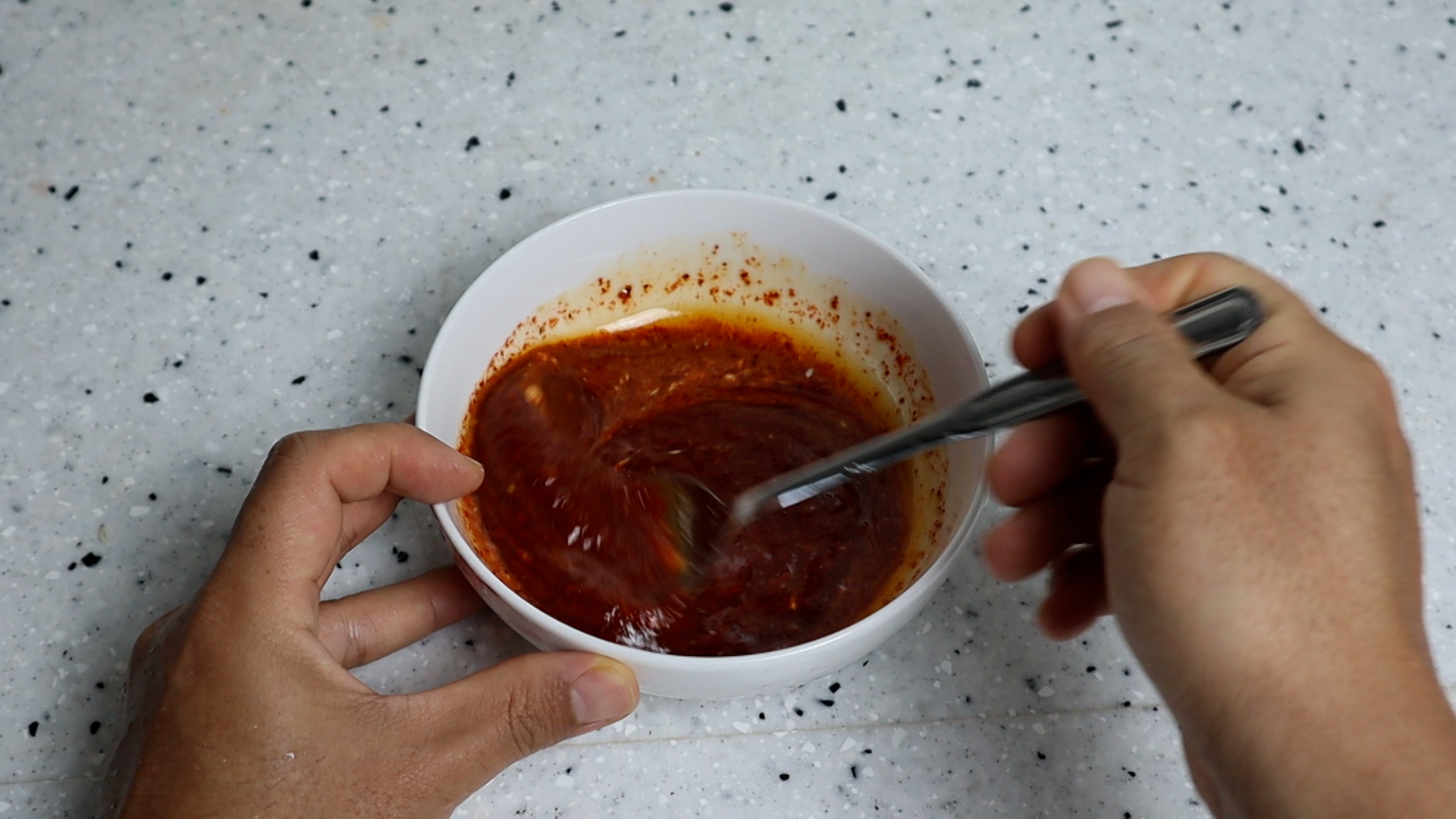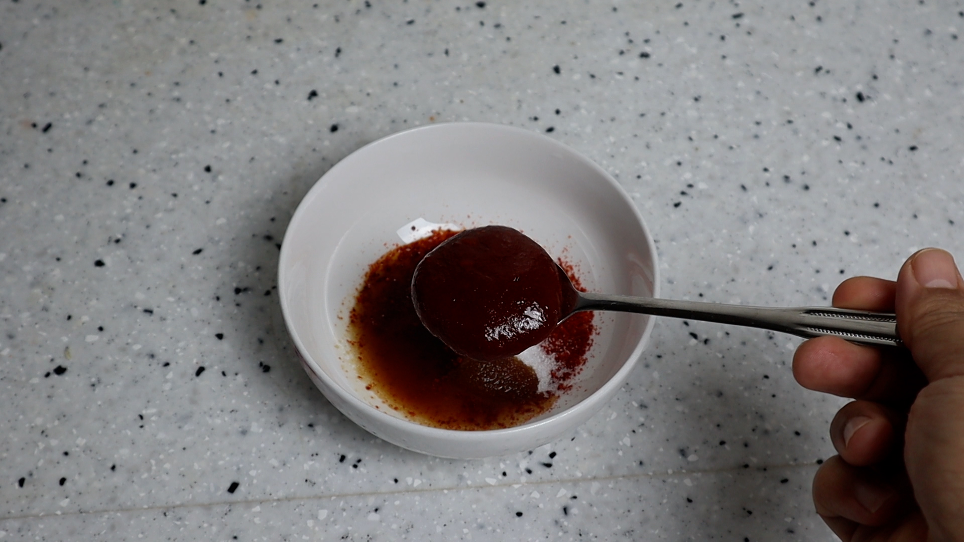 5. 고추장을 적당히 퍼서 1스푼 넣어주세요. 너무 고봉으로 쌓으면 40~50g 도 담기니 적당히 퍼주세요!