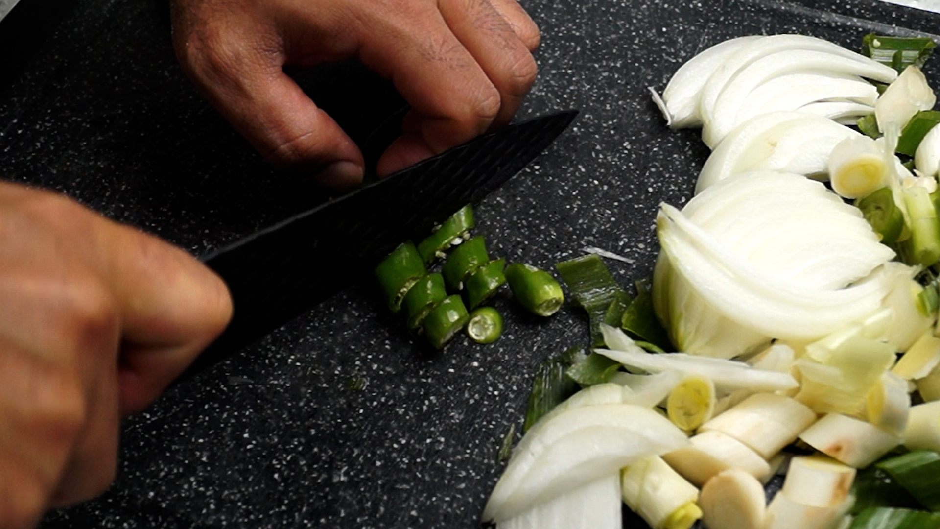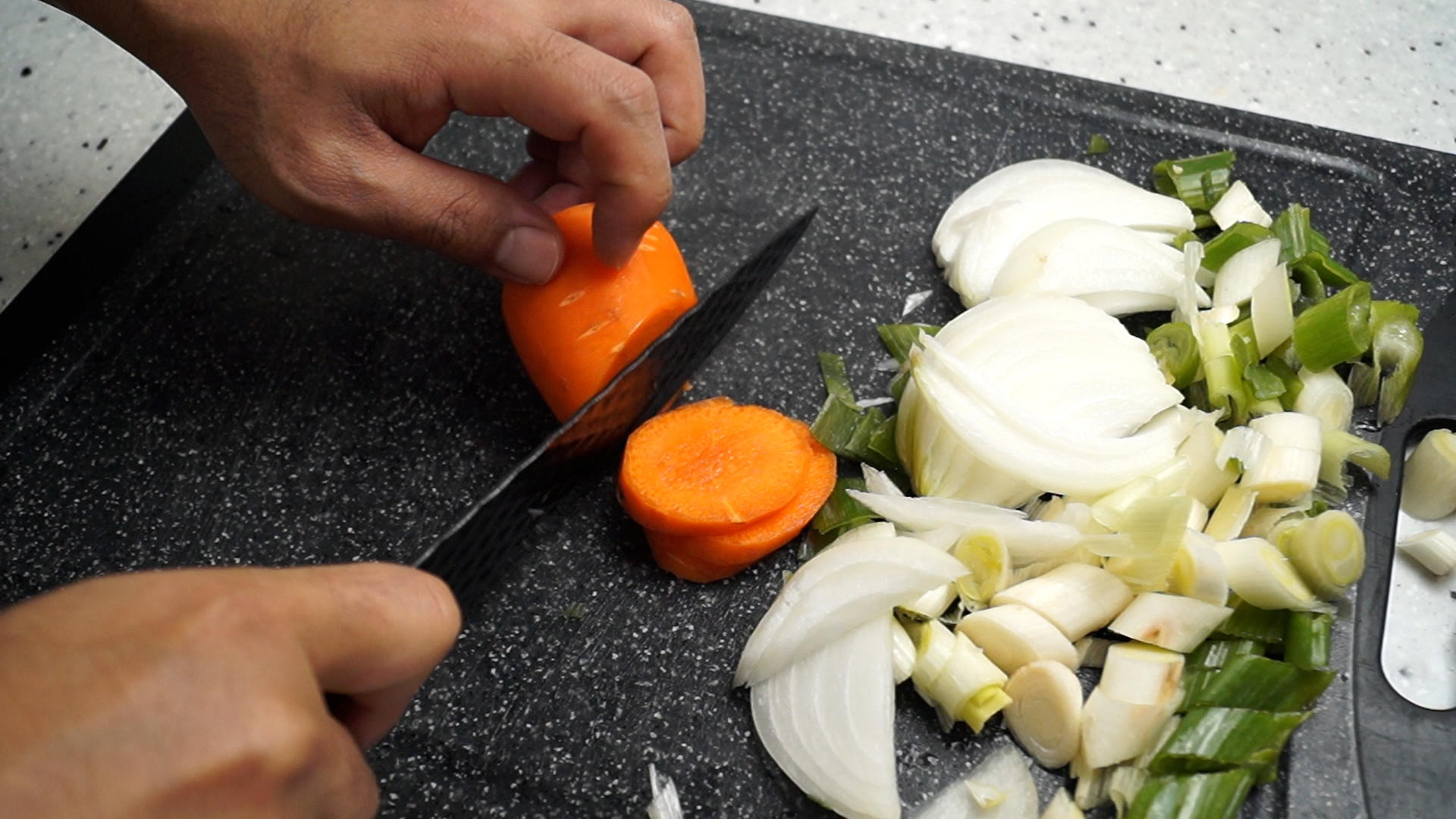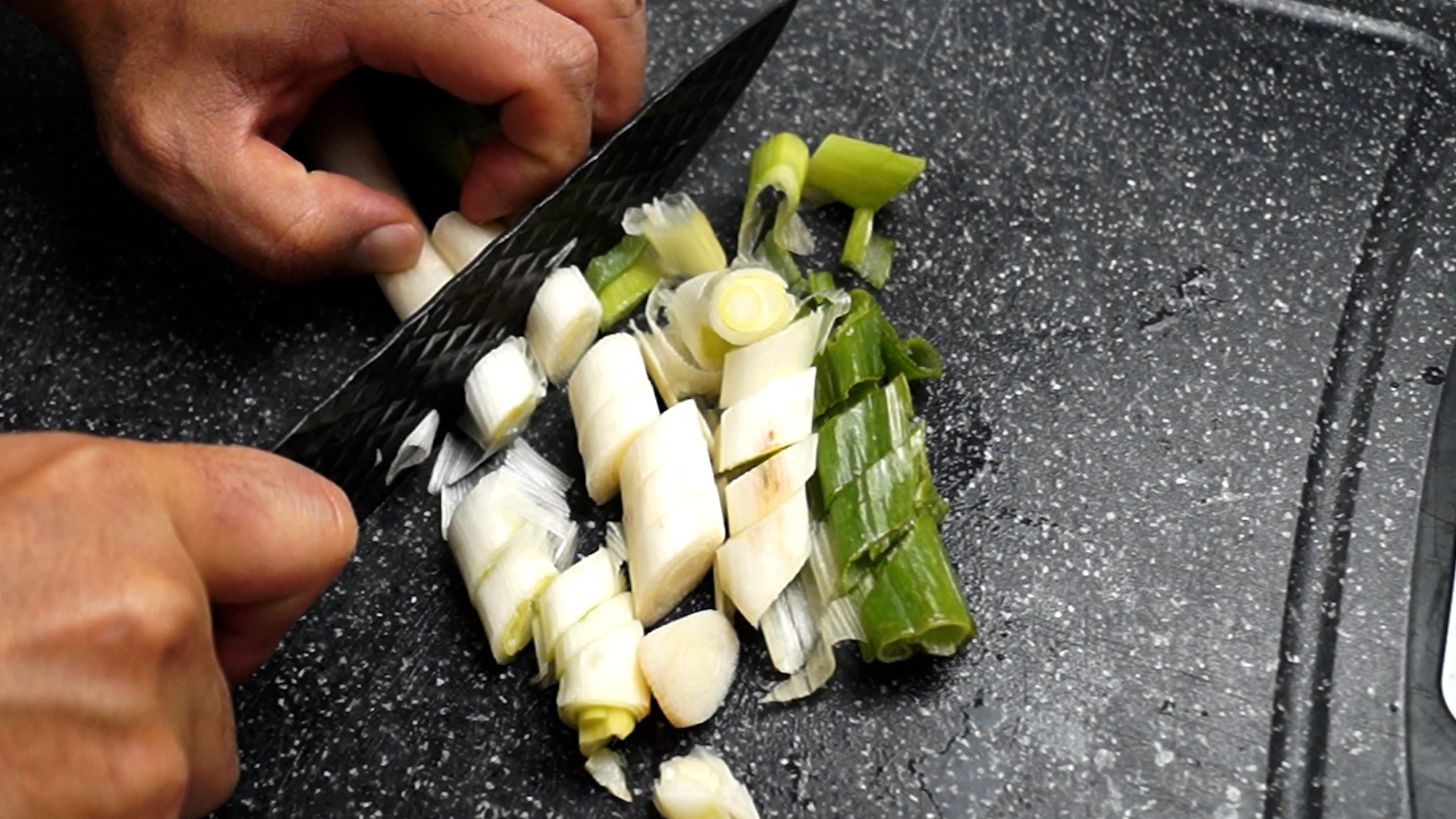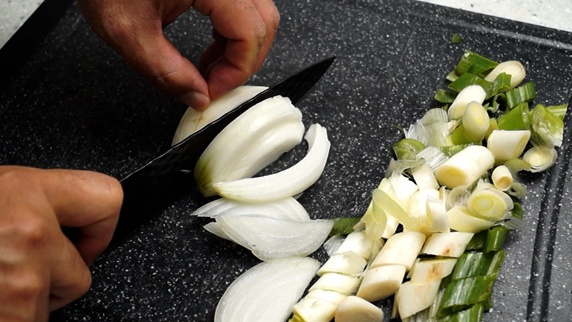 12. 대파는 큼직큼직 썰어주시고 양파 반개는 적당한 두께로 채를 썰어주세요.