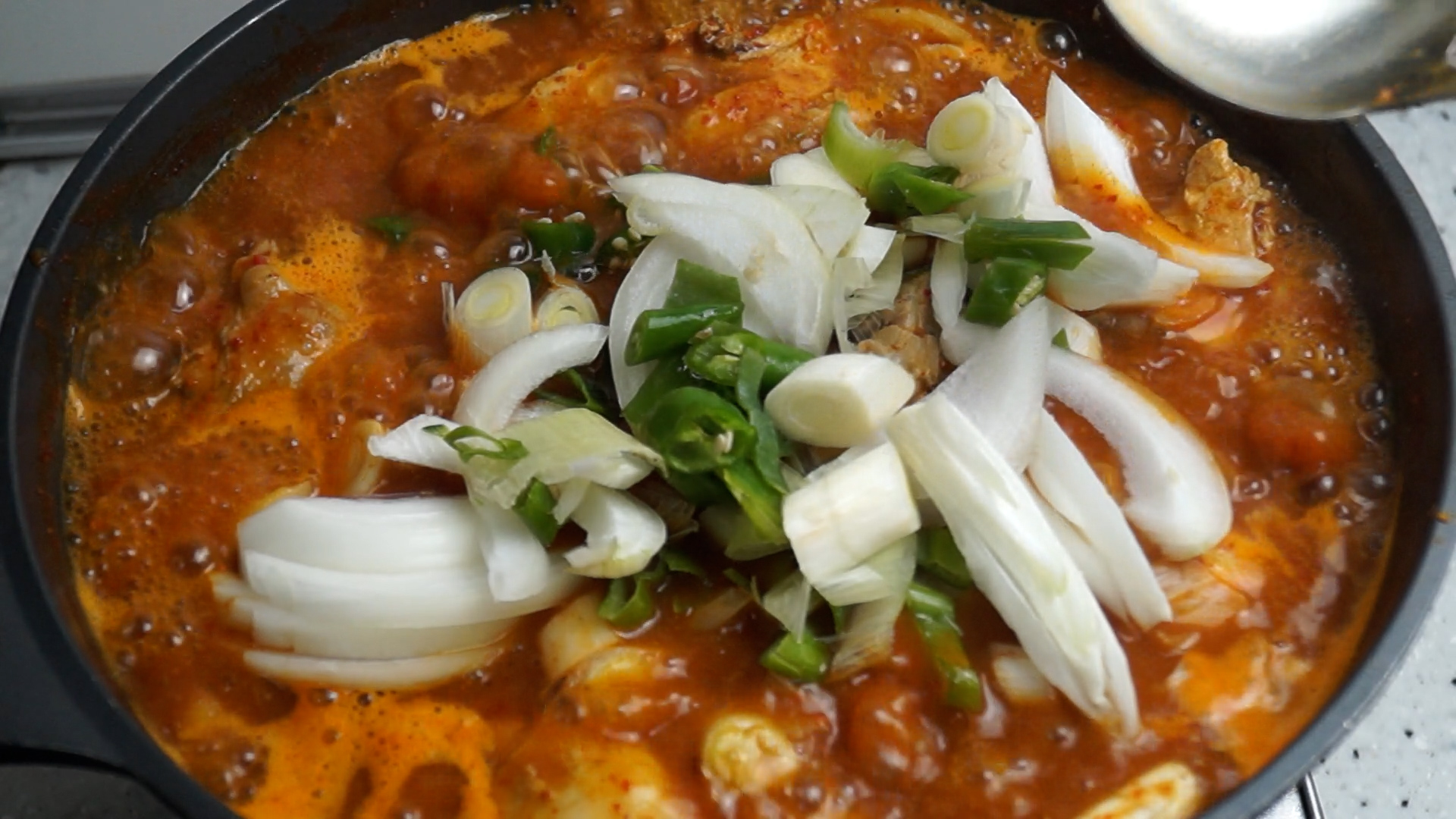 20. 맛을 보고 간이 딱 좋다!! 싶을때 대파 양파 땡초를 던져넣고 5분 정도를 더 끓여주세요.