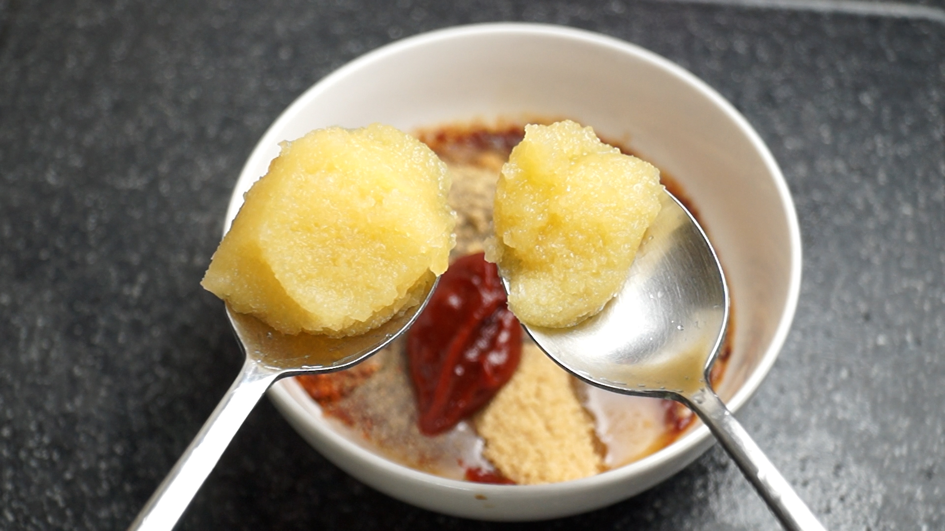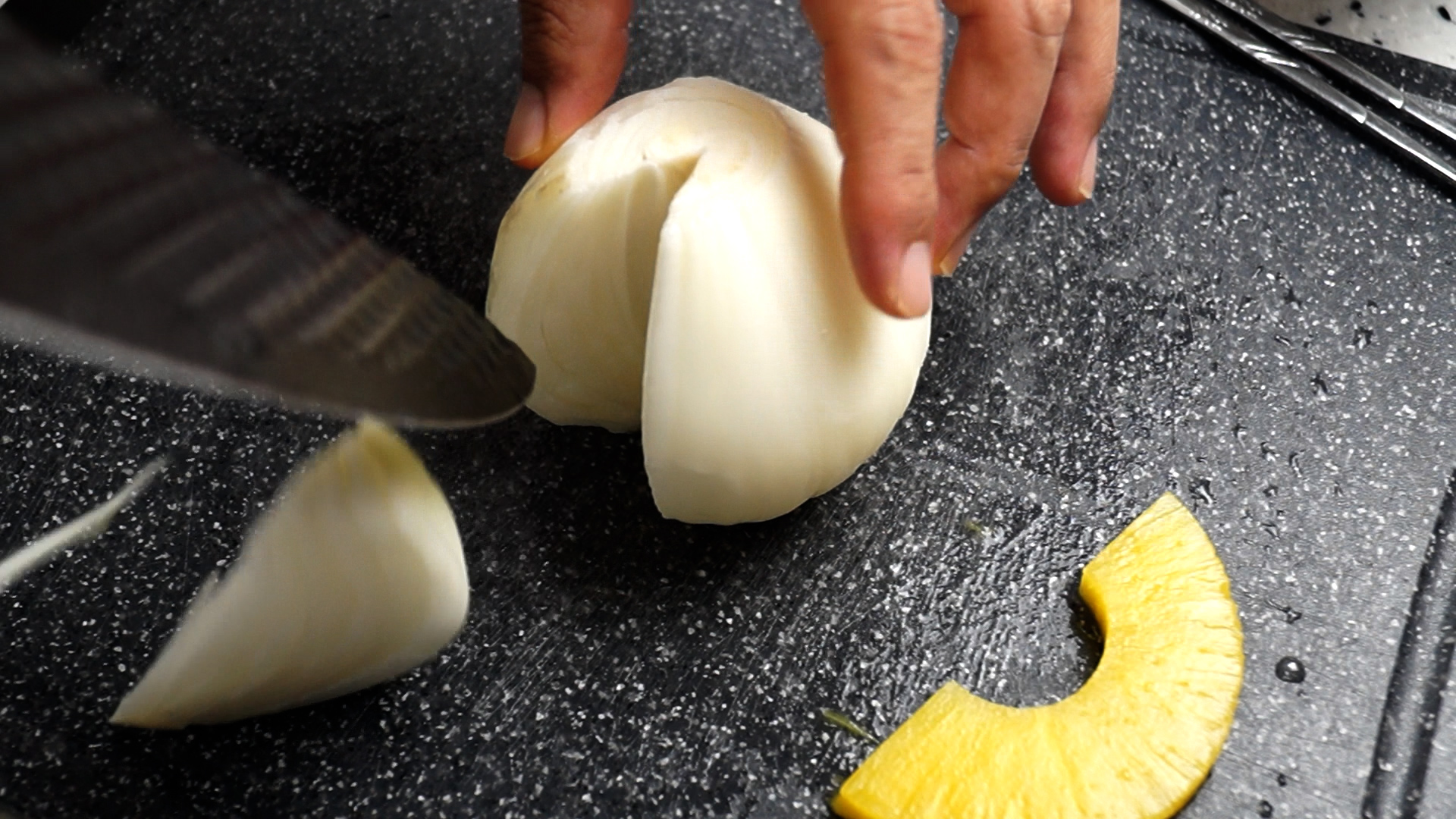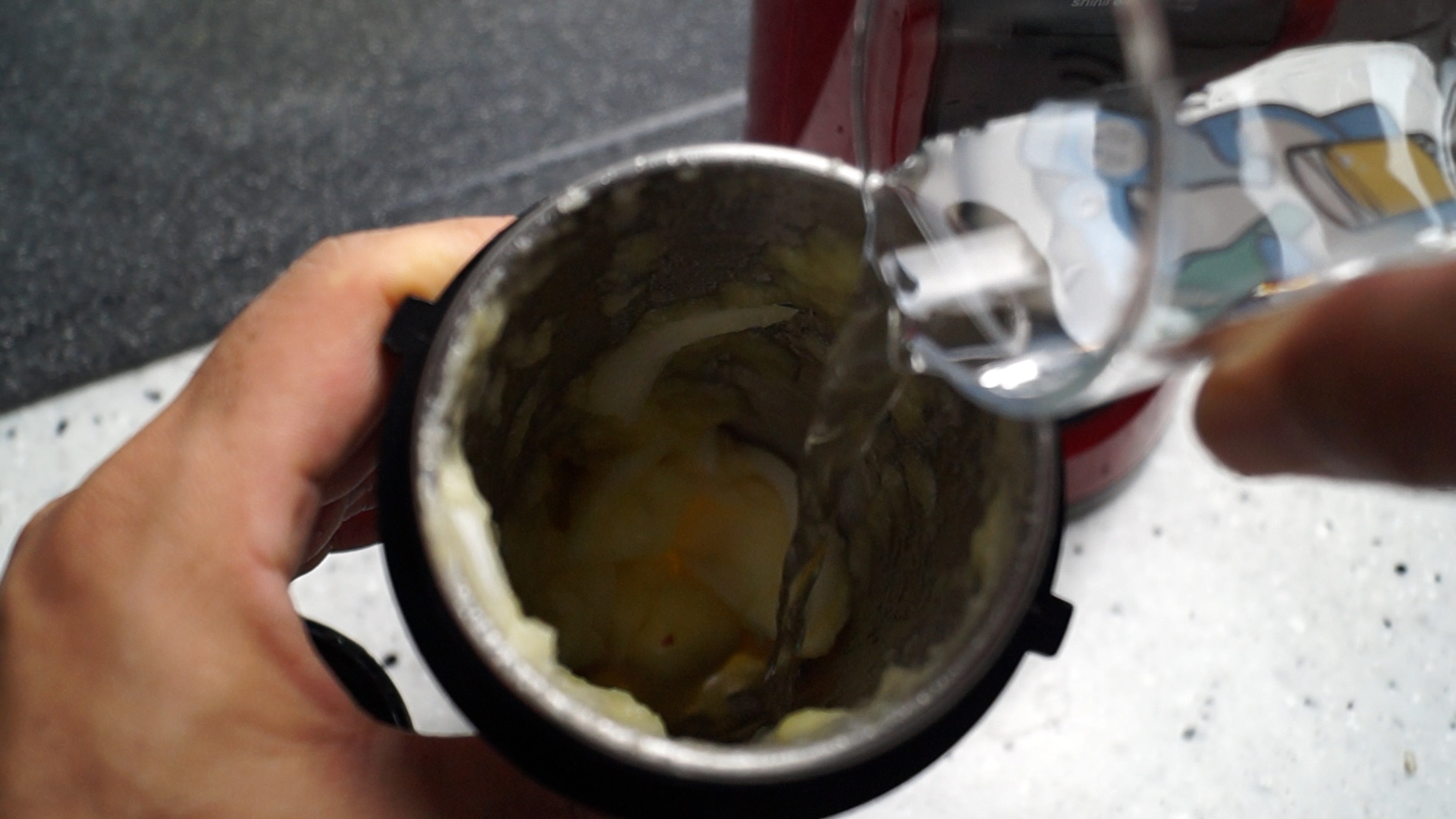 3. 믹서기 통에 양파 사과 파인애플을 넣고 갈아줄건데 아마 양이 적어서 잘 안갈릴거에요. 그럴땐 물을 30~40cc 추가해서 믹서기를 살짝살짝 흔들어주면서 갈아주시면 잘 갈린답니다.