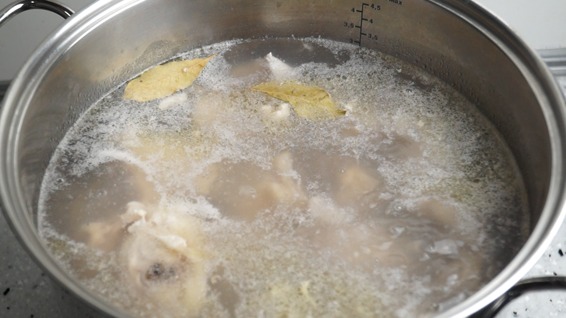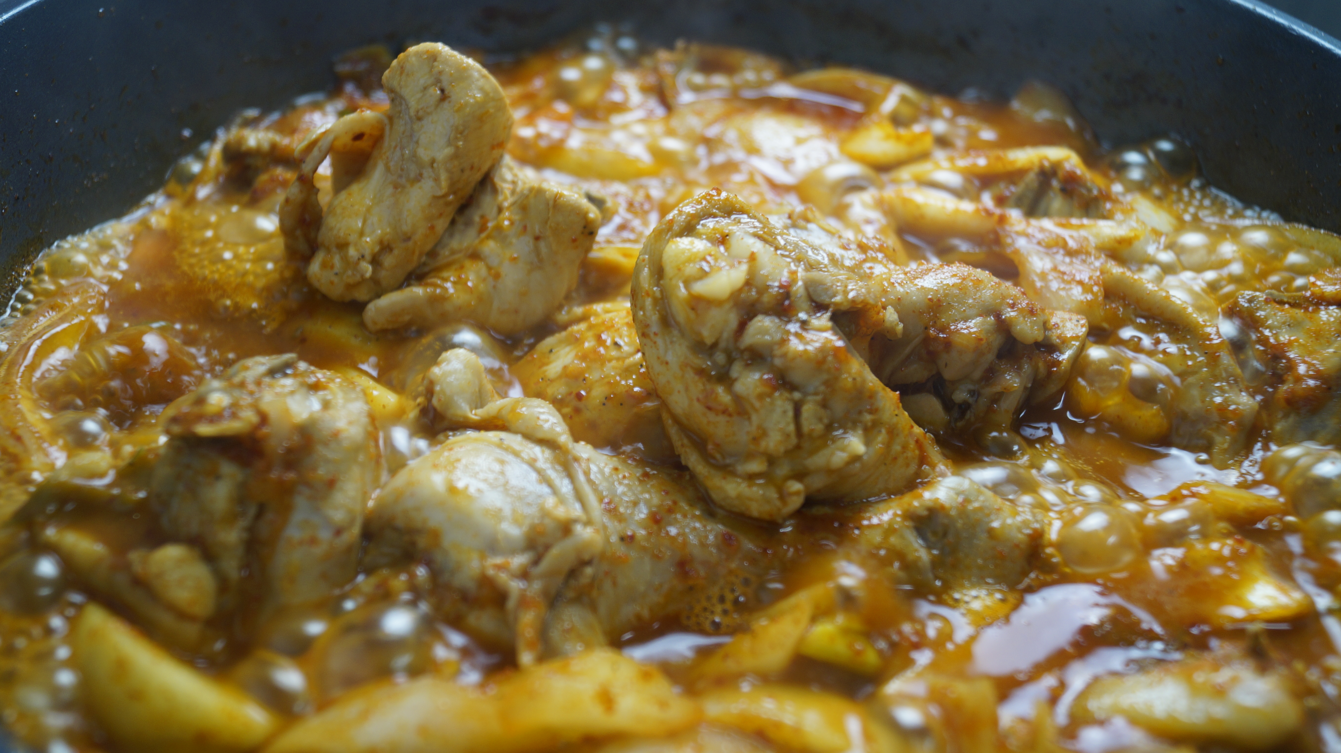 15. 물 2리터를 팔팔 끓여서 닭볶음탕용 절단닭을 넣어주세요. 냉동닭이면 월계수잎 2~3장 넣어서 잡내를 잡아주세요.