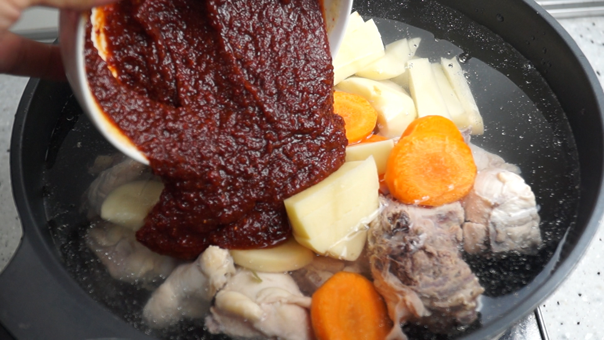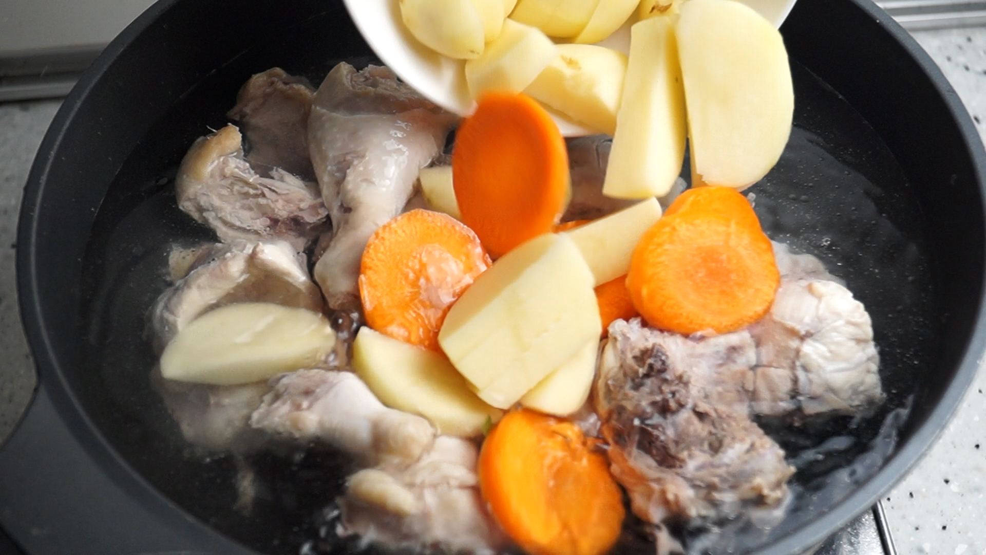 17. 큰냄비나 웍에 닭을 넣고 물 1.5리터를 부은 다음 당근과 감자를 넣어주세요.