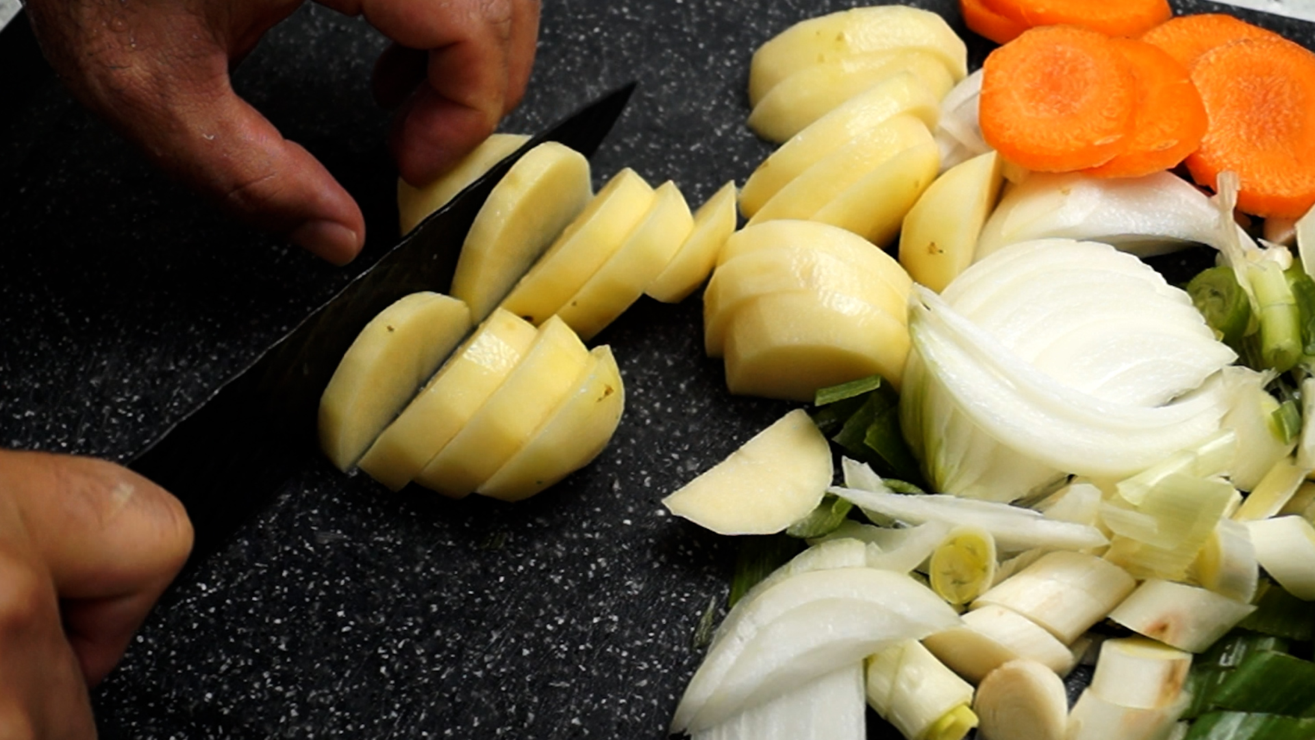 13. 당근은 1cm 두께로 4~5조각을 썰어주고 감자는 2cm 두께로 썰고 크기는 기호에 맞게 썰어주세요. 당근 좋아하시면 2~3배 넣으셔도 괜찮고 감자는 너무 얇게 썰면 끓이다 다 부서져 버리니 주의하세요.