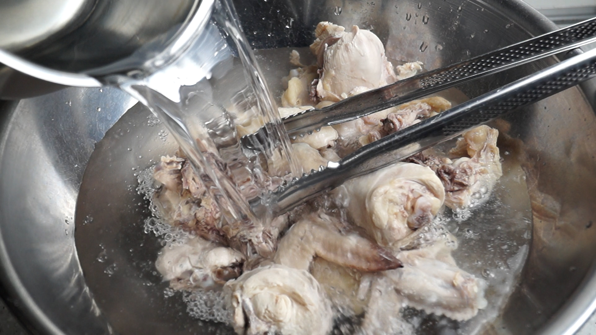16. 물이 다시 끓어오르면 생닭은 3분 냉동닭은 4분 정도를 끓인 다음 찬물에 한번 식혀주세요. 찬물에 부으면 살이 쫄깃해 진다는 말도 있지만 저 같은 경우는 찬물을 부으면 틈틈히 숨어 있던 기름이 굳어 떠올라서 조금더 담백한 닭도리탕이 되기에 찬물에 담근답니다.