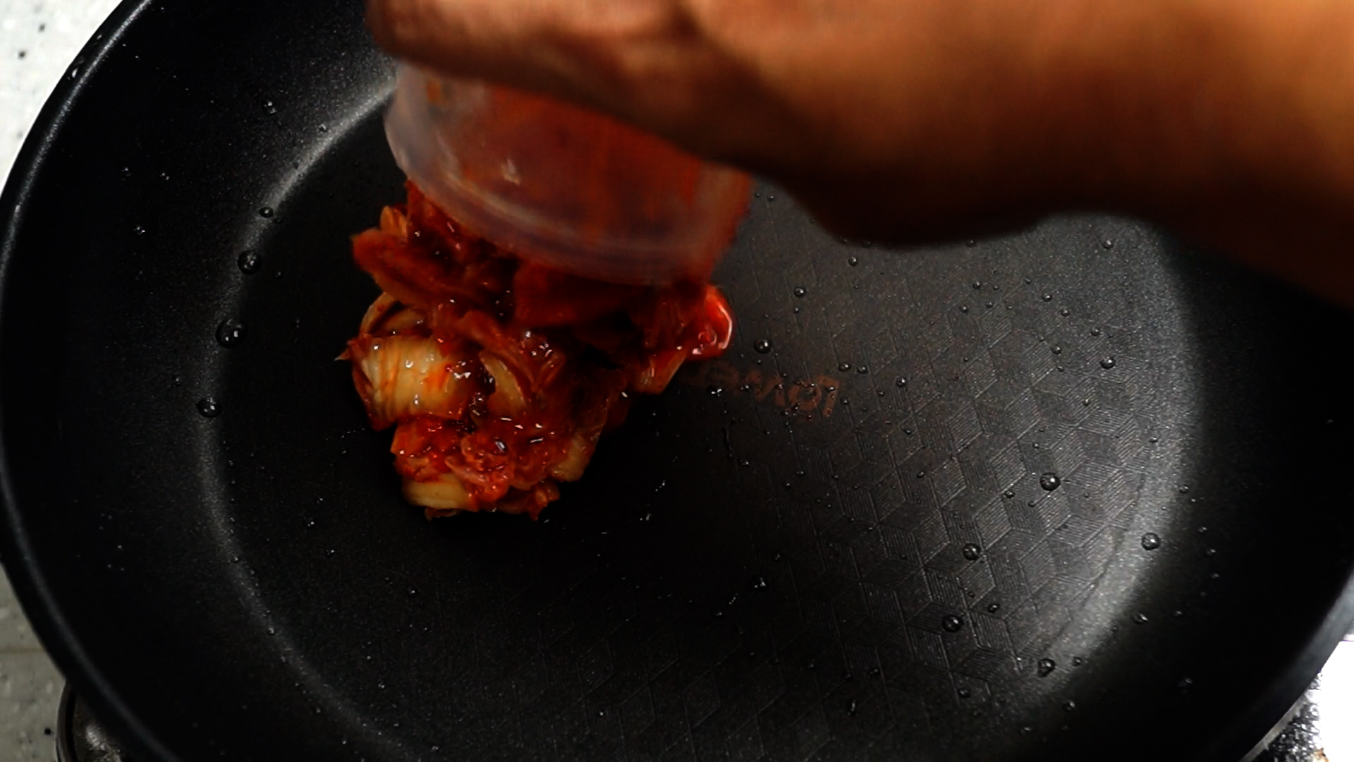 3. 적당히 익은 김치를 가위로 먹기 좋게 잘라 200g ( 200cc 컵에 1.2컵)을 부어주세요.