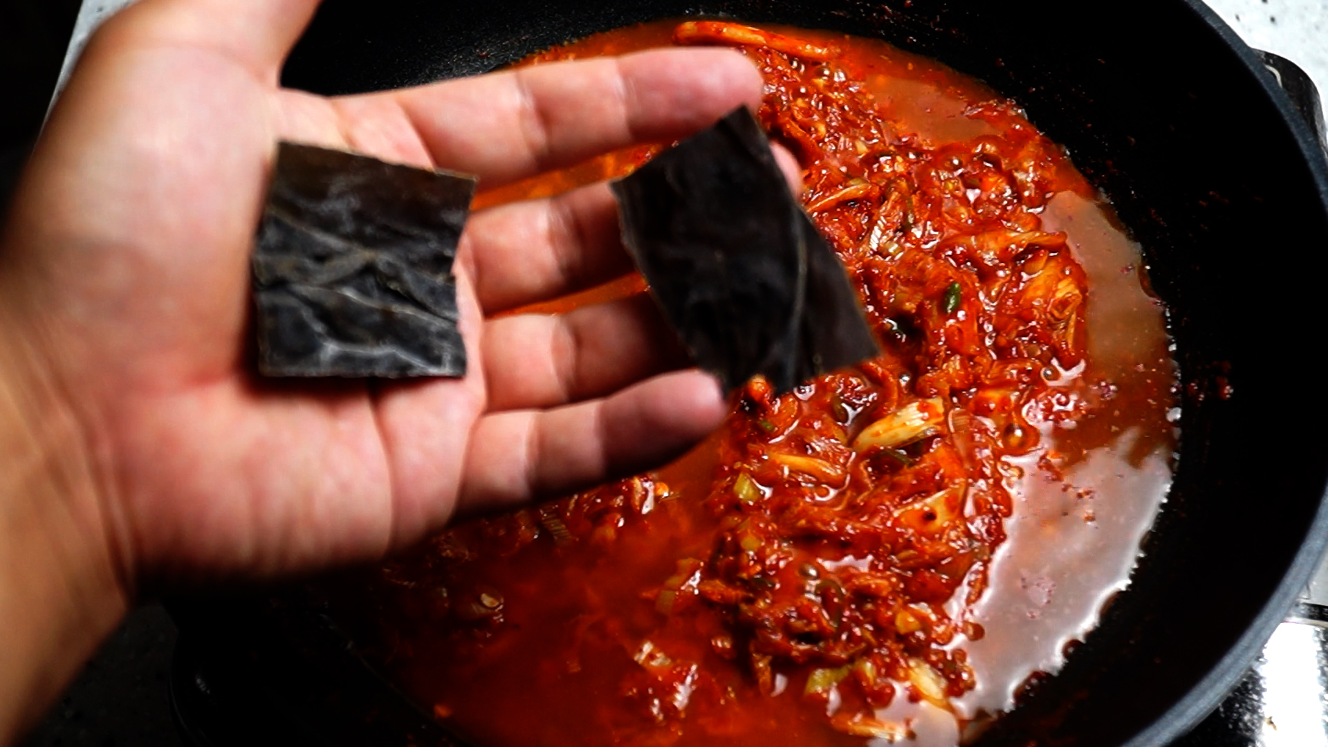 11. 다시마를 오동통이나 너구리에 들어 있는 크기 2개 (가로세로 3~4cm크기) 를 넣어주세요