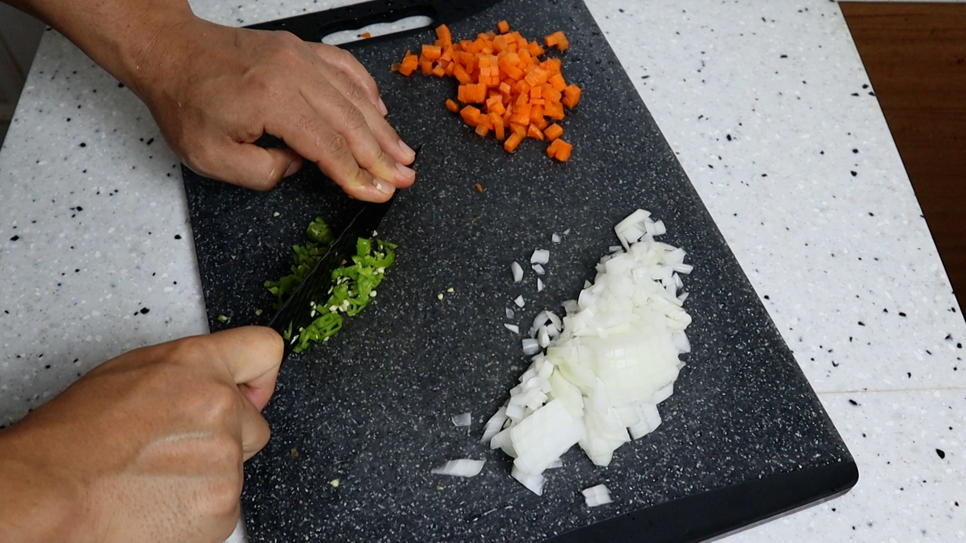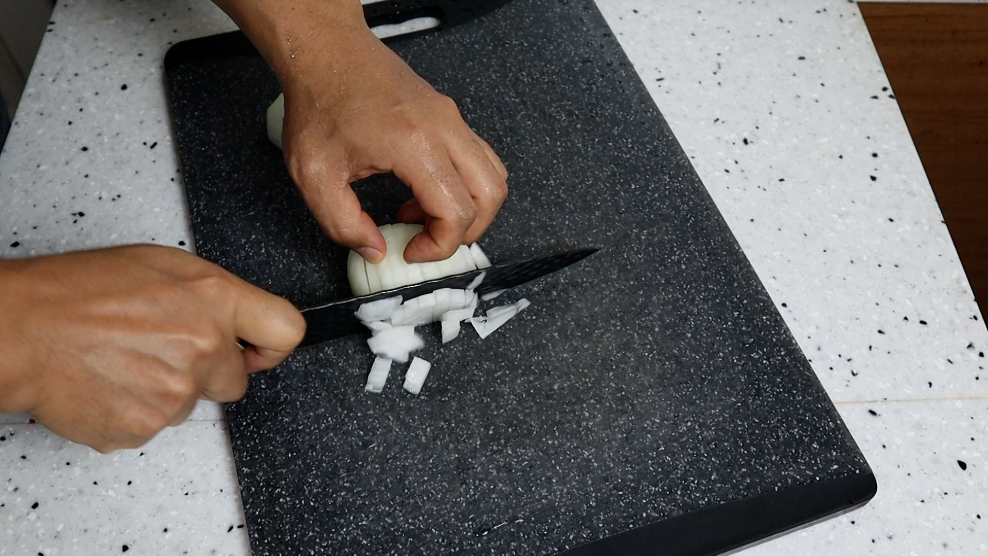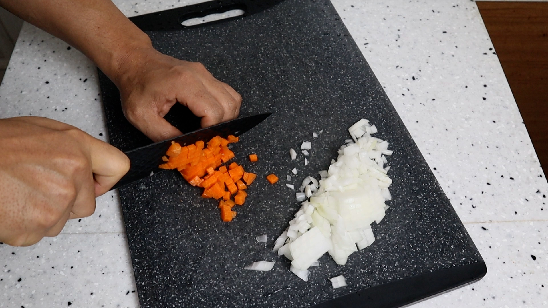 11. 양파는 대략 0.5cm 정도로 깍둑을 썰어주세요. 양파와 파프리카를 섞어주거나 파프리카를 대신 사용하셔도 좋아요~
