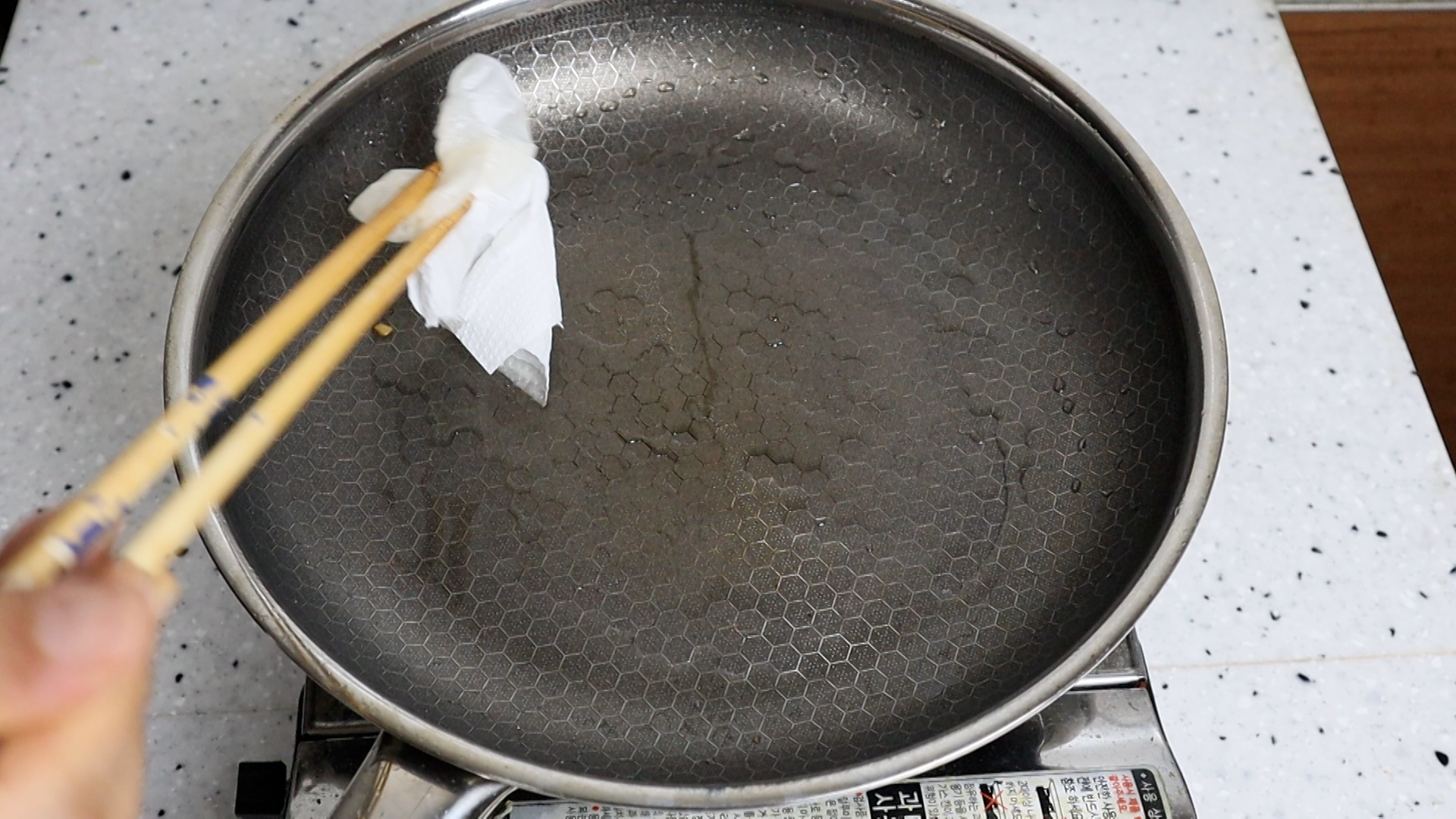 15. 만두를 따로 덜어낸 다음 기름을 대략 2스푼 10g 정도가 남게 닦아내주세요.