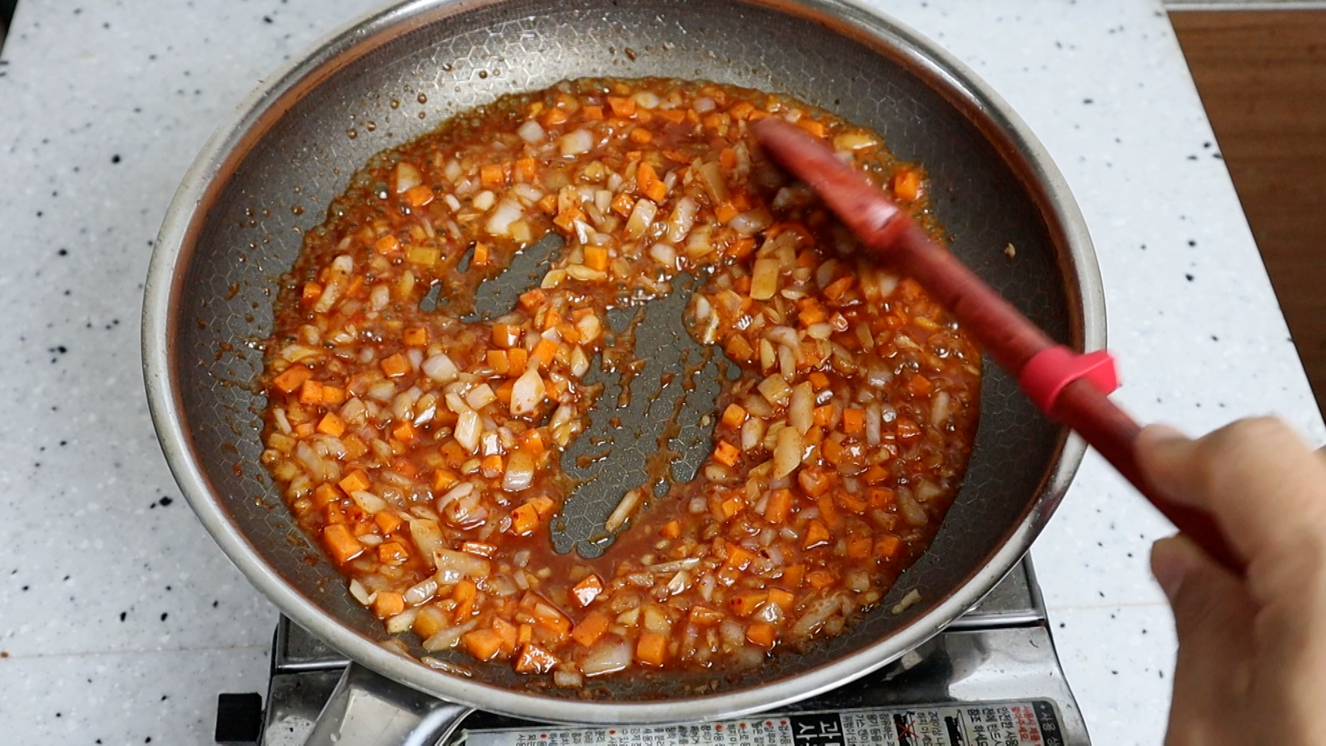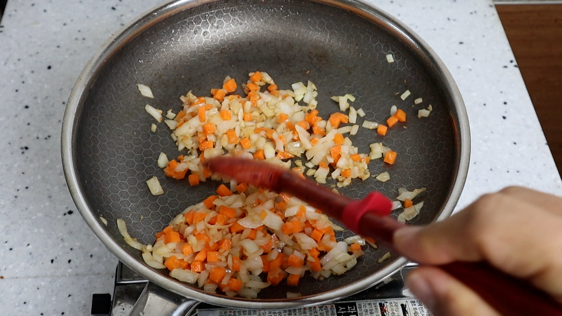 18. 당근넣고 중불 유지하고 1분 볶아주세요.
