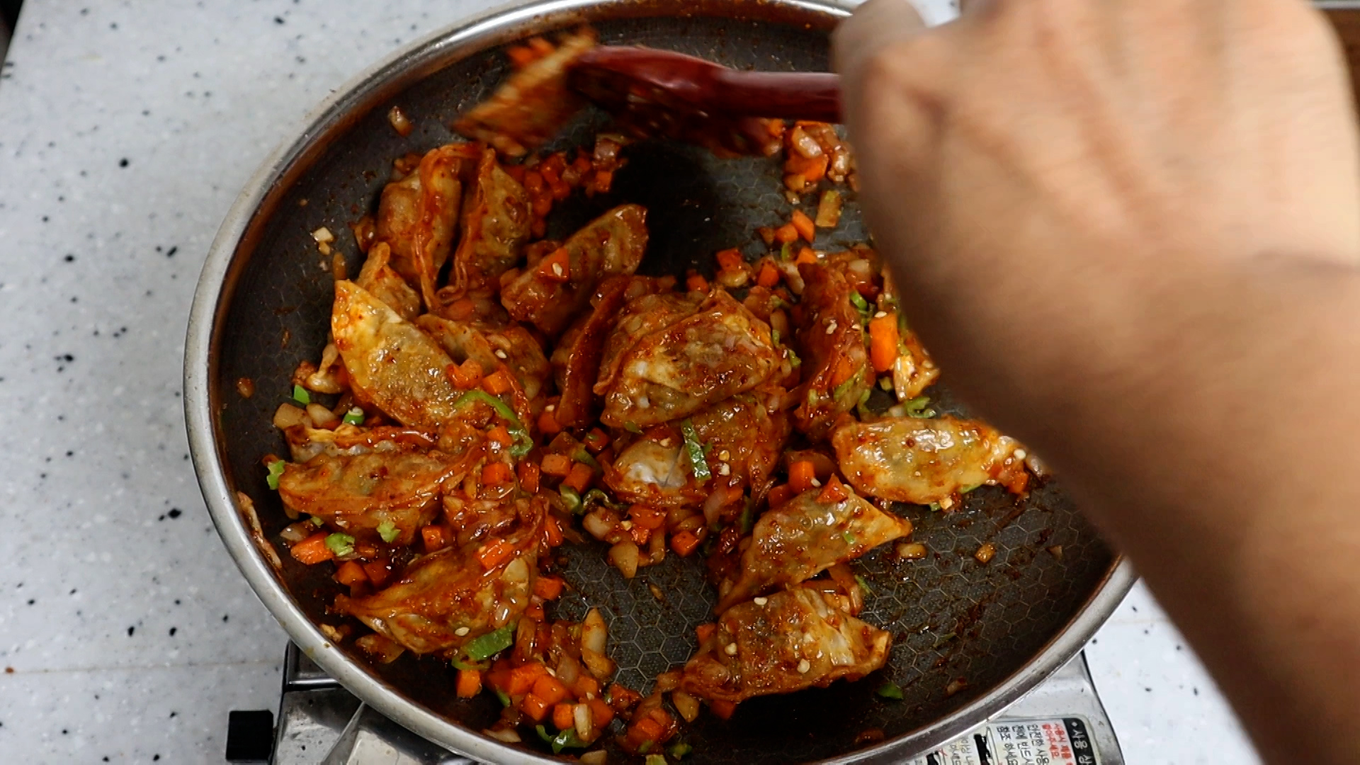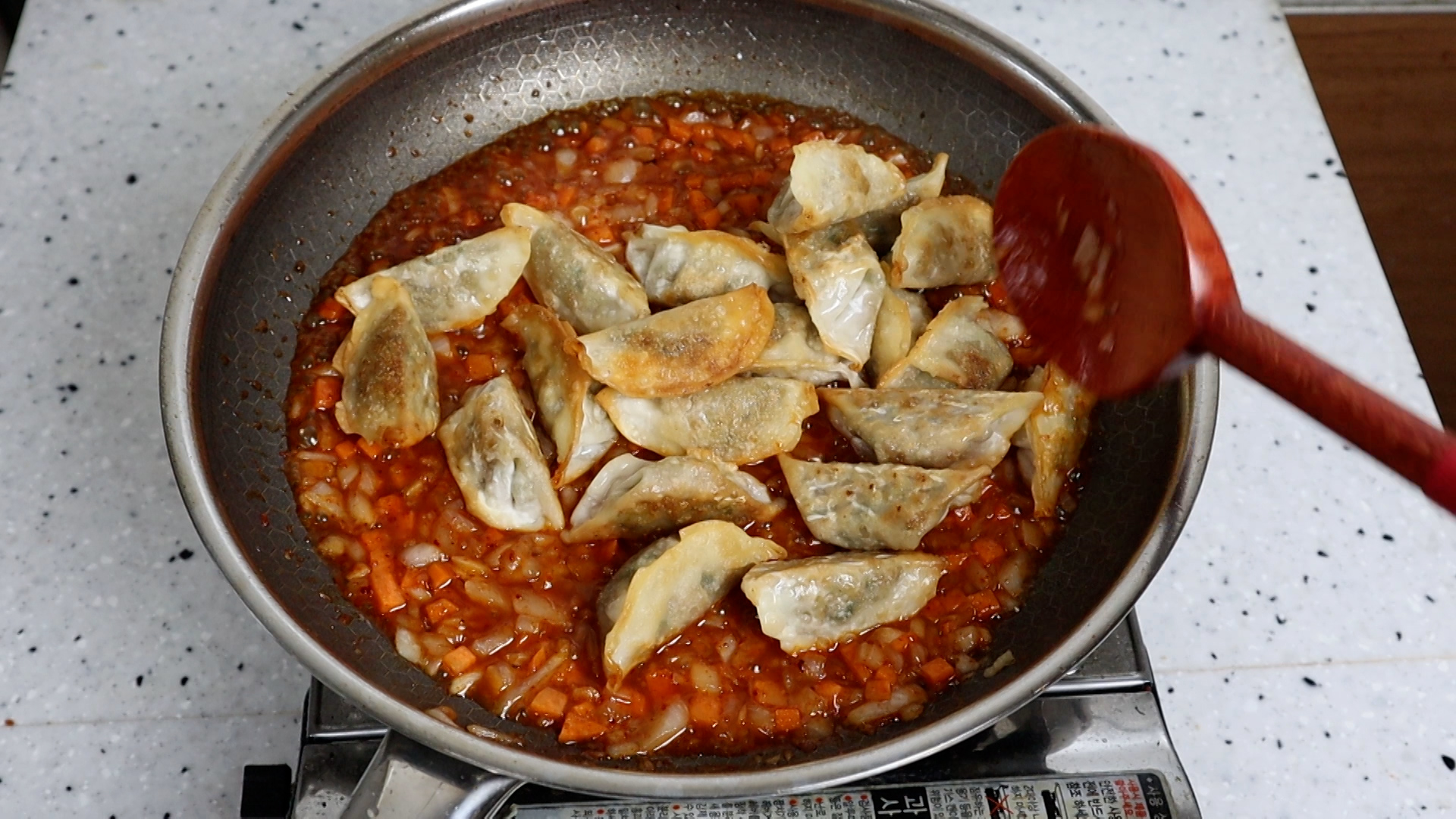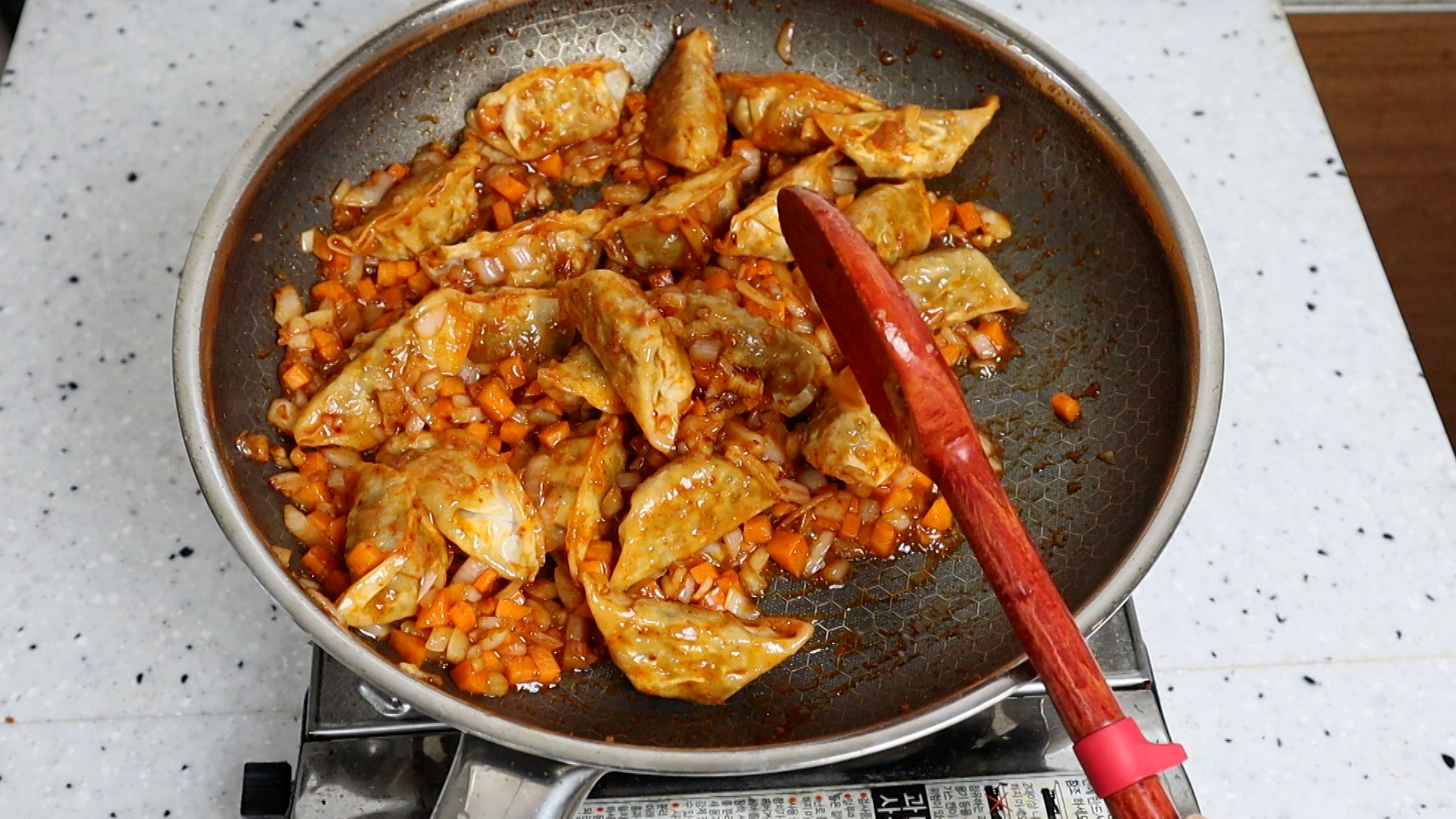 21. 만두넣고 강불에 30~40초를 볶아 줬더니 끼얹을때보다 양념이 고루 베이고 쫀득~해져서 바삭한 만두와 또다른 매력이 있더라고요