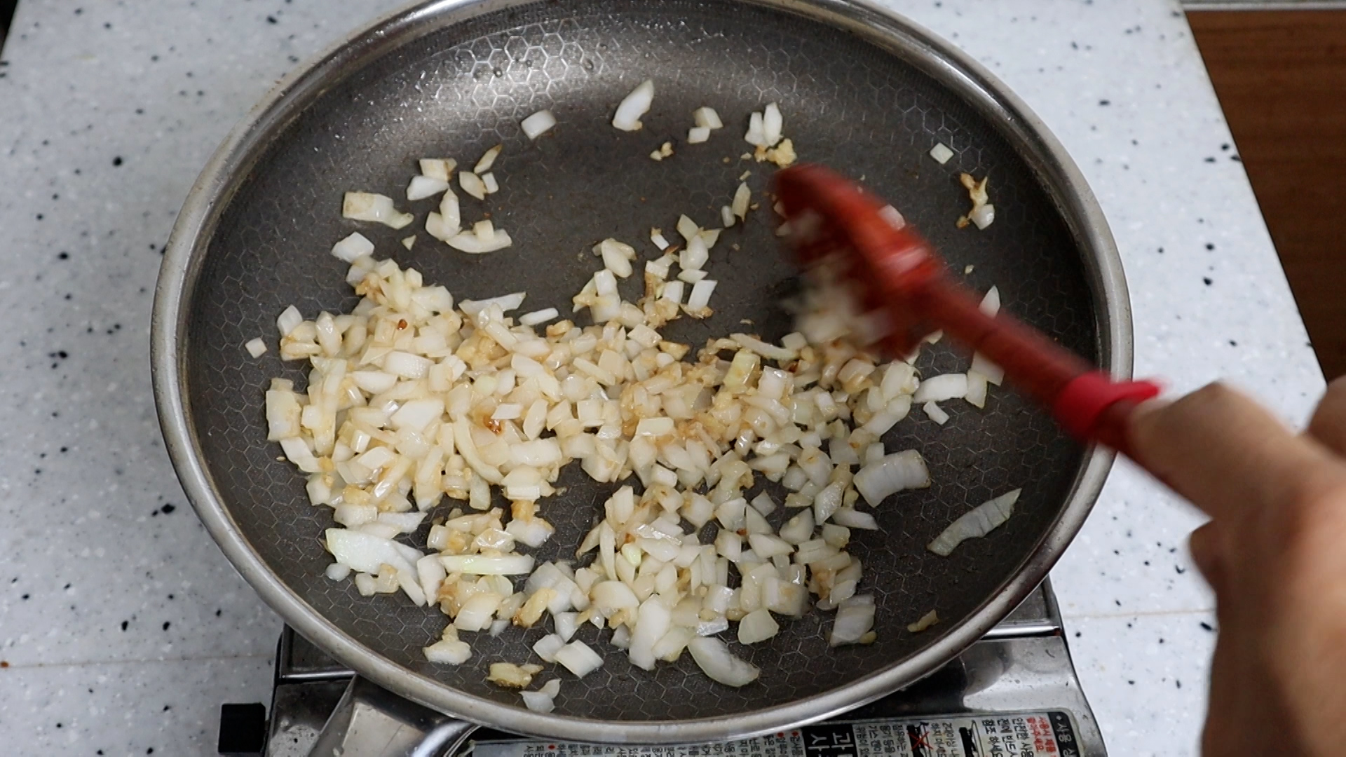 17. 양파를 넣고 중불에 1분간 볶아주세요.